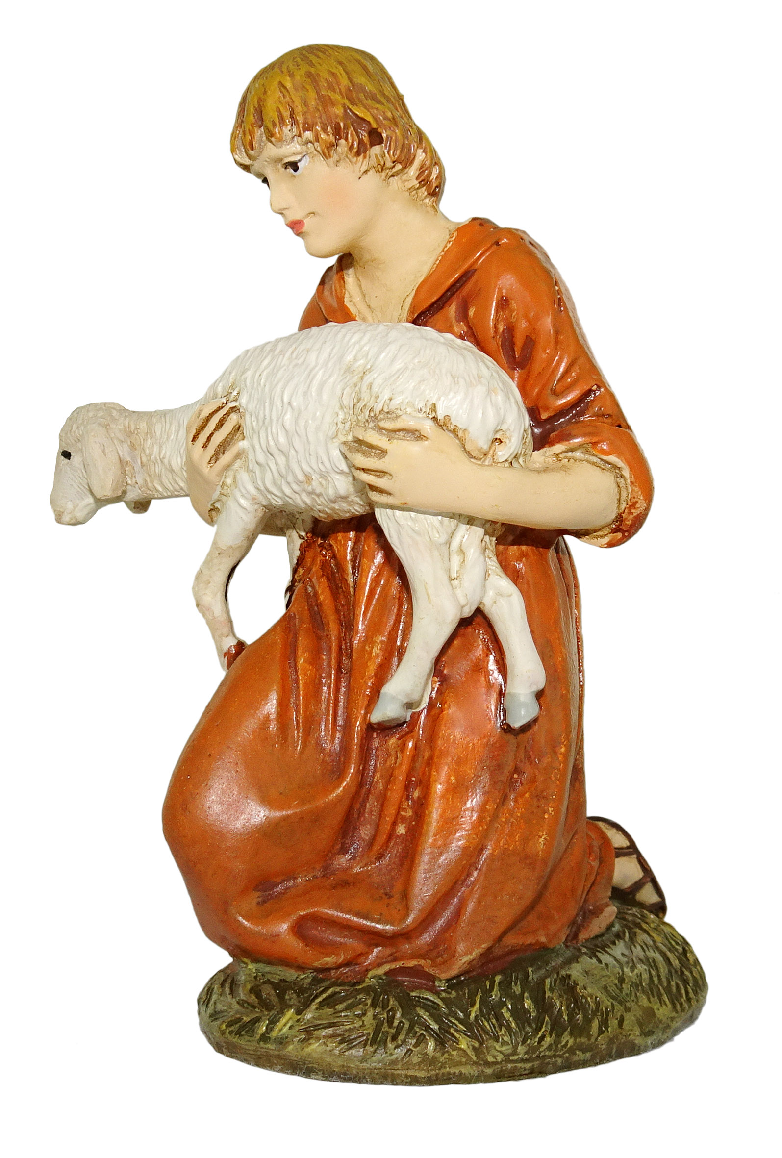 Ferrari & Arrighetti Statuine Presepe, Statuina Pastore in Ginocchio con Agnello per Presepe da 12 Cm, Statuina Pastore per Presepe Classico / Tradizionale Stile Martino Landi, Resina Dipinta a Mano