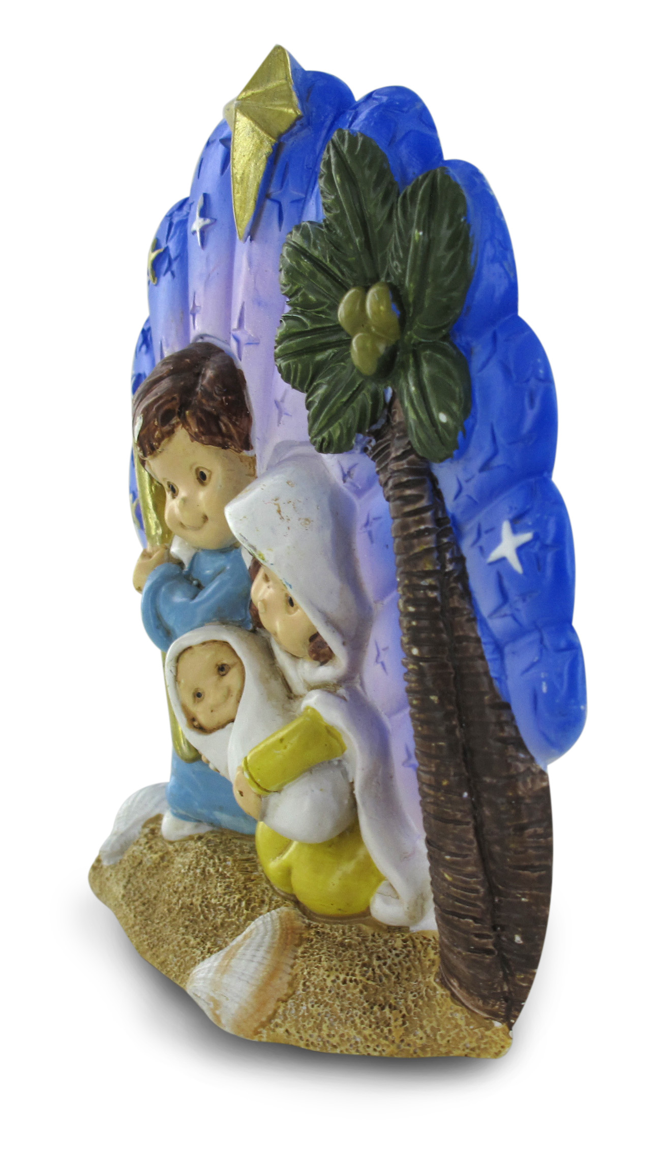 La natività – simbolo della tradizione del Natale - a forma di conchiglia ci presenta Giuseppe e Maria con Gesù in braccio, i colori sono vivaci ed il materiale è resina.