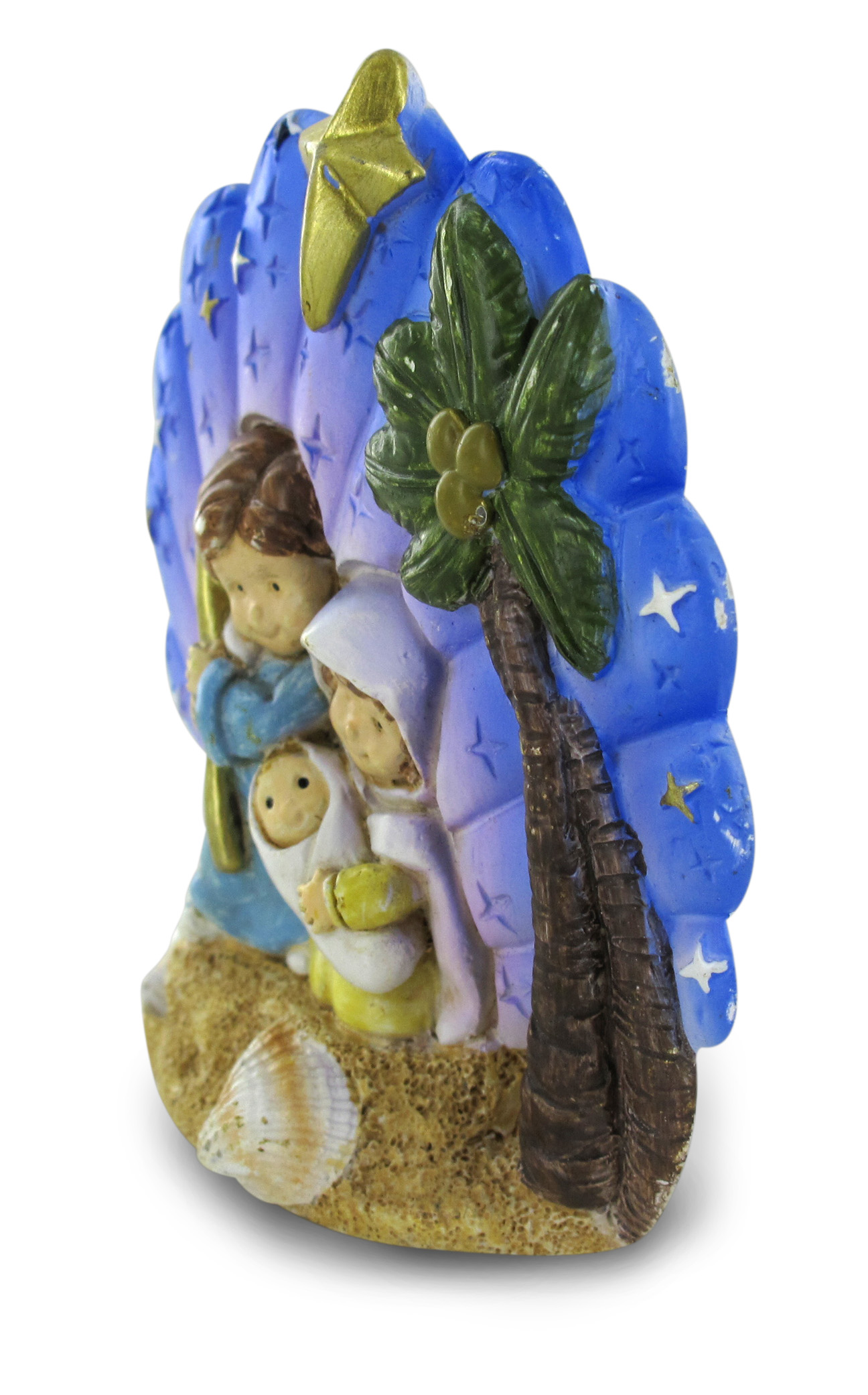 La natività – simbolo della tradizione del Natale - a forma di conchiglia ci presenta Giuseppe e Maria con Gesù in braccio, i colori sono vivaci ed il materiale è resina.