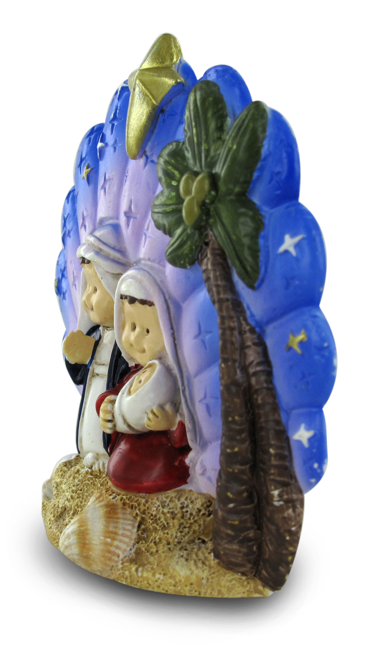 La natività – simbolo della tradizione del Natale - a forma di conchiglia ci presenta Giuseppe e Maria con Gesù in braccio, i colori sono vivaci ed il materiale è resina.