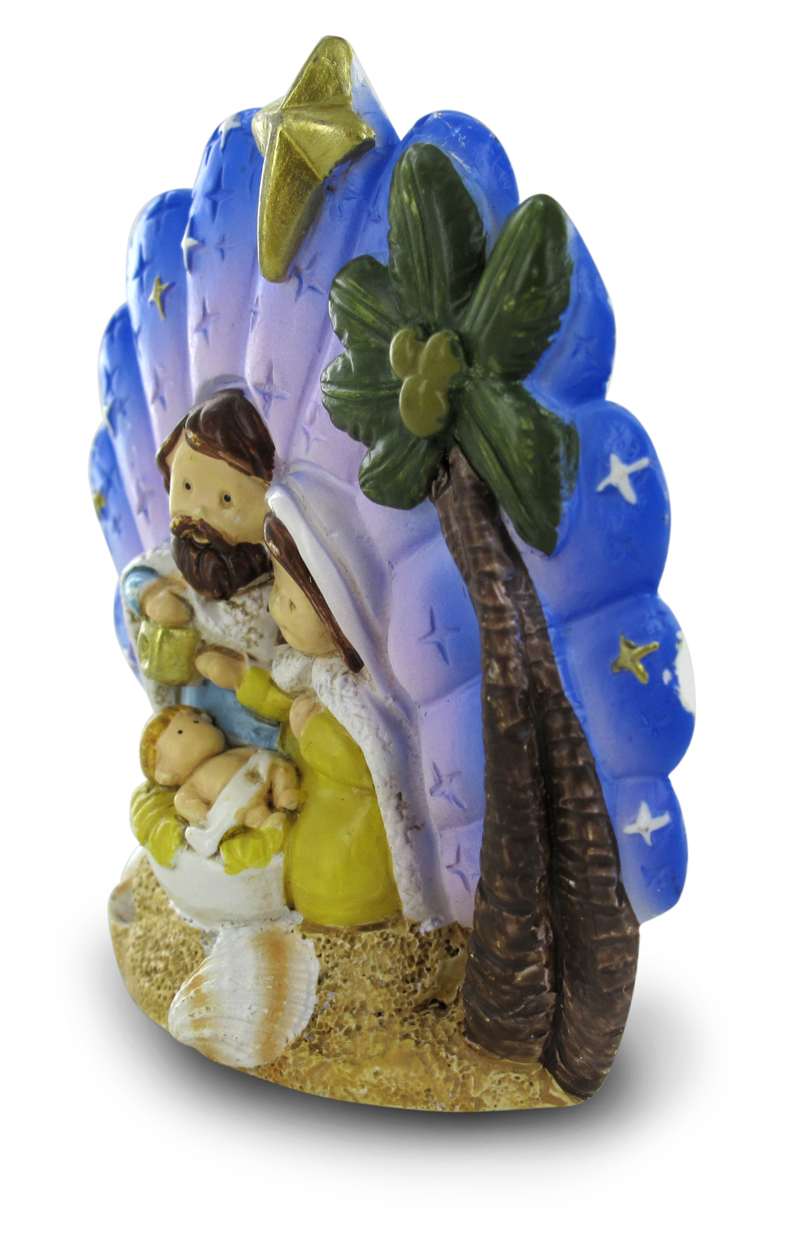 La natività – simbolo della tradizione del Natale - a forma di conchiglia ci presenta Giuseppe e Maria con Gesù nella culla, i colori sono vivaci ed il materiale è resina.
