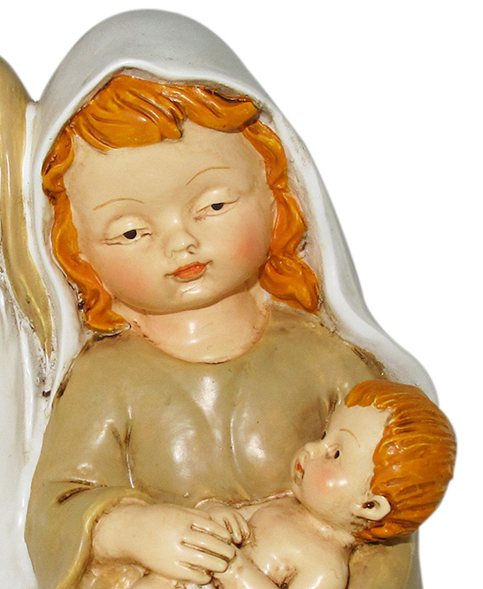 Il soprammobile natalizio, in resina colorata, rappresenta Giuseppe, Maria e Gesù Bambino in braccio alla Beata Vergine. Madre e padre fanno da sfondo e adorano il Bambino che poggia sulle ginocchia della santa madre. La Sacra Famiglia misura 16 cm d'altezza e 11 cm di larghezza. Lo stile dei personaggi di questa decorazione natalizia, caratterizzato da volti paffuti, ricorda un po' le raffigurazioni dei cartoni animati e rende la natività un regalo ideale per bambini o per alunni del catechismo.