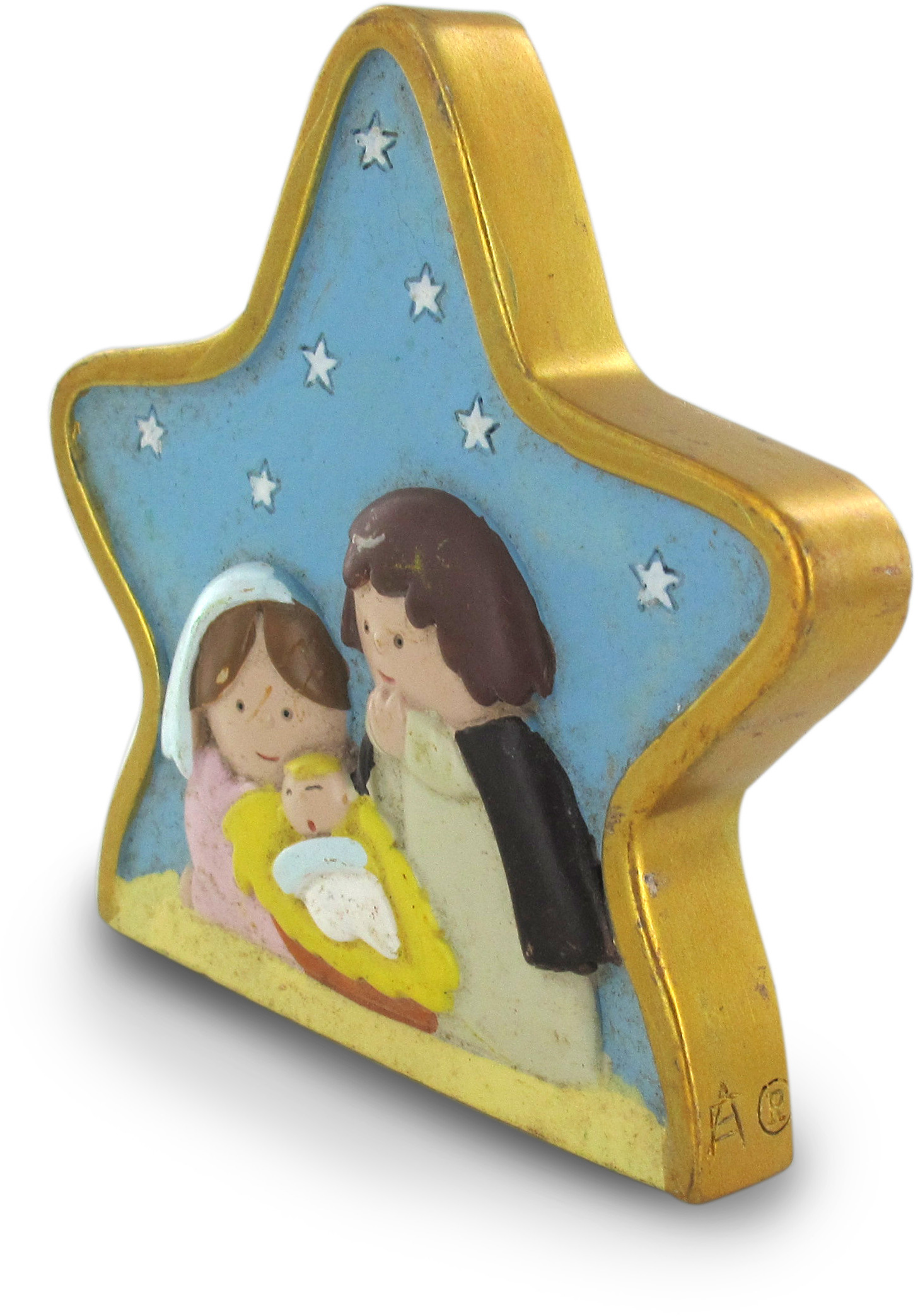 Siete alla ricerca di una idea alternativa al solito presepe classico per bambini? Questo quadretto da appoggio a forma di stella, in resina dipinta con colori molto allegri, rappresenta la Sacra Famiglia in uno dei suoi momenti più belli: la Natività del Signore. I soggetti sono in rilievo rispetto allo sfondo azzurro. Gesù, Giuseppe e Maria sono raccolti sotto un cielo stellato e il contorno della stella, di color oro, esalta ulteriormente i colori e la rappresentazione.
