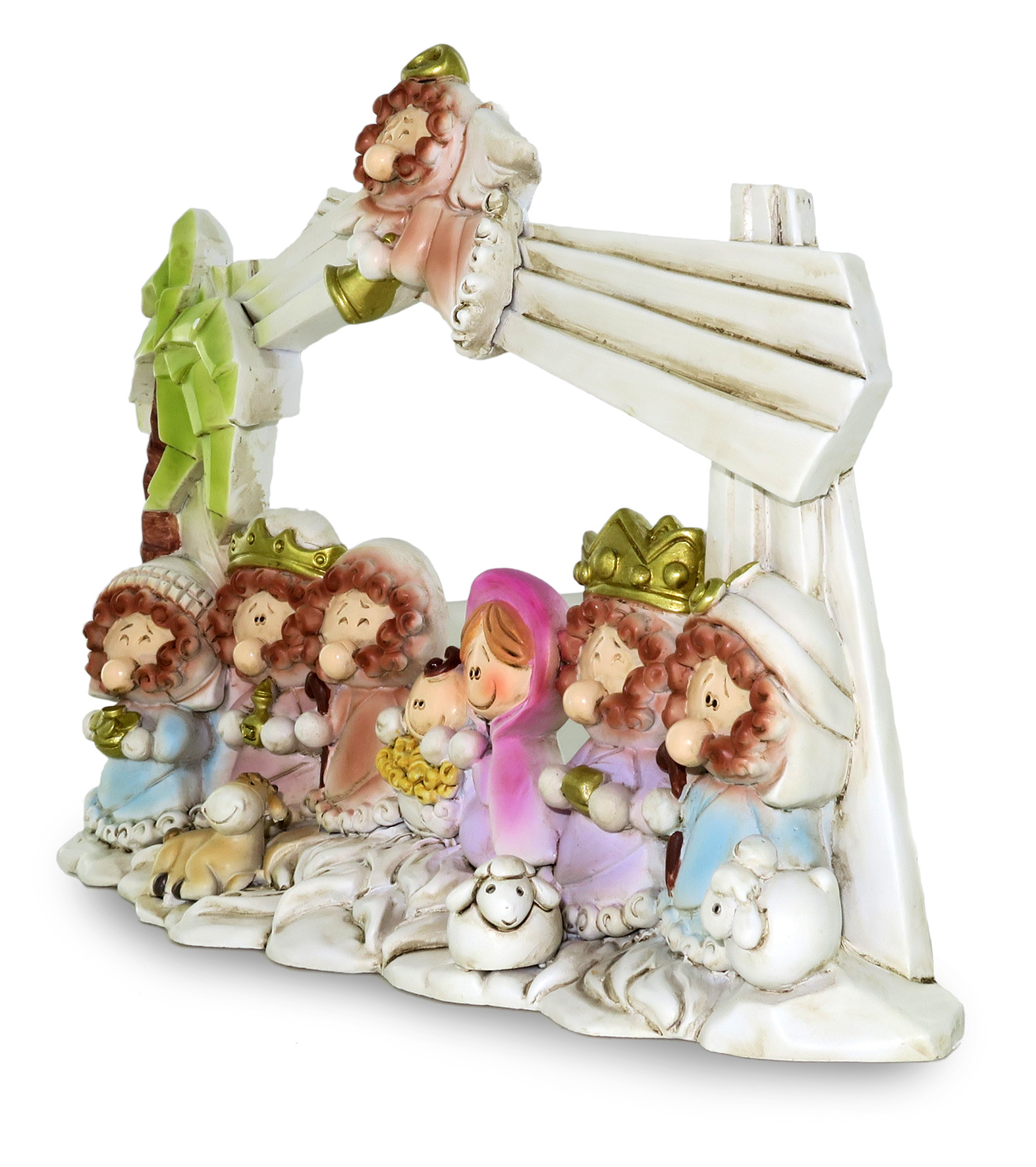 Presepe per bambini con capanna e 10 personaggi in resina - 20 x 13,5 cm