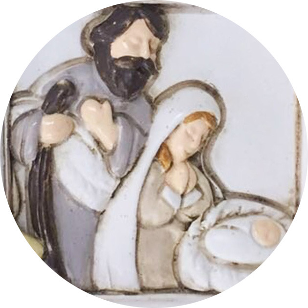 Il piccolo quadretto in resina bianca rappresenta un angioletto sopra a una finestra aperta. All'interno, è raffigurata la Sacra Famiglia: Giuseppe e Maria, il primo con una mano sul petto e la seconda a mani giunte, stanno ammirando Gesù Bambino nella culla. Visto il soggetto della Natività, è una decorazione natalizia molto carina, particolarmente adatta a bambini.