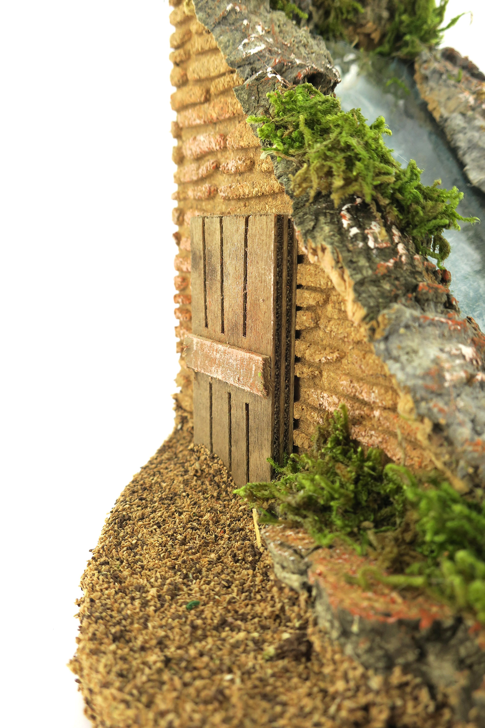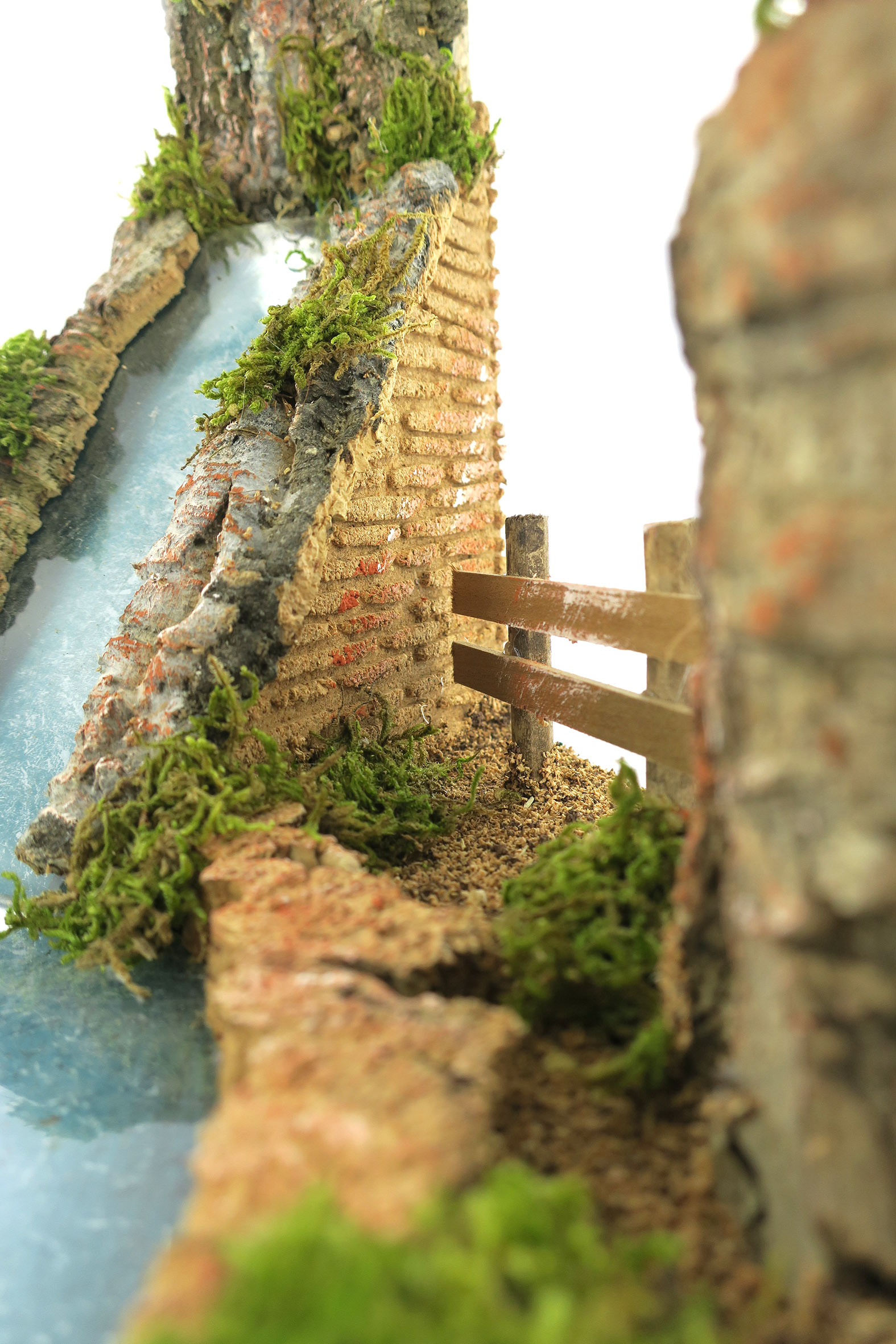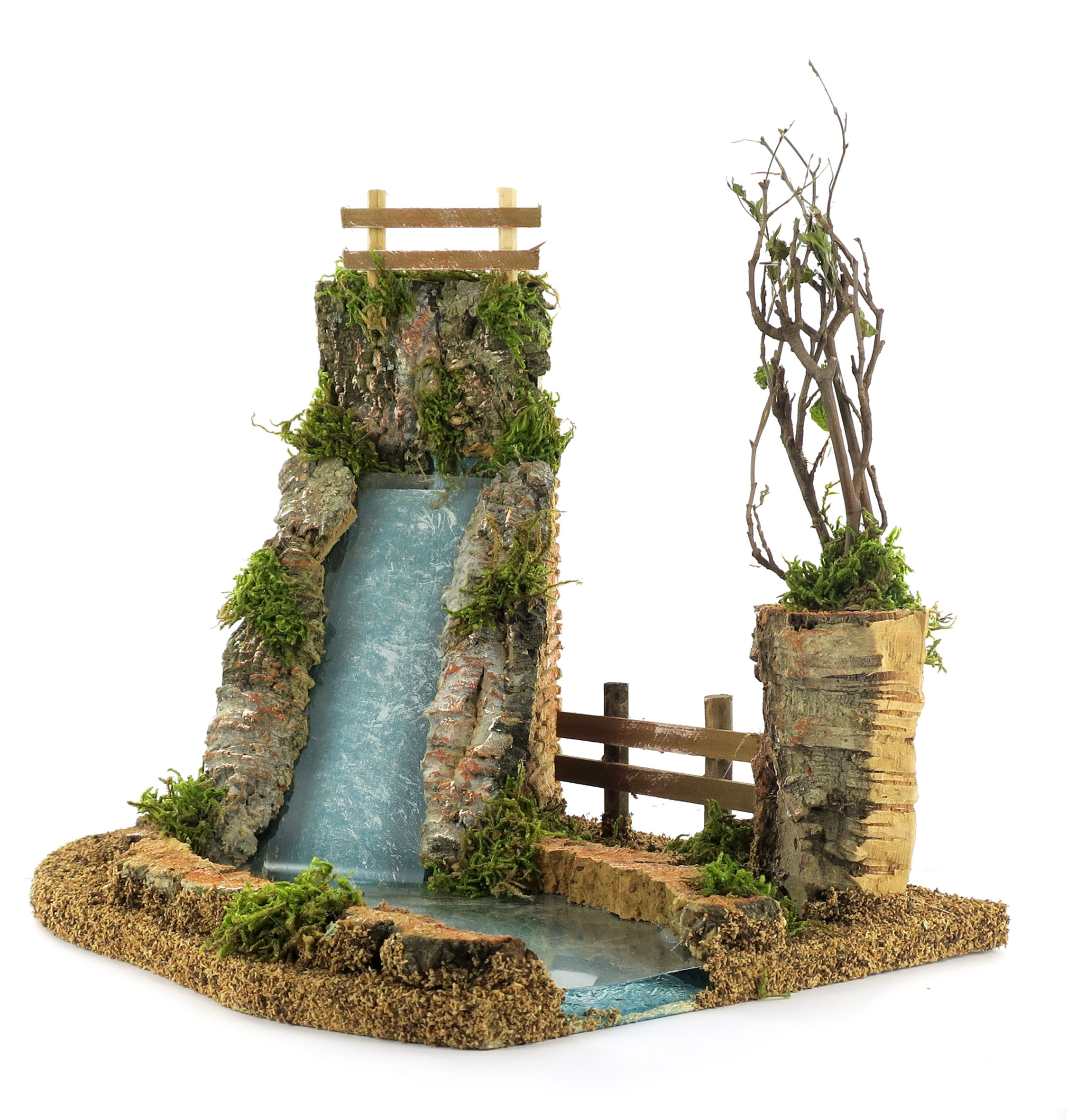 Accessori per presepe: Cascata con laghetto. Dimensioni: 20 x 25 x 21 cm. Materiali: Legno, sughero e muschio. Realizzato artigianalmente in Italia.