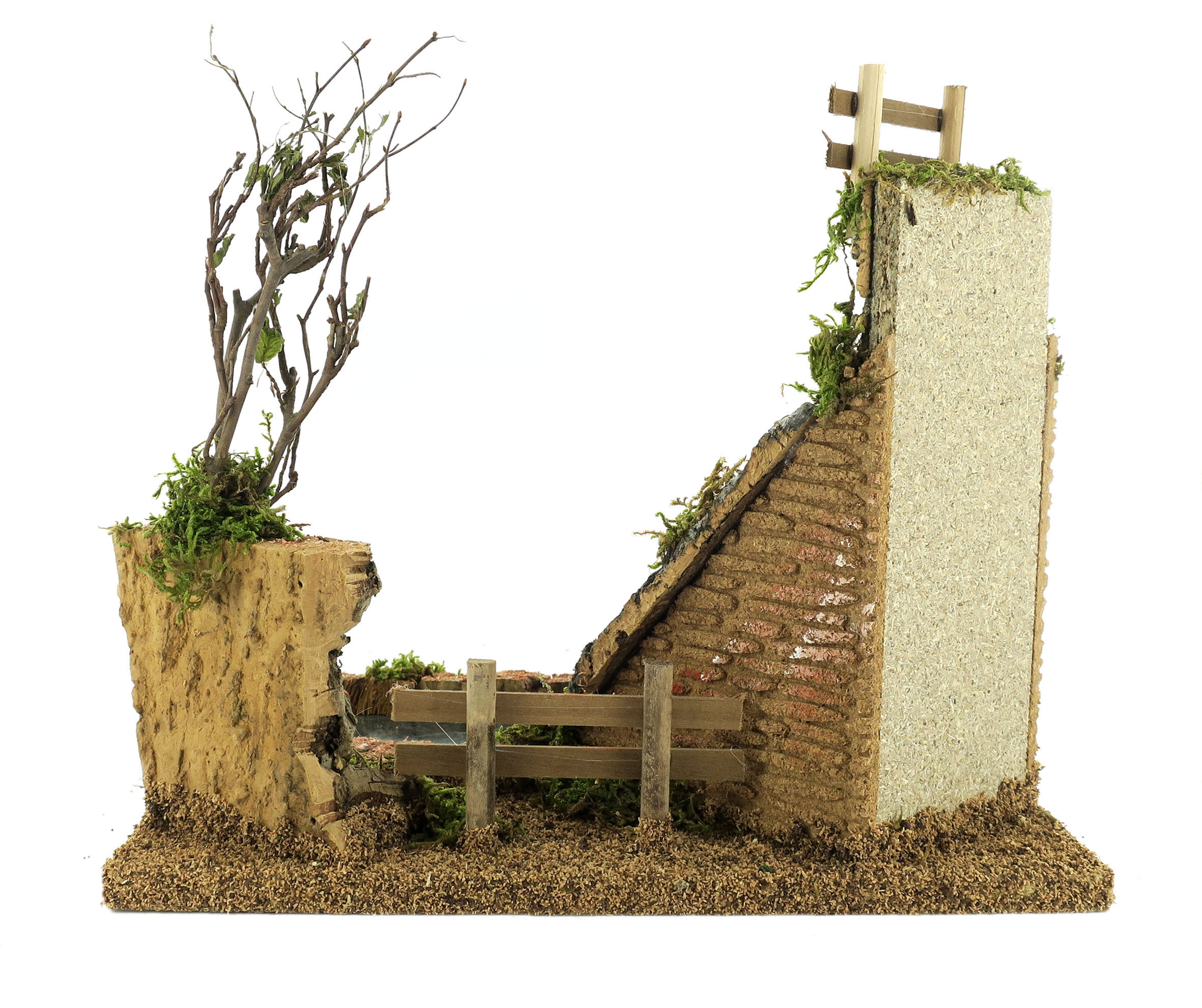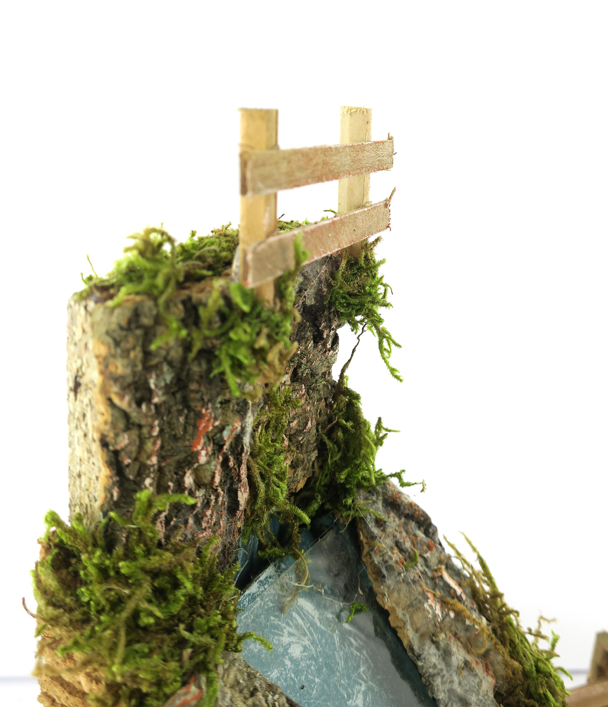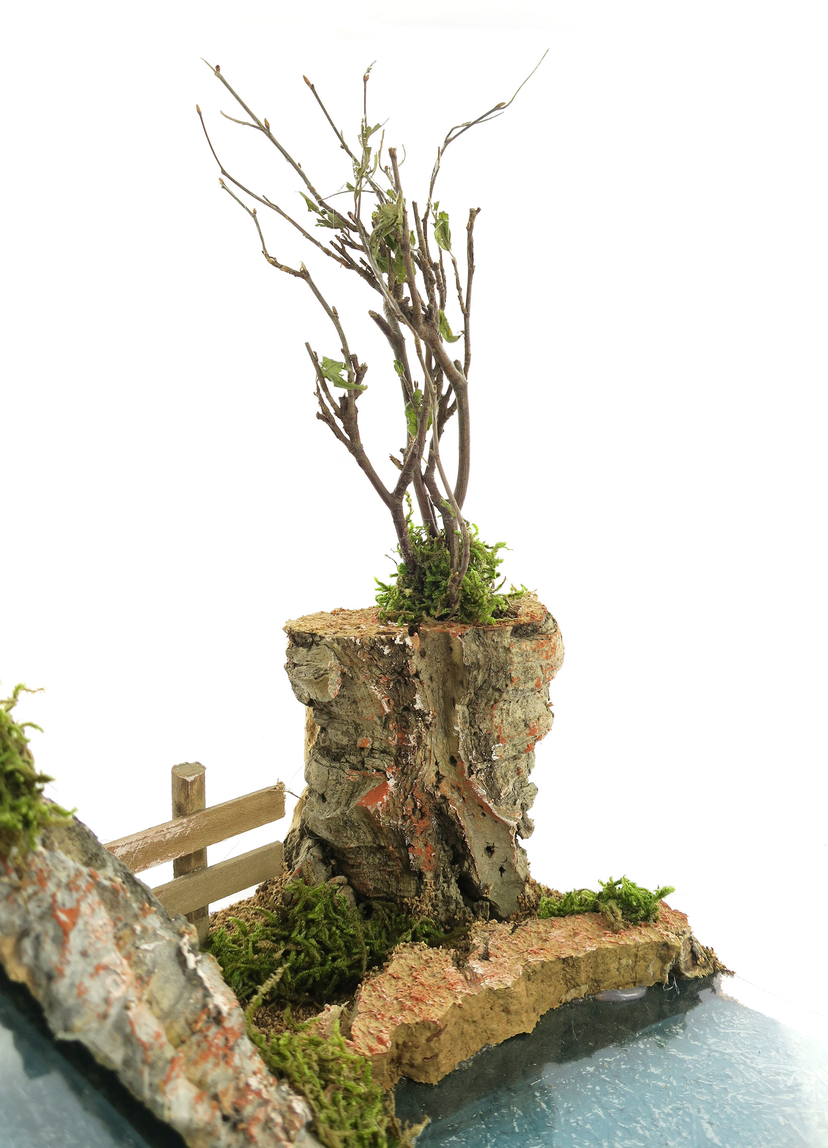Accessori per presepe: Cascata con laghetto. Dimensioni: 20 x 25 x 21 cm. Materiali: Legno, sughero e muschio. Realizzato artigianalmente in Italia.