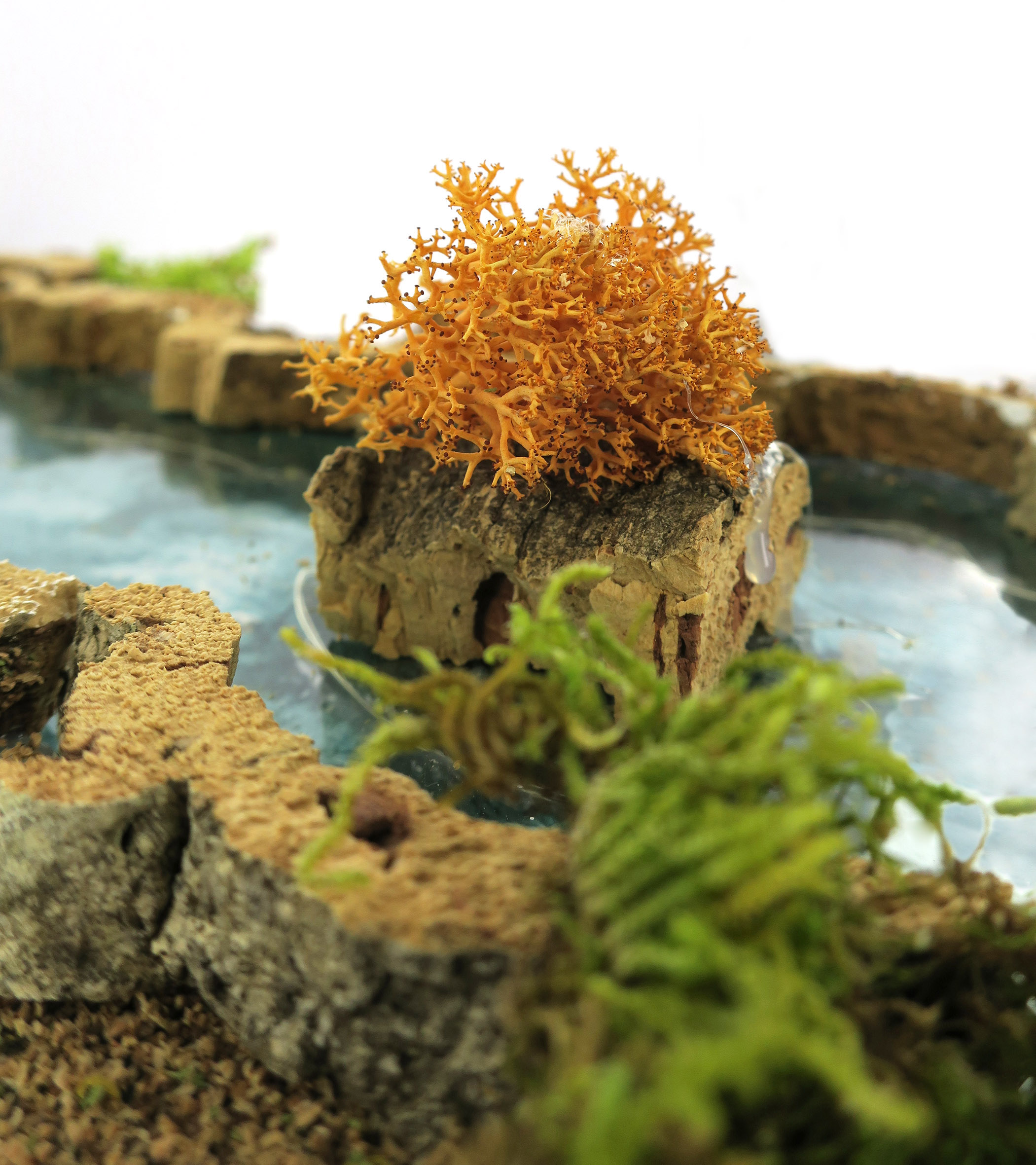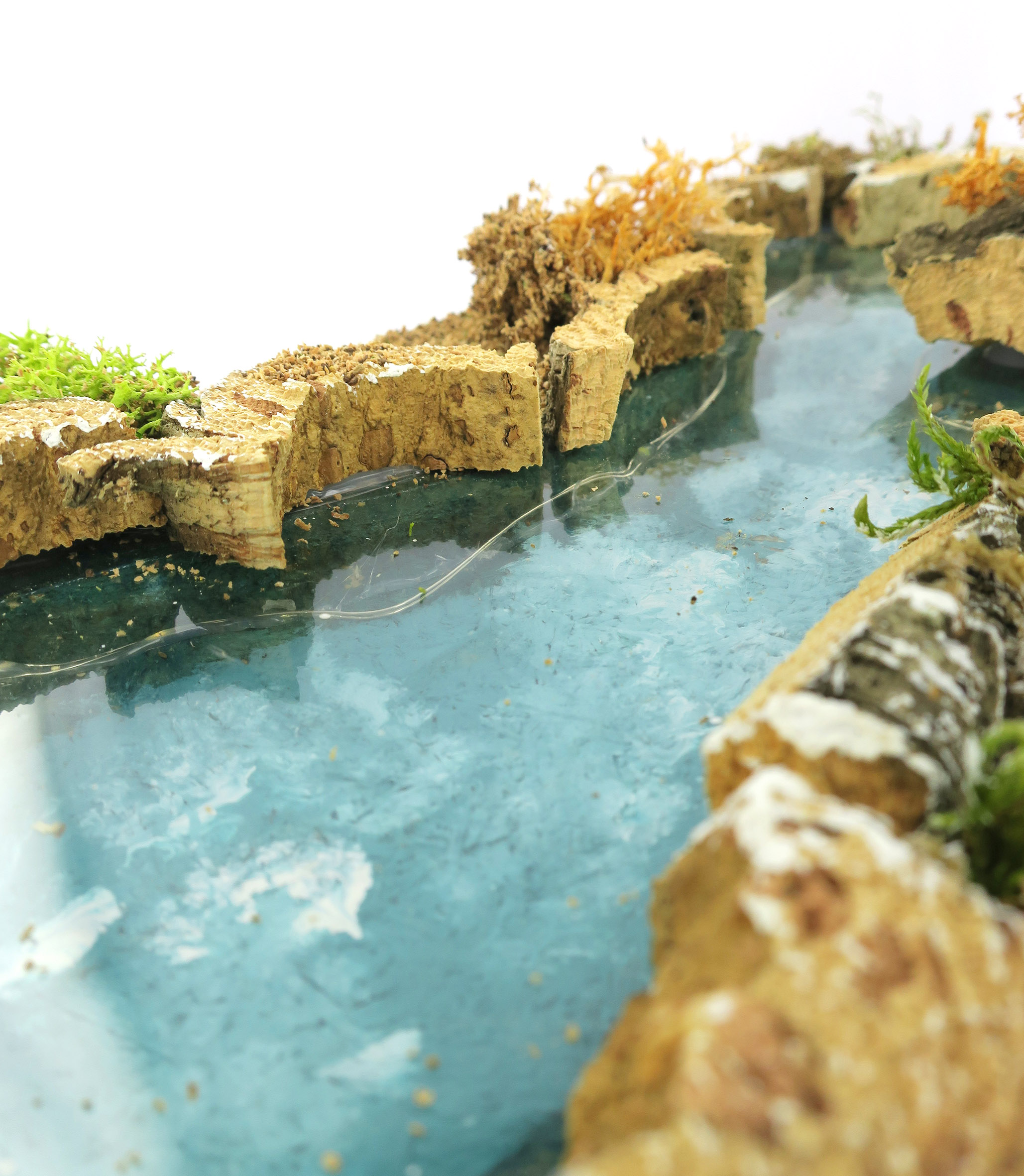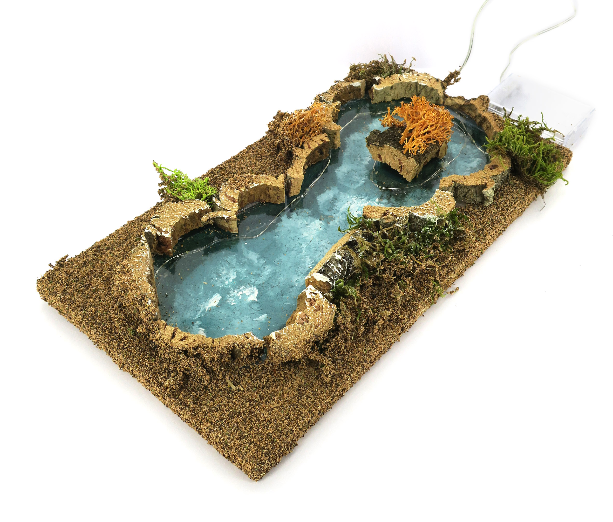 Accessori per presepe: Laghetto luminoso. Dimensioni: 5 x 16 x 7 cm. Materiali: legno, sughero, cartone, lichene e muschio. Altre caratteristiche: LED bianco ghiaccio con alimentazione a batteria. Realizzato artigianalmente in Italia.