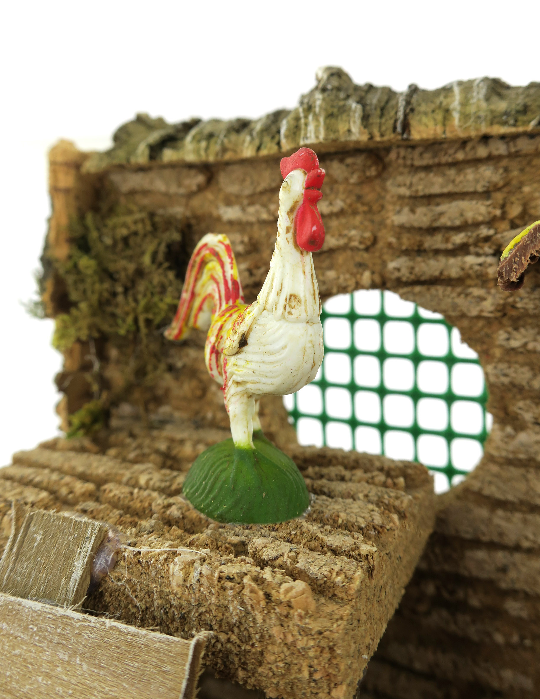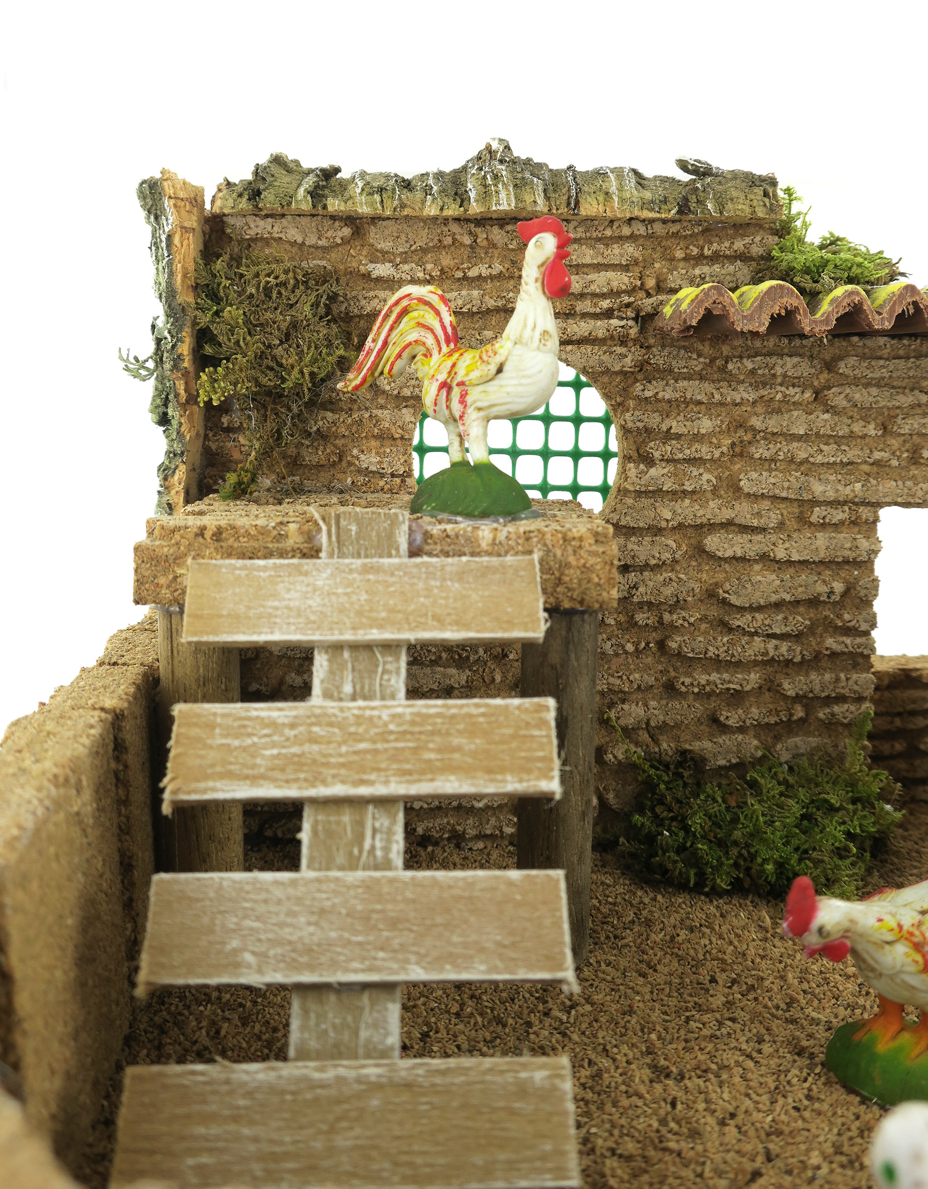 Accessori per presepe: Pollaio con galline. Dimensioni: 26 x 18 x 11 cm. Materiali: Legno, sughero, muschio e paglia (tranne le galline realizzate in plastica). Realizzato artigianalmente in Italia.