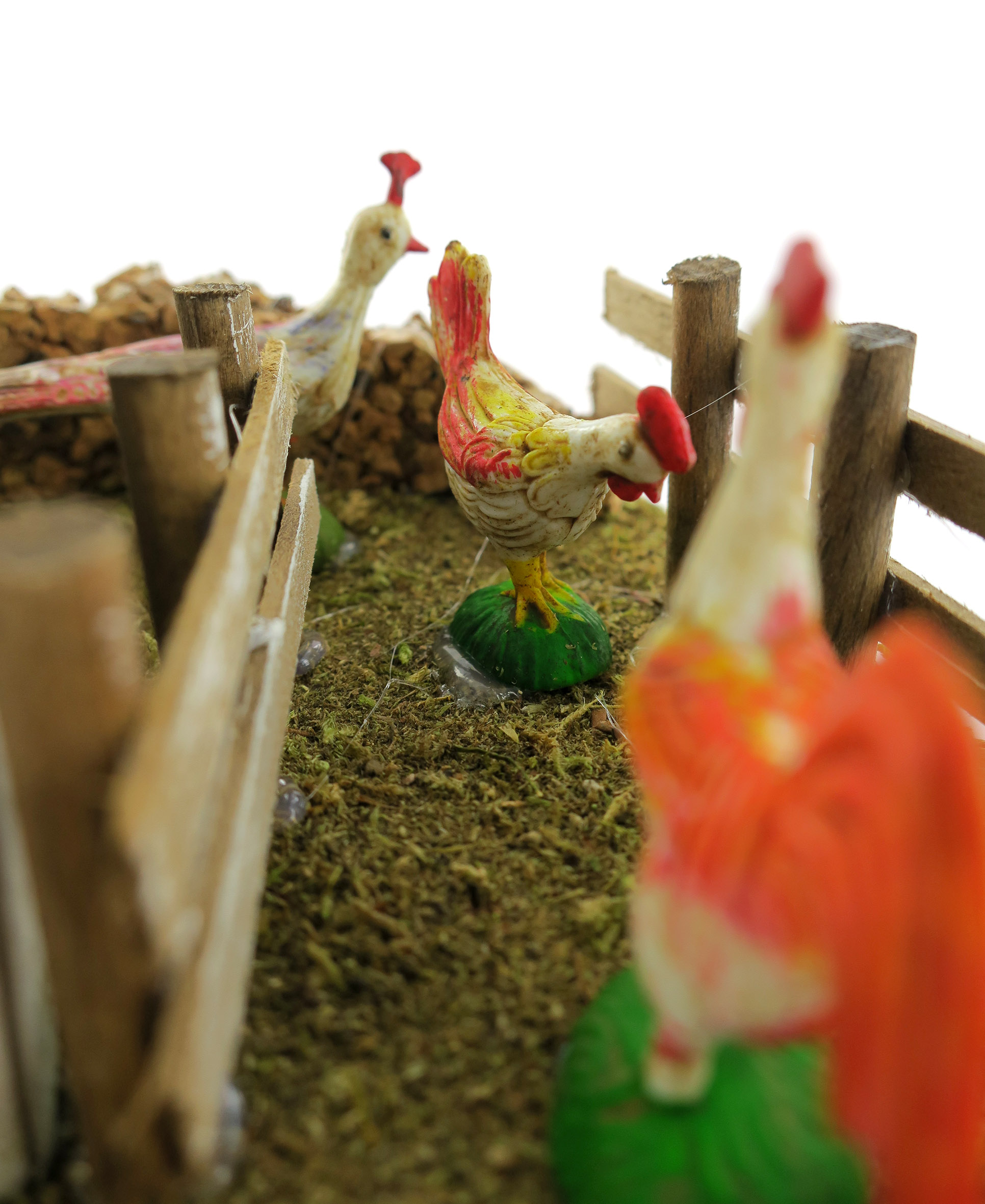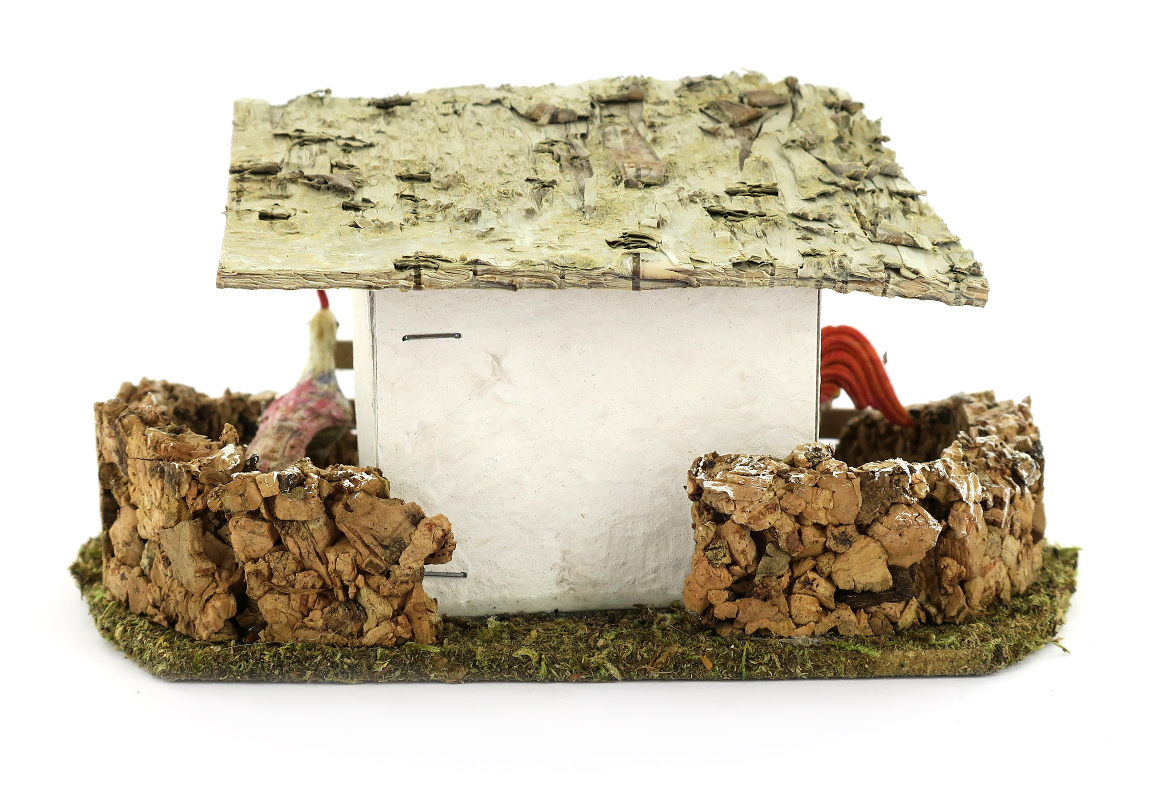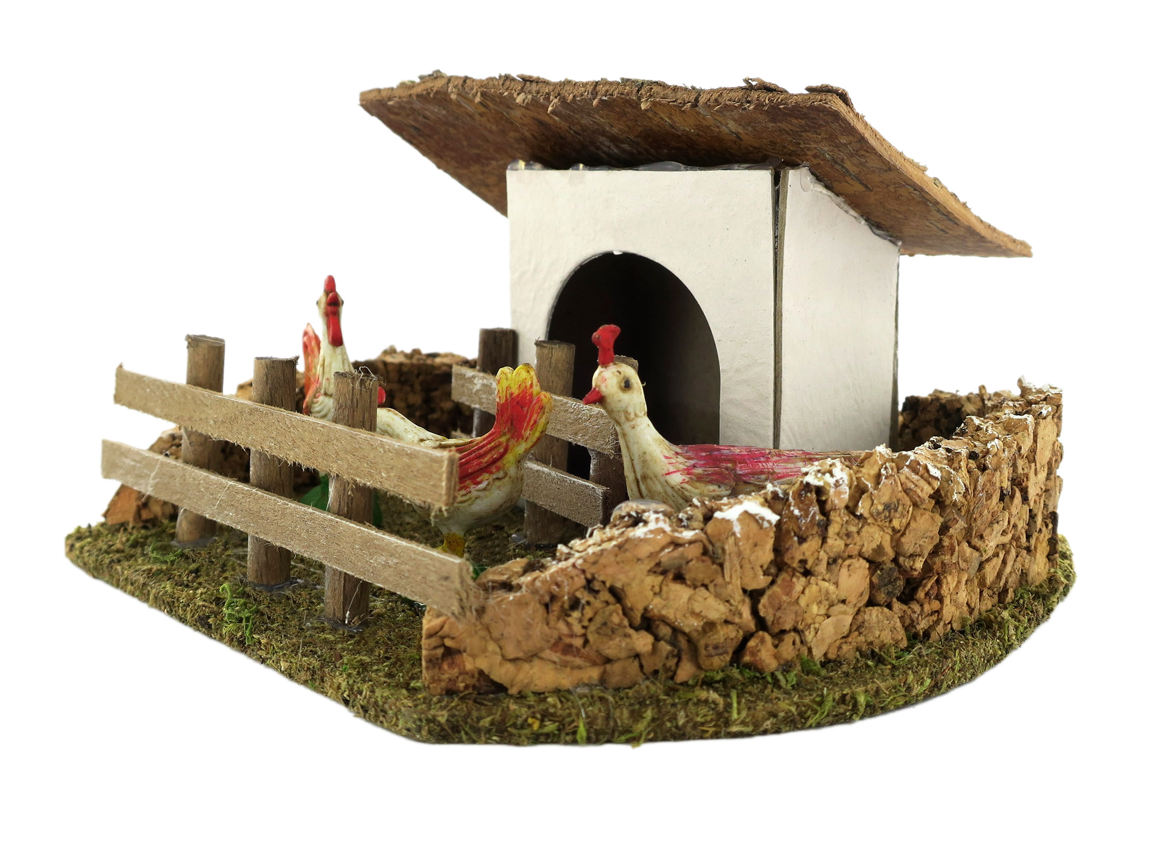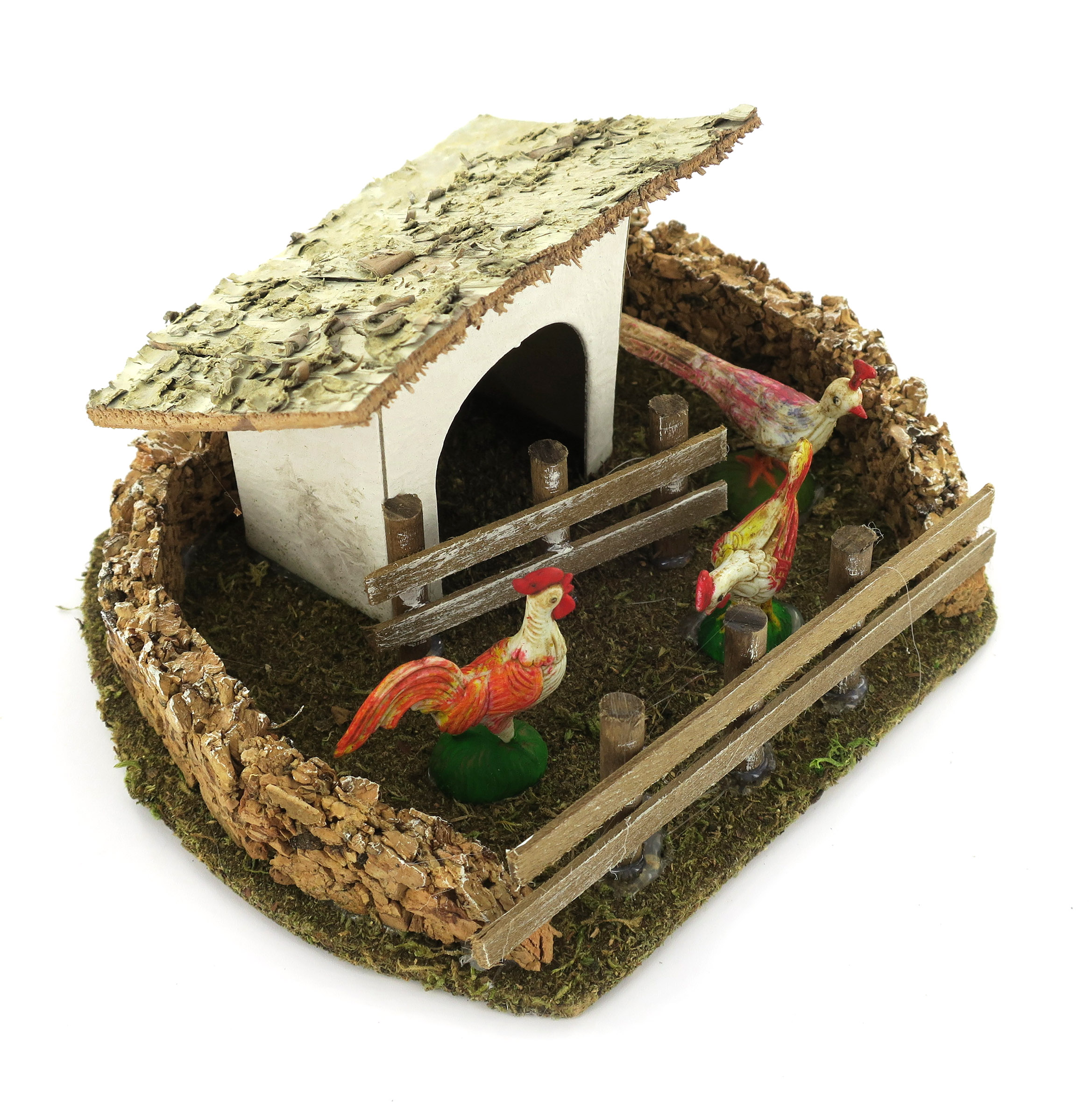 Accessori per presepe: Pollaio con galli / galline in miniatura per angoli di campagna in presepi tradizionali. Dimensioni: 16 x 13 x 7 cm. Materiali: Legno, sughero e muschio (tranne le galline realizzati in plastica). Realizzato artigianalmente in Italia.