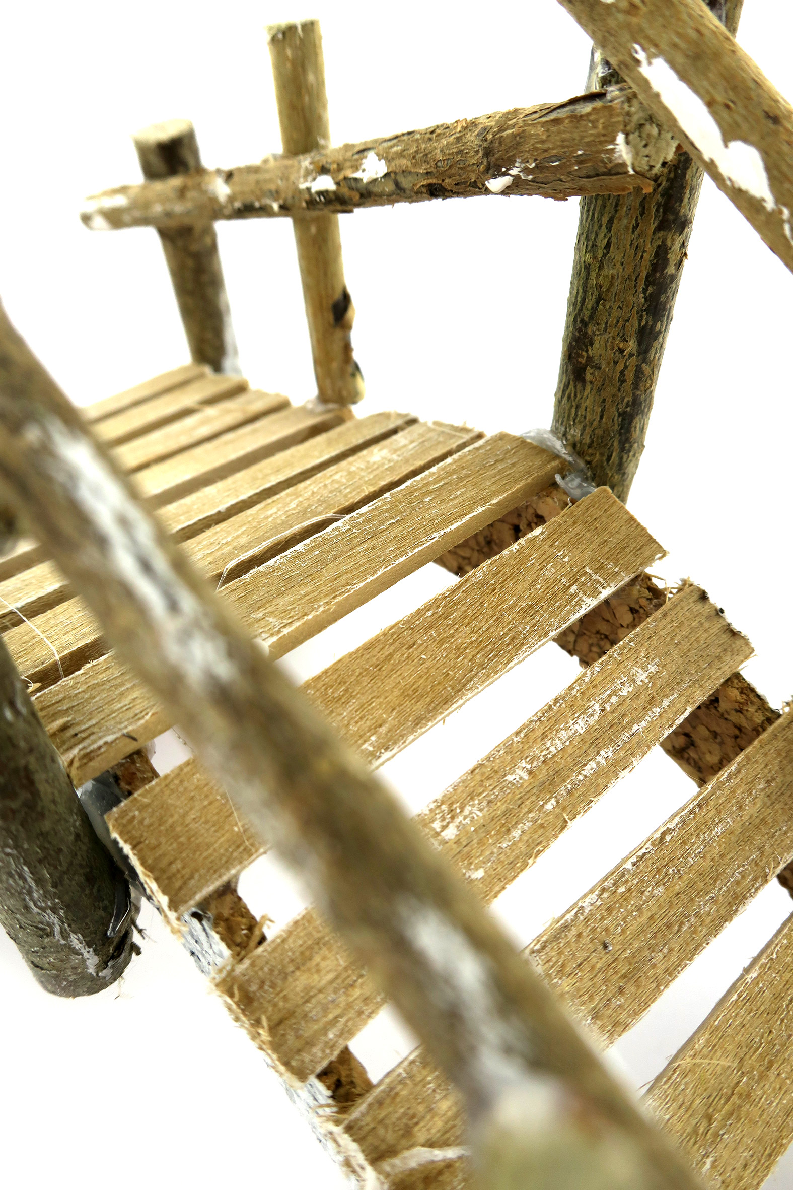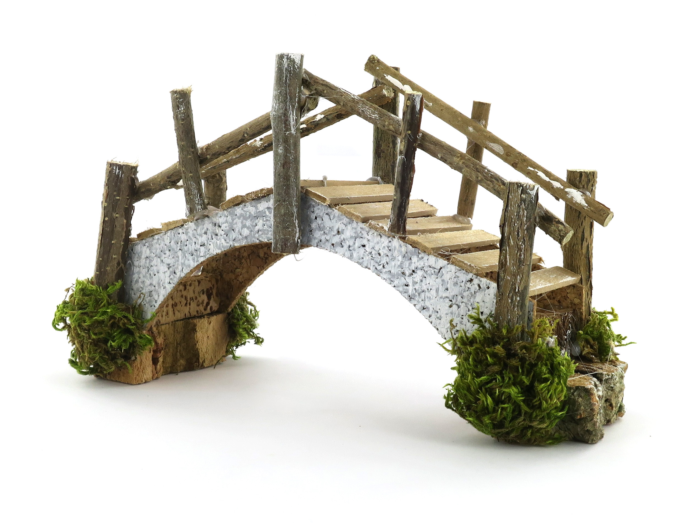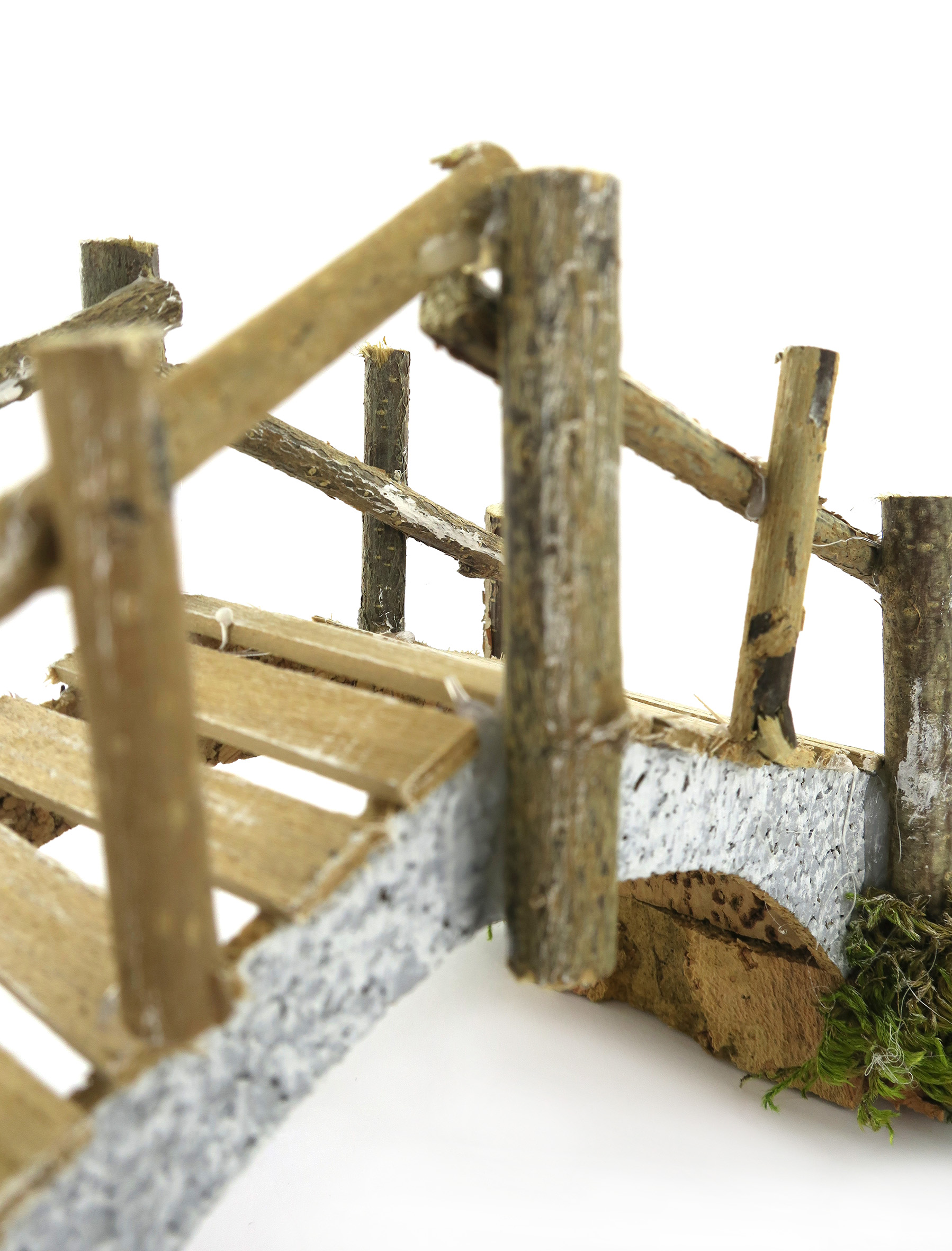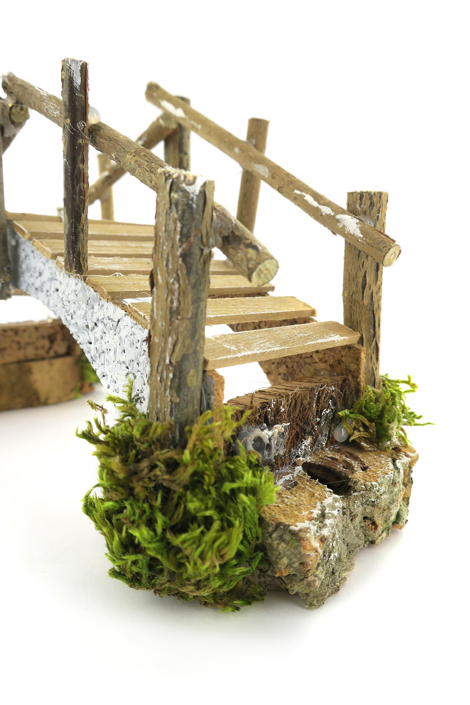 Accessori per presepe: Ponte in sughero con assi di legno. Dimensioni: 23 x 7 x 12 cm. Materiali: Legno, sughero e lichene. Realizzato artigianalmente in Italia.