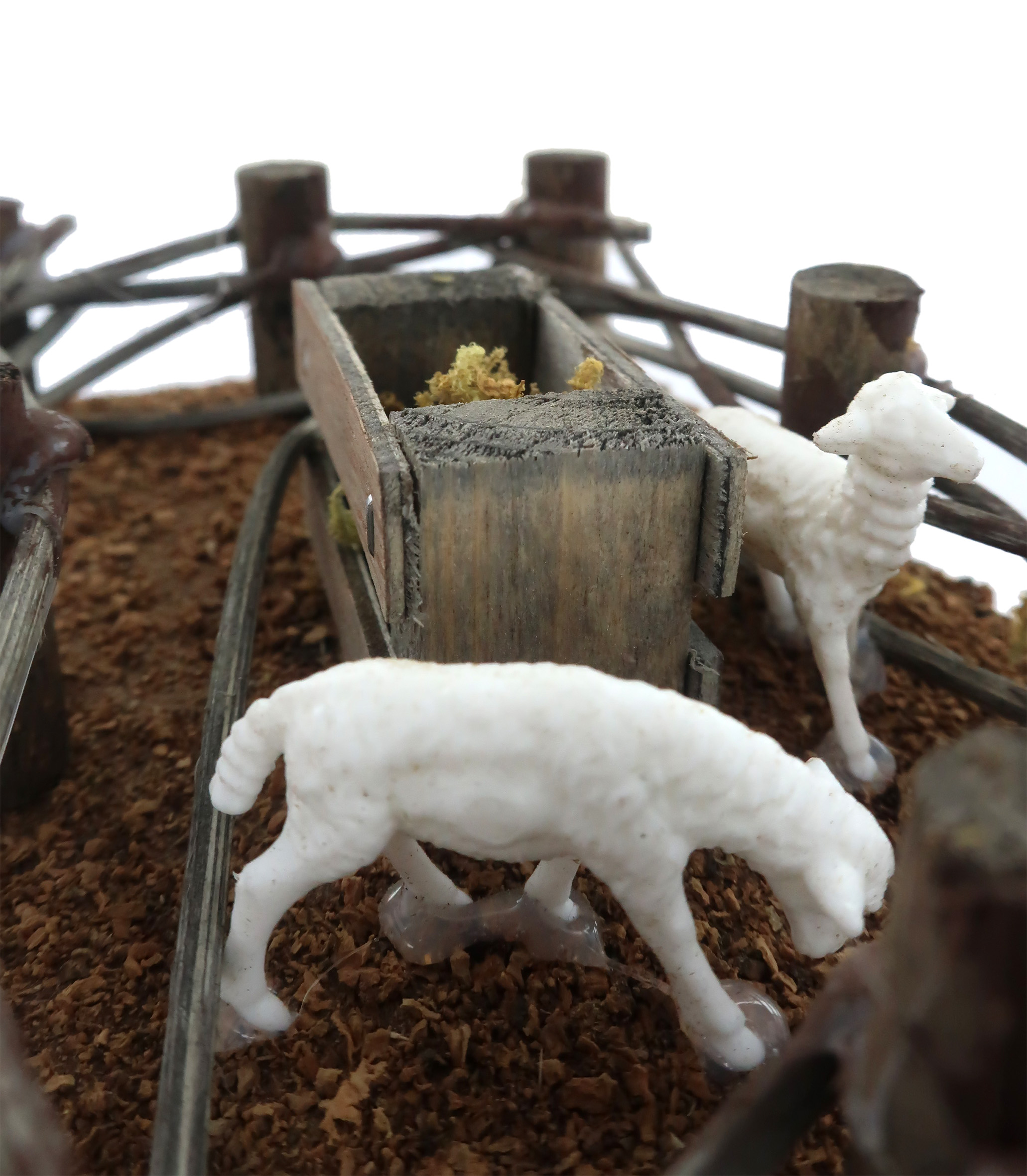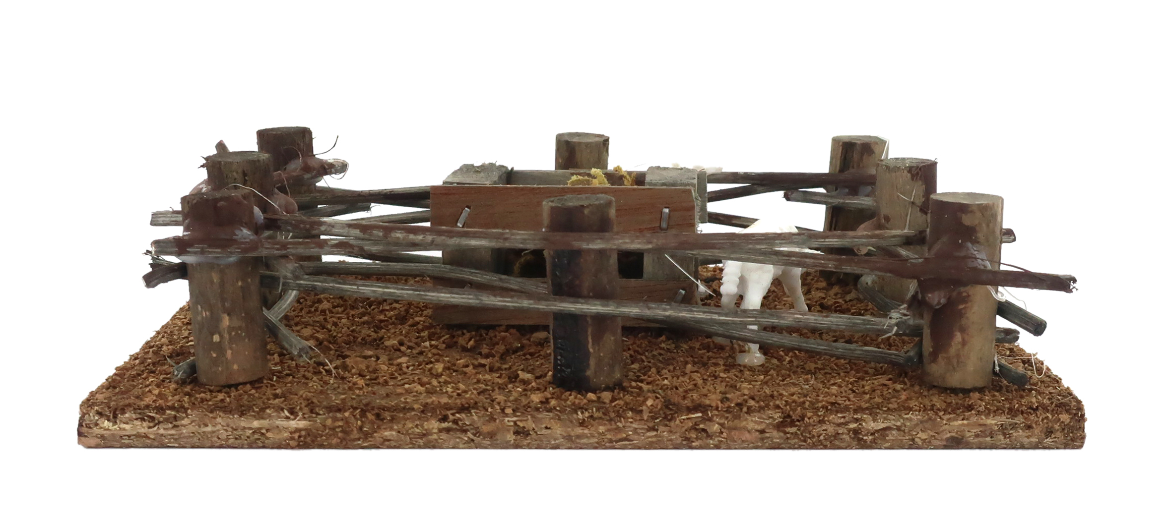 Accessori per presepe: recinto del gregge. Dimensioni: 10 x 16 x 4 cm. Materiali: Legno e muschio (tranne le pecore realizzate in plastica). Realizzato artigianalmente in Italia.