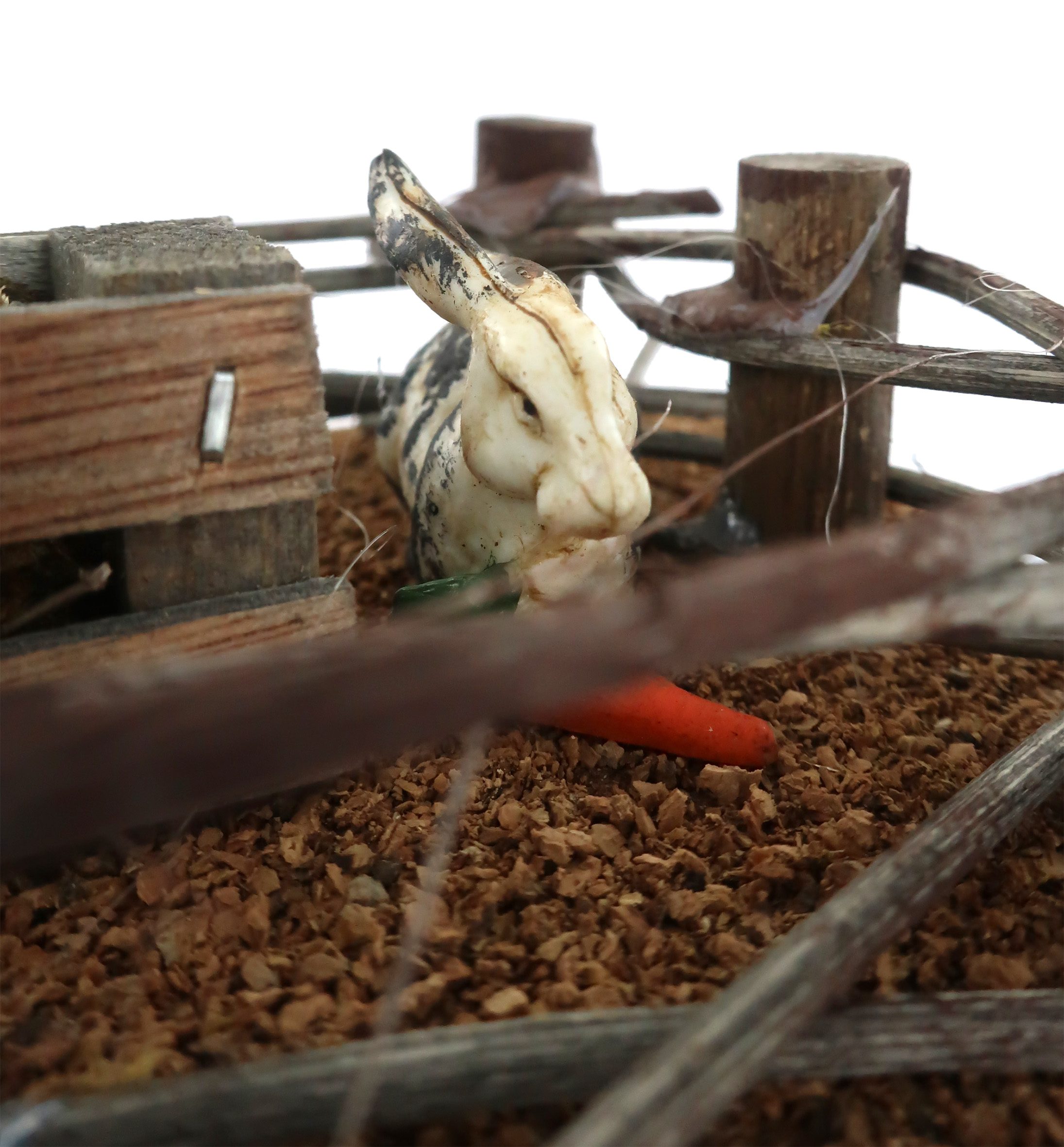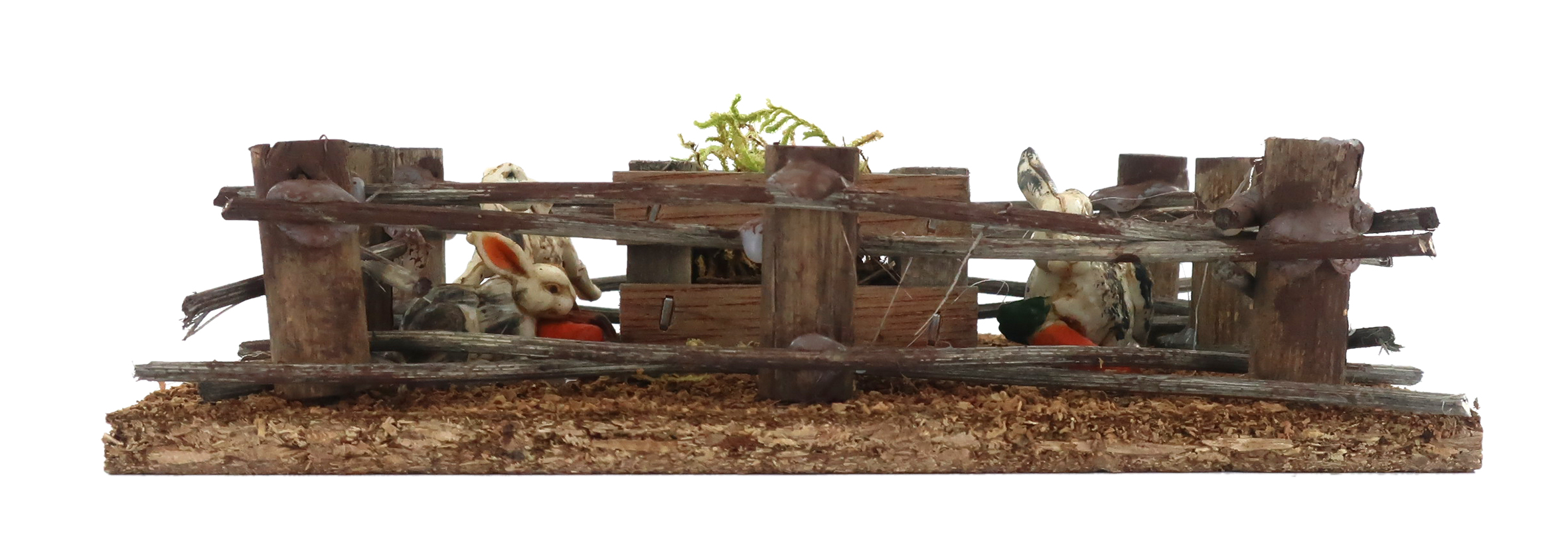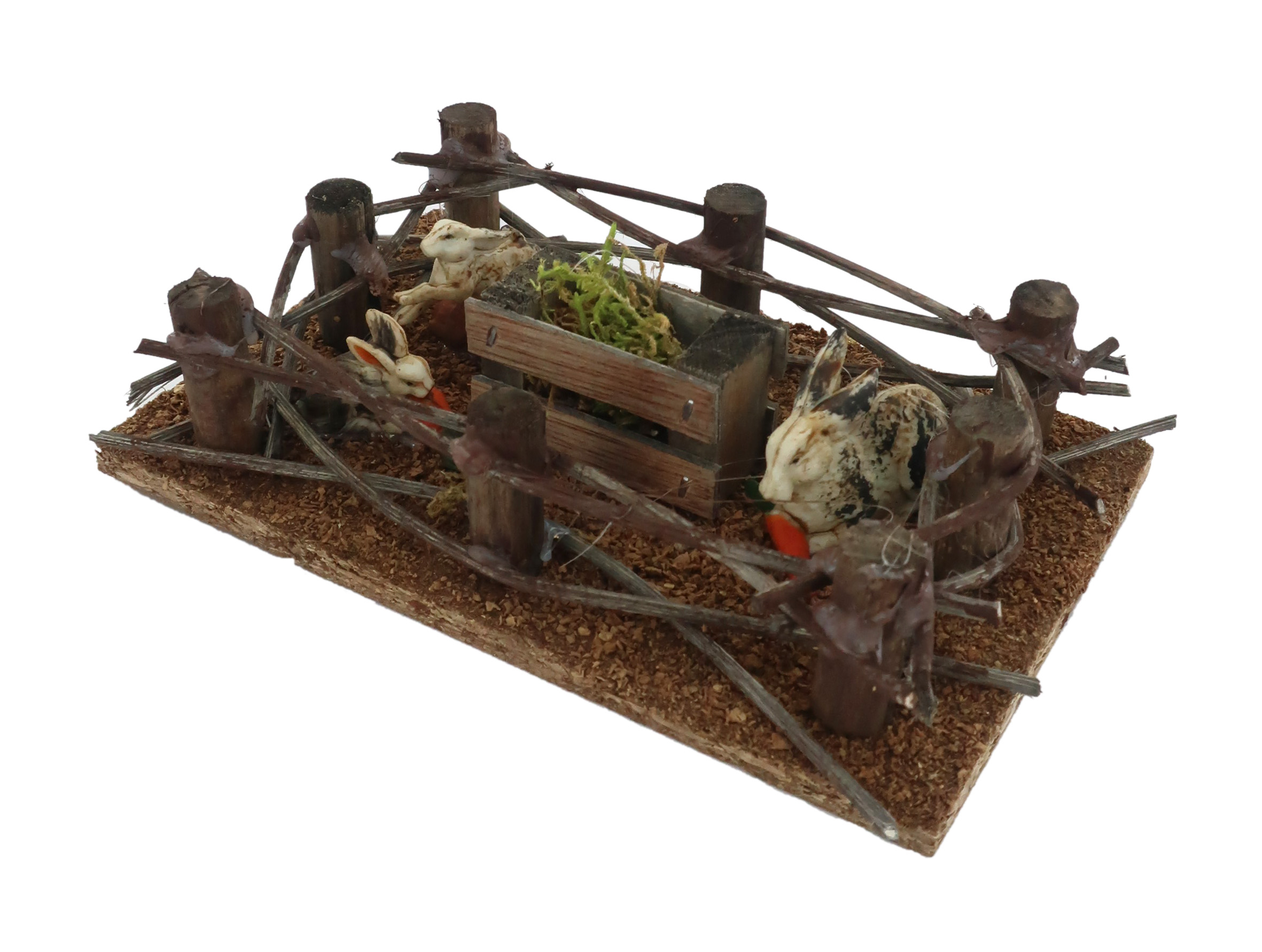 Accessori per presepe: recinto dei conigli. Dimensioni: 16 x 10 x 4 cm. Materiali: Legno e muschio (tranne i conigli realizzati in plastica). Realizzato artigianalmente in Italia.