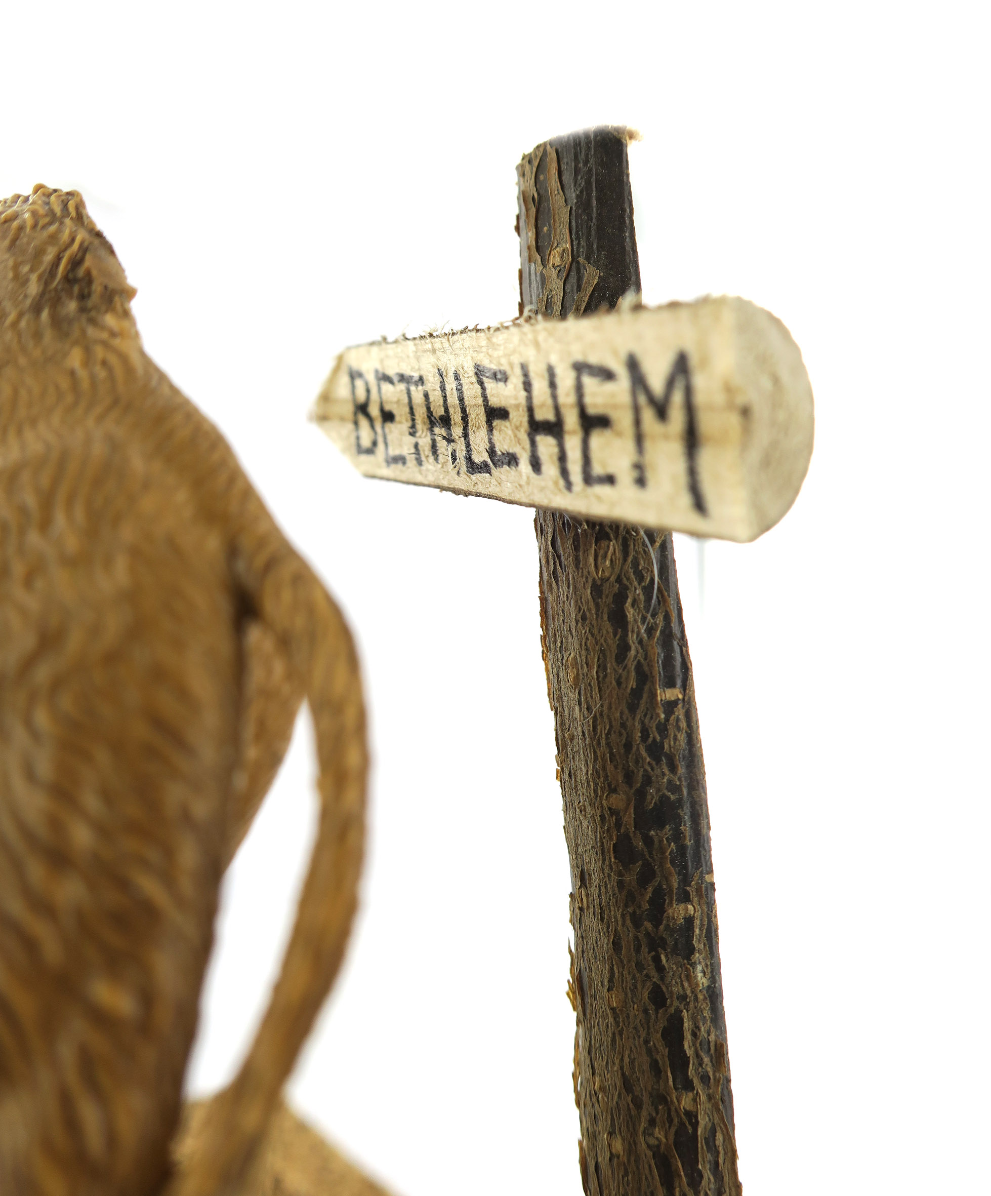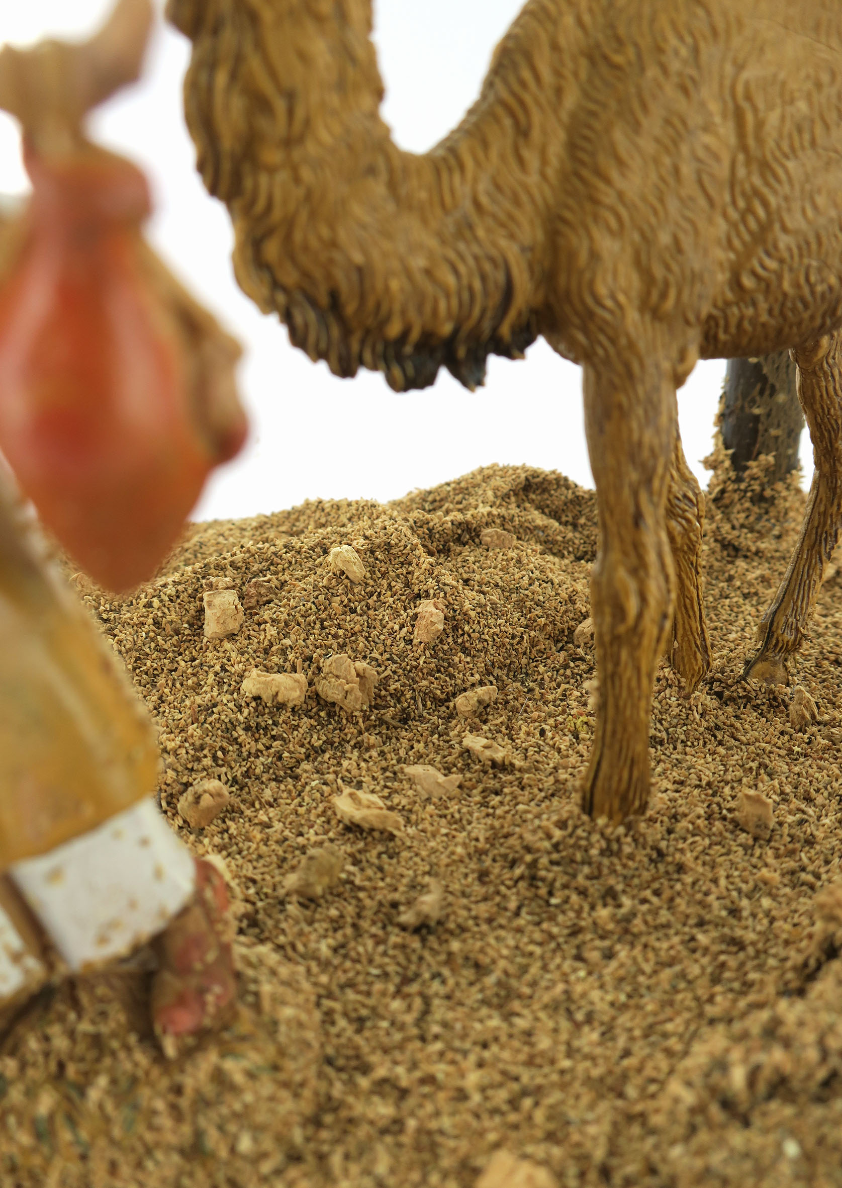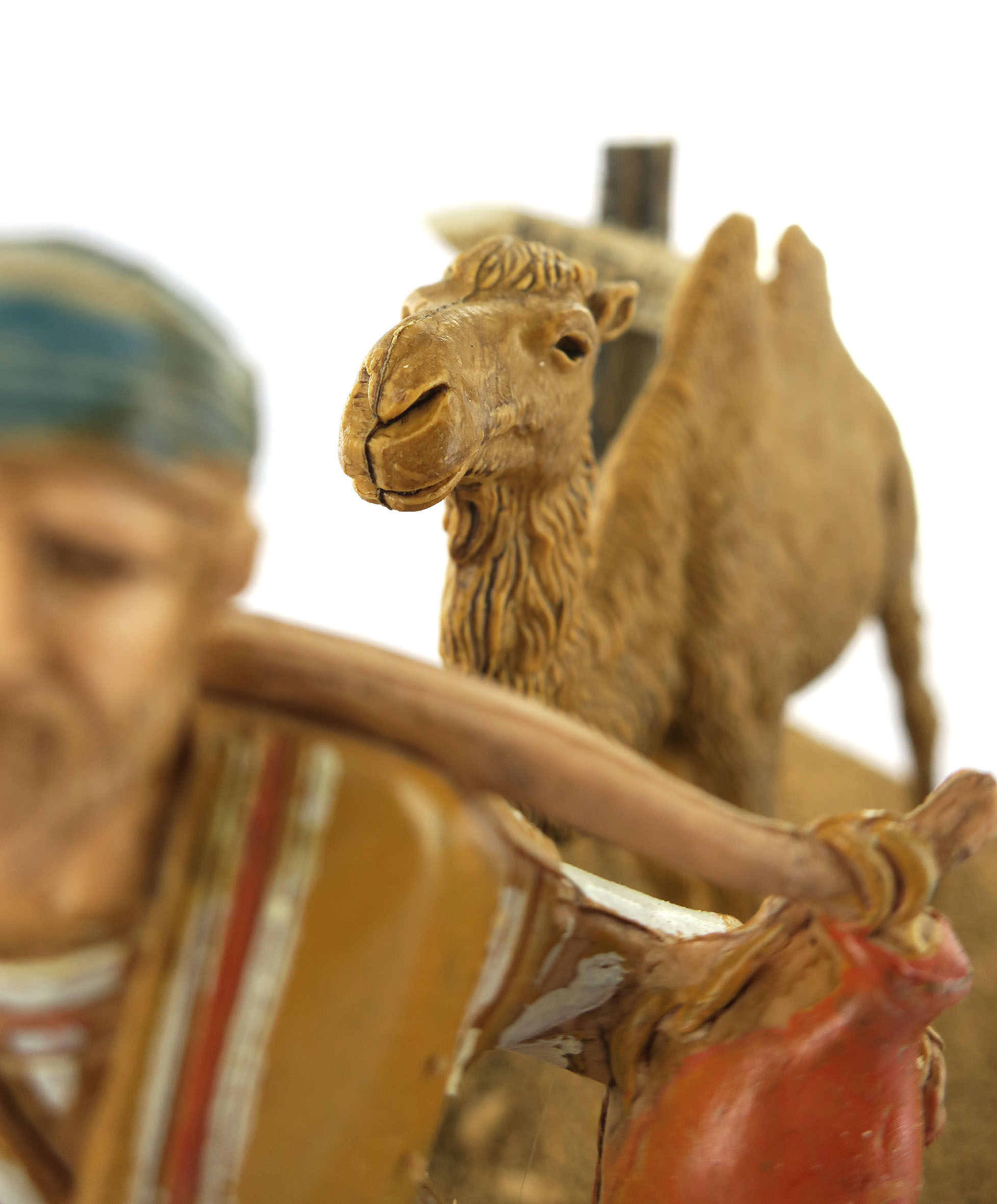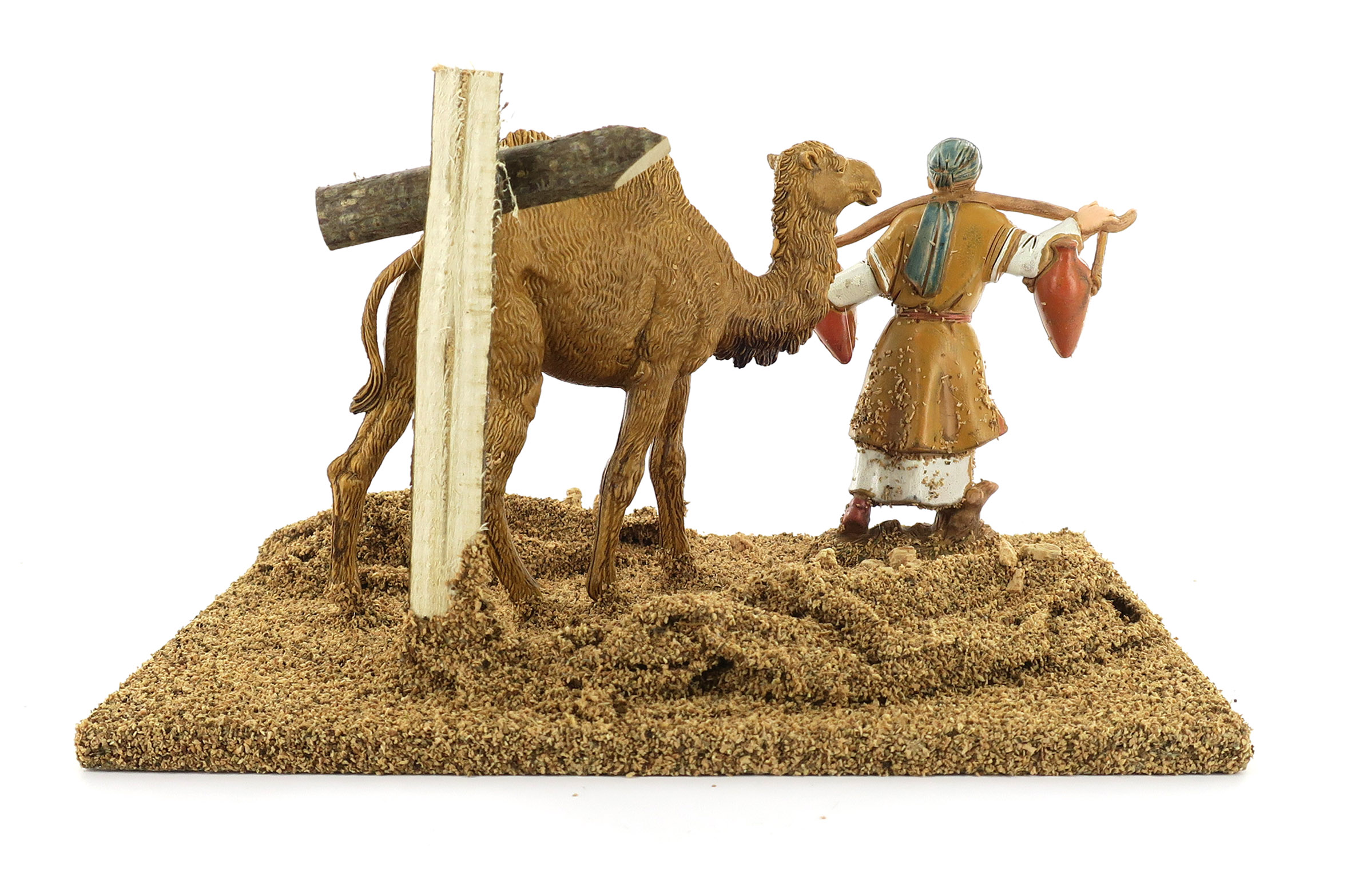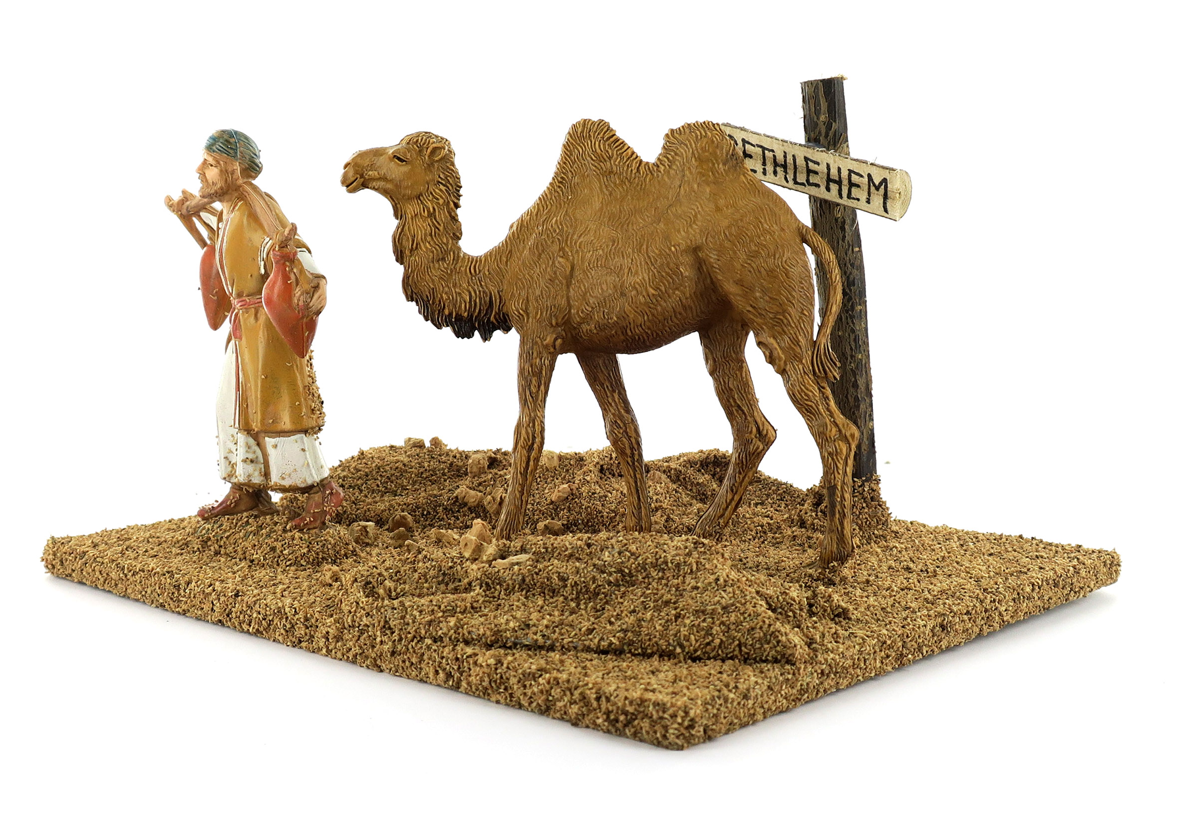 Accessori per presepe: Pellegrino con cammello. Dimensioni: 15 x 17 x 18 cm. La statuina del pellegrino è in plastica ed è alta 10 cm. Materiali: Legno e segatura. Realizzato artigianalmente in Italia.