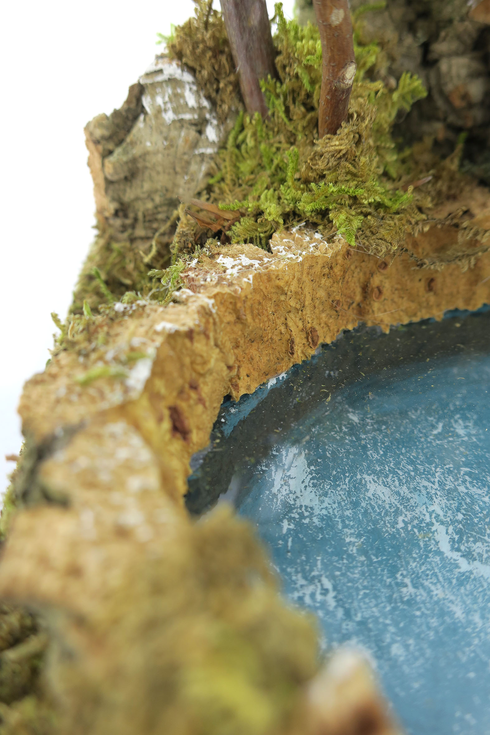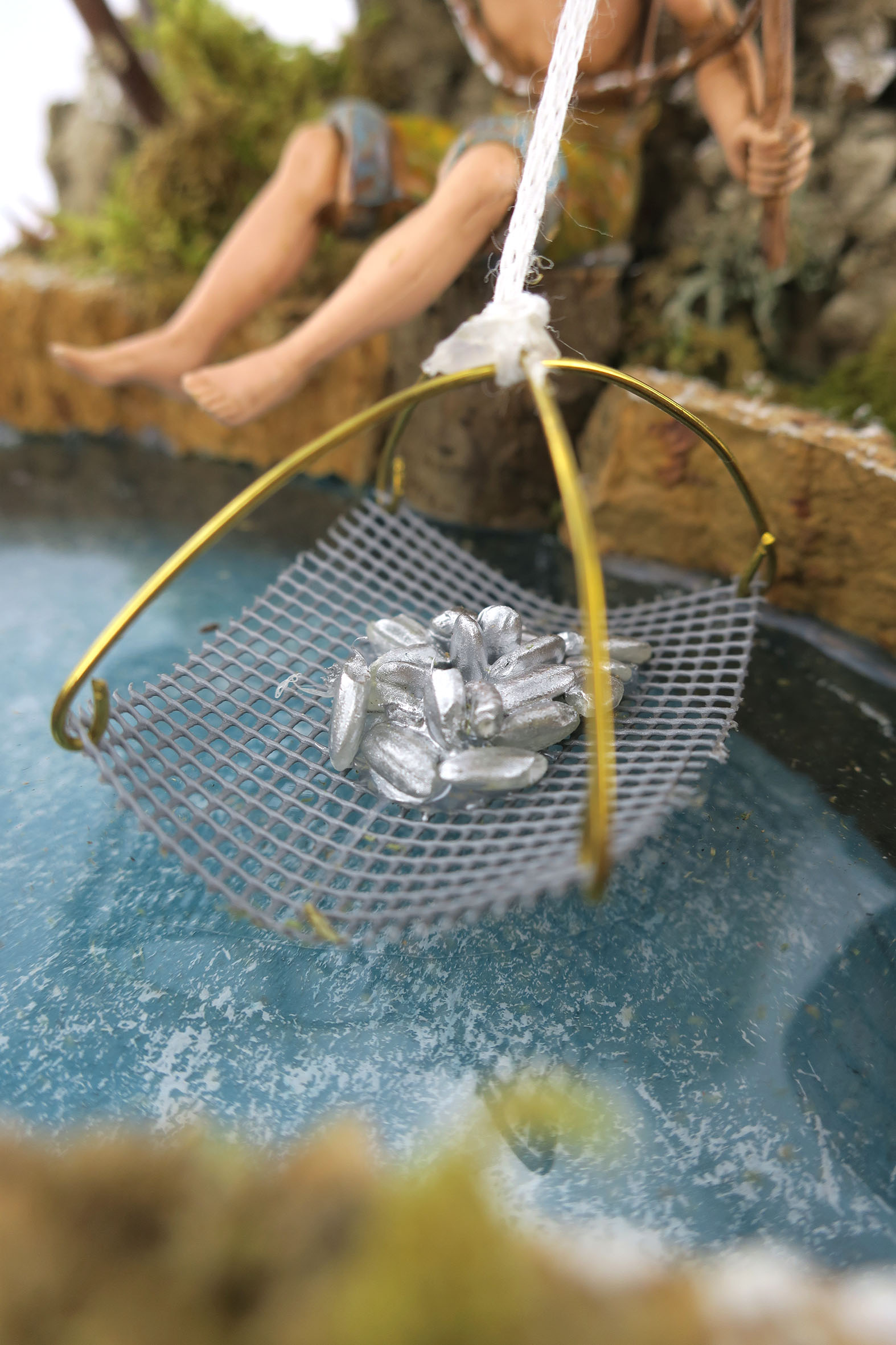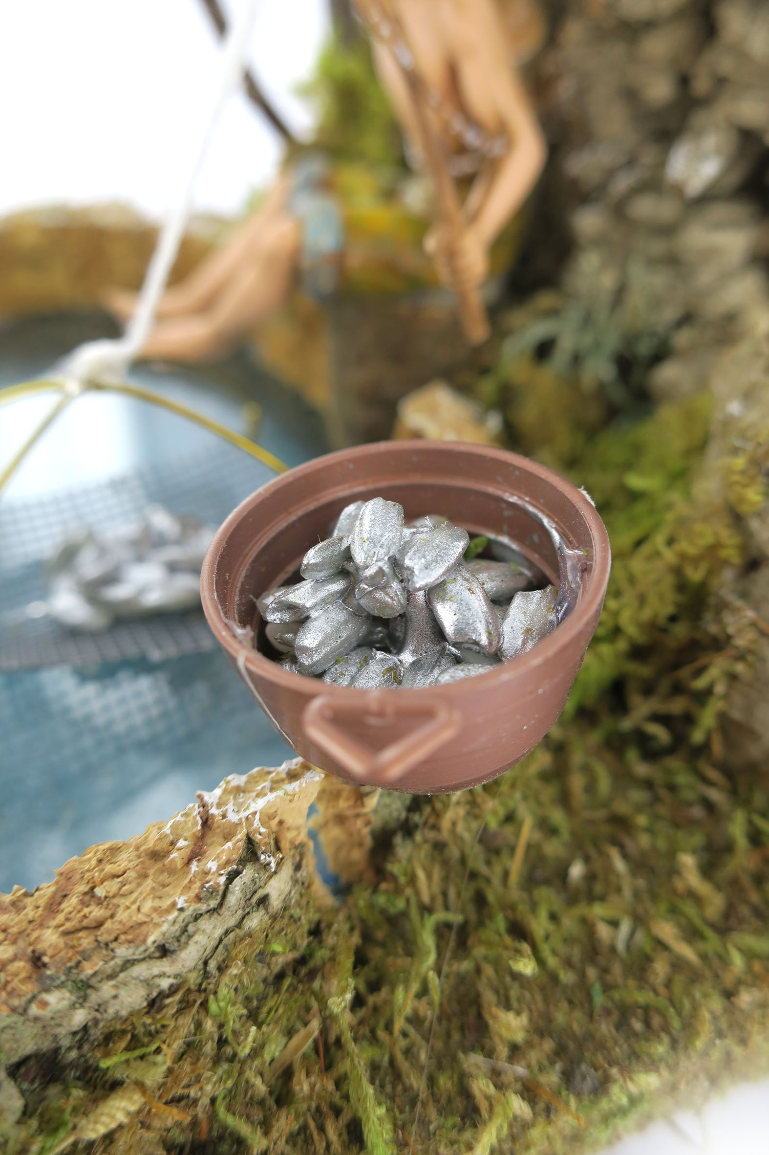 Statuine presepe: Pescatore A Rete. Dimensioni: 17 x 14 x 17 cm (la statuina misura 10 cm). Materiali: Legno, sughero e muschio (statuina in plastica). Realizzato artigianalmente in Italia.