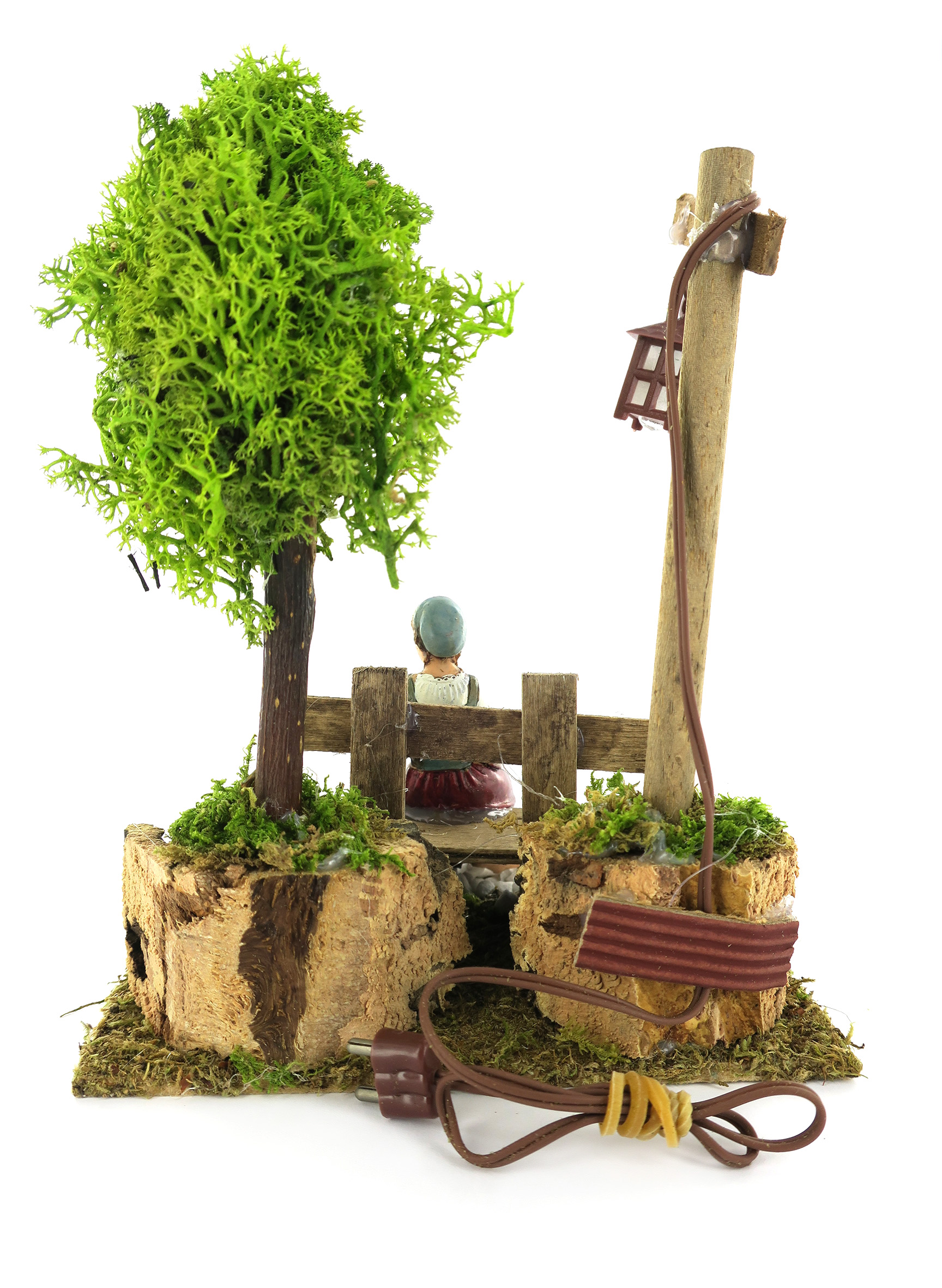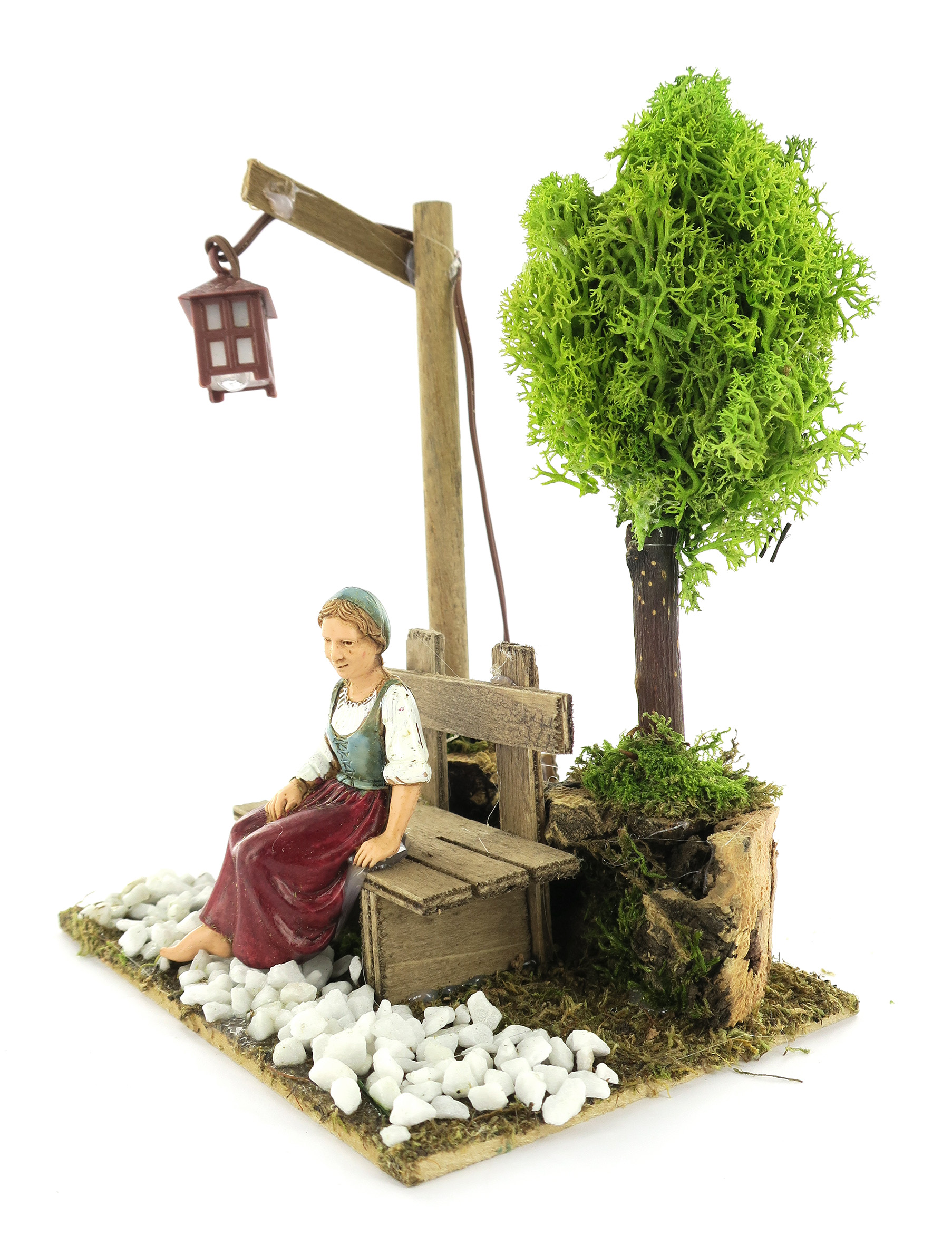 Accessori per presepe: Panchina, lampione e donna Seduta.
