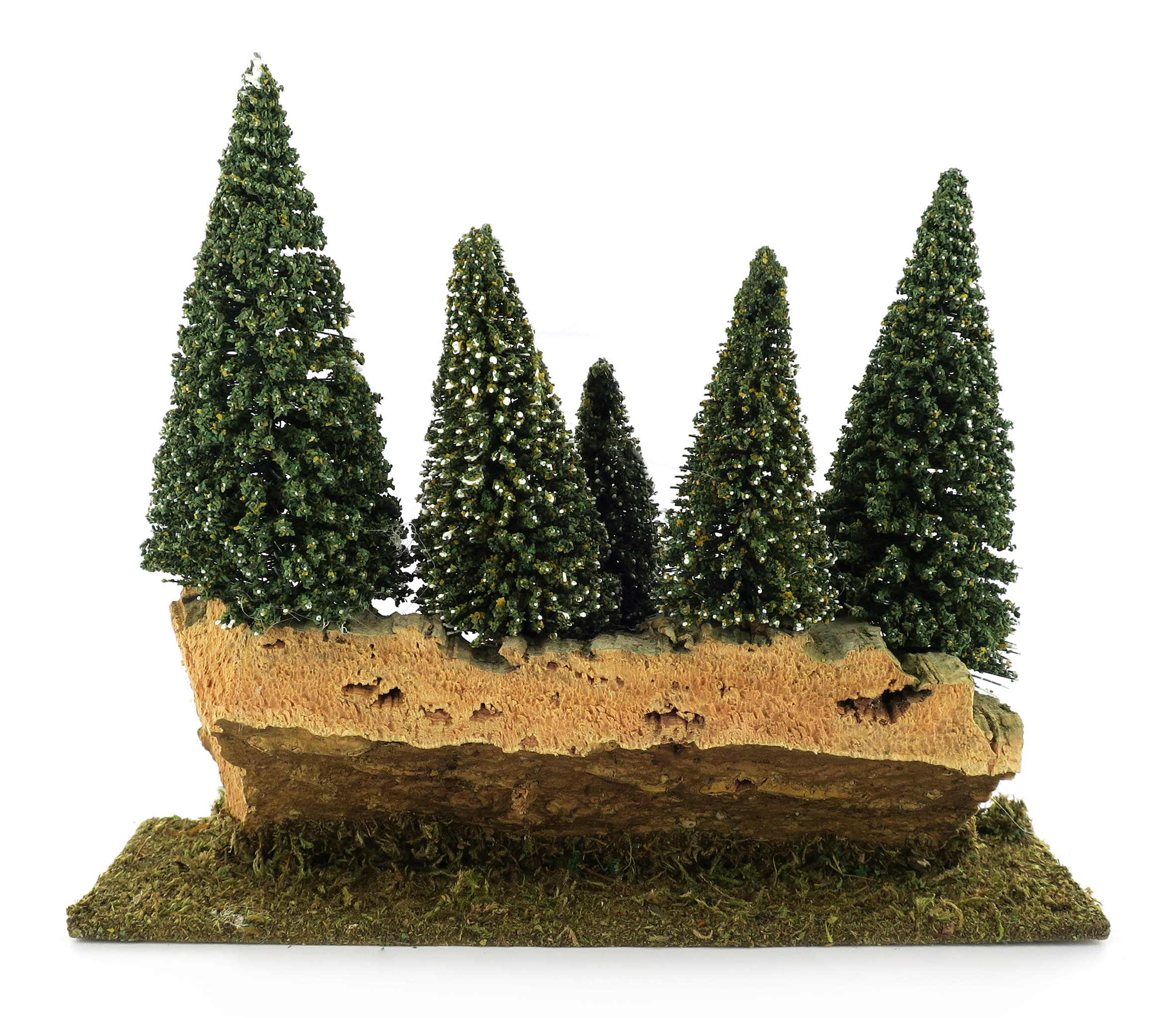 Accessori per presepe: collina con bosco di pini. Dimensioni: 19 x 7 x 15 cm. Materiali: legno, sughero e segatura. Realizzato artigianalmente in Italia.