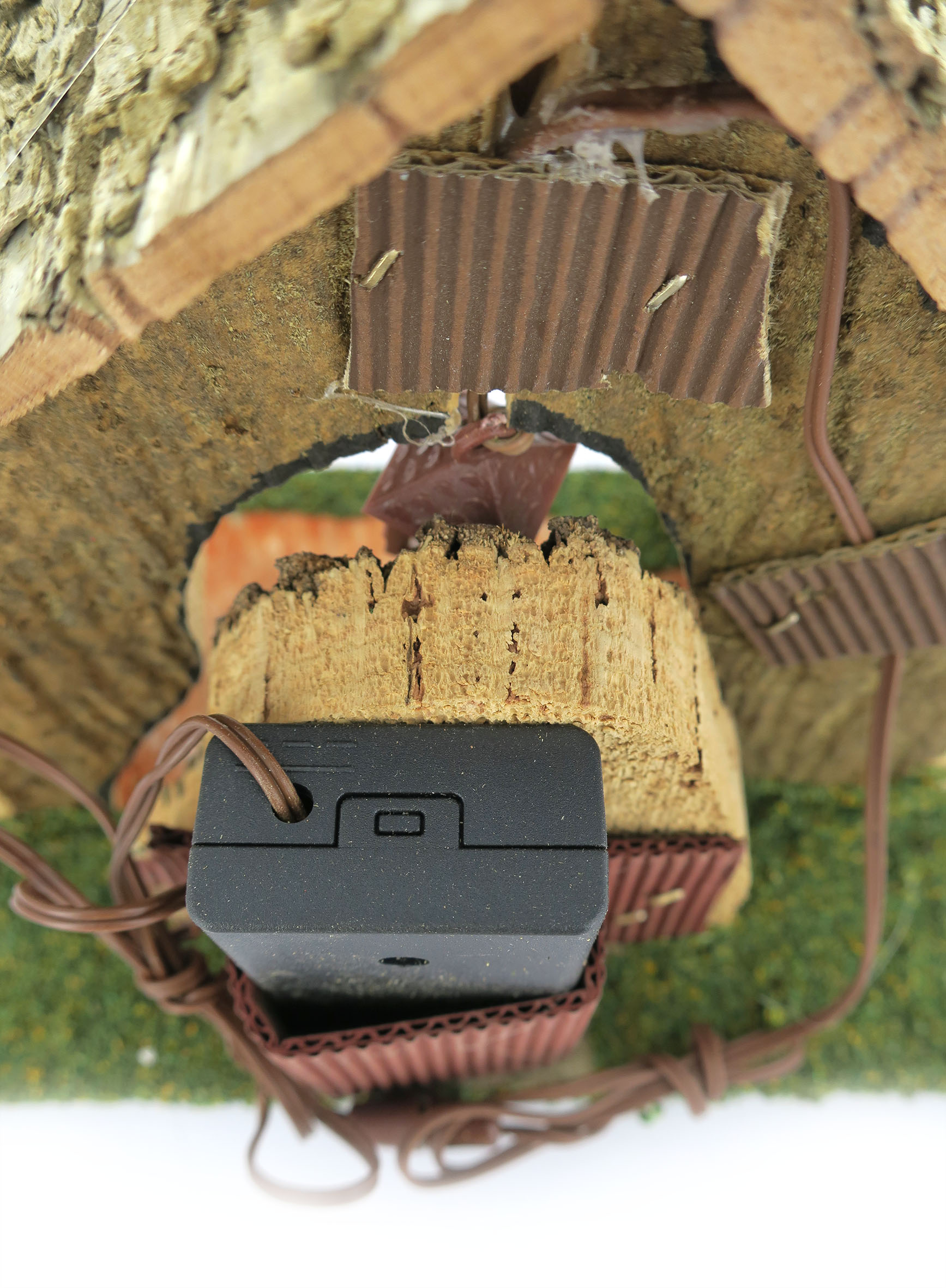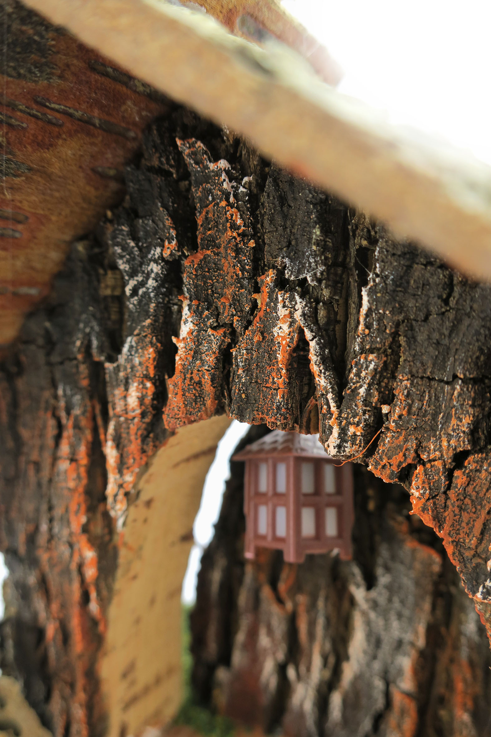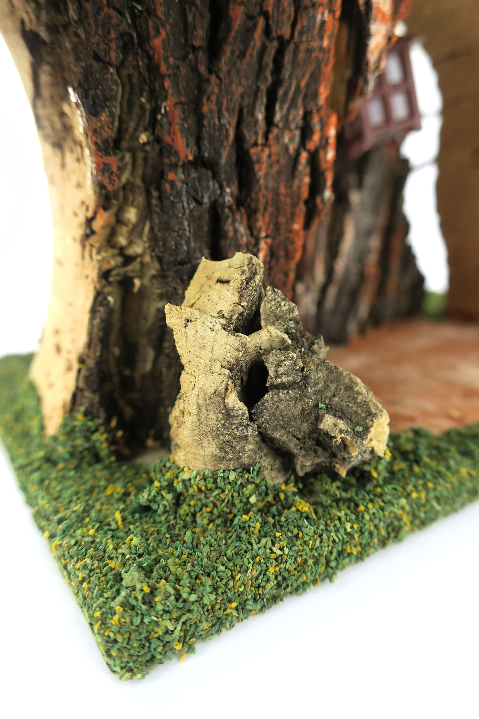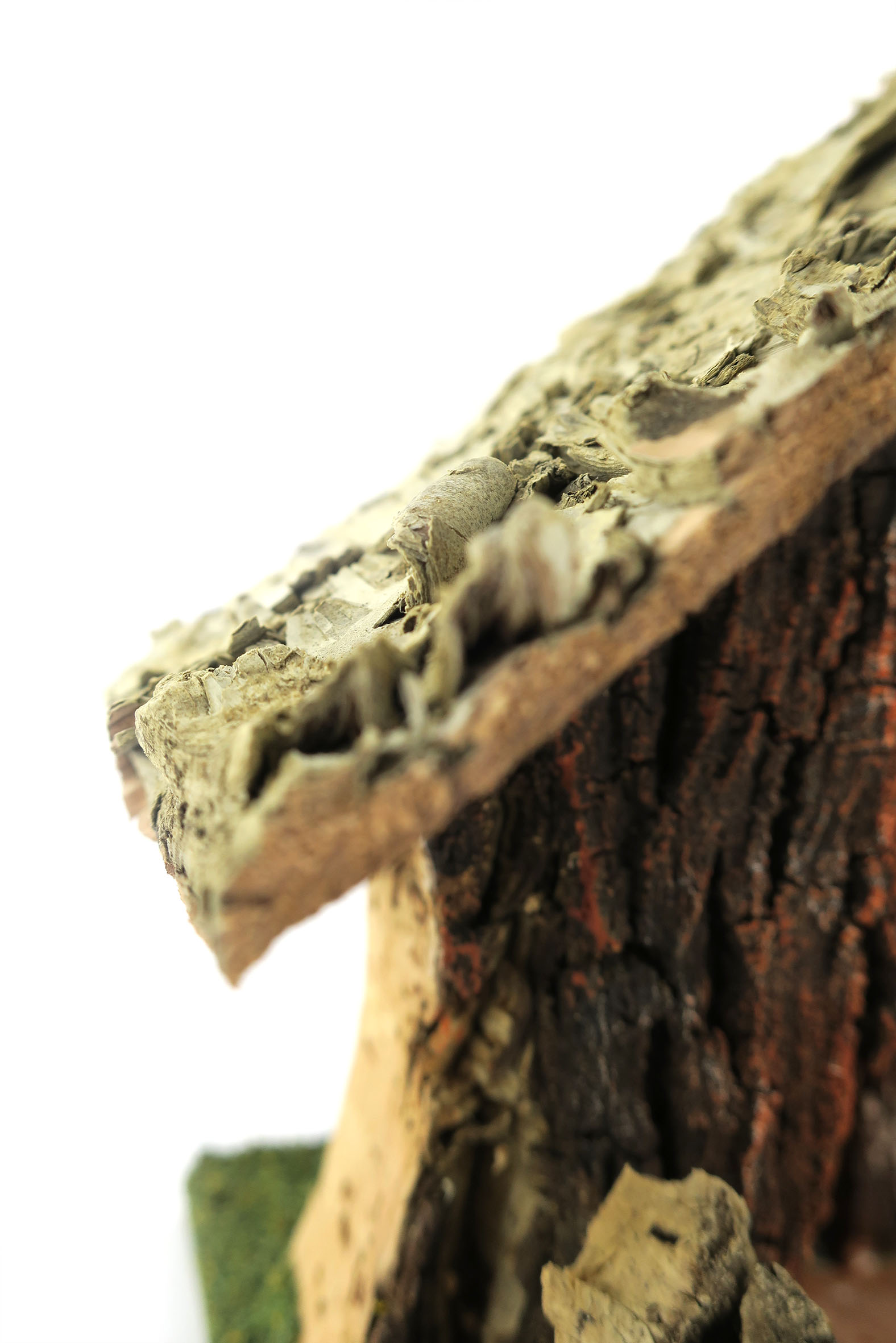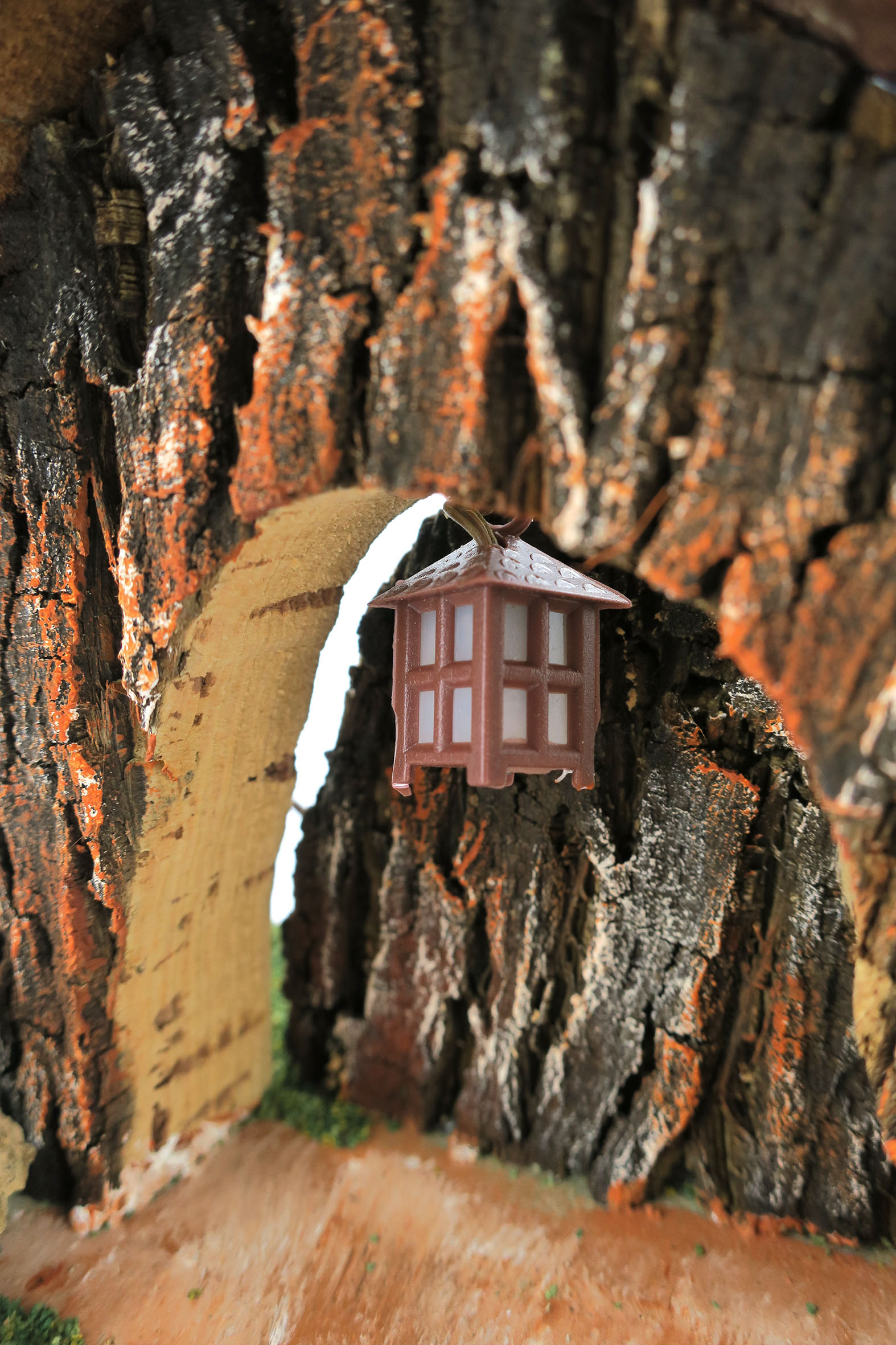 Capanna vuota con lanterna. Alimentazione: a batteria. Dimensioni: 16 x 10 x 14 cm. Materiali: Legno, Sughero e Plastica. Realizzato artigianalmente in Italia.