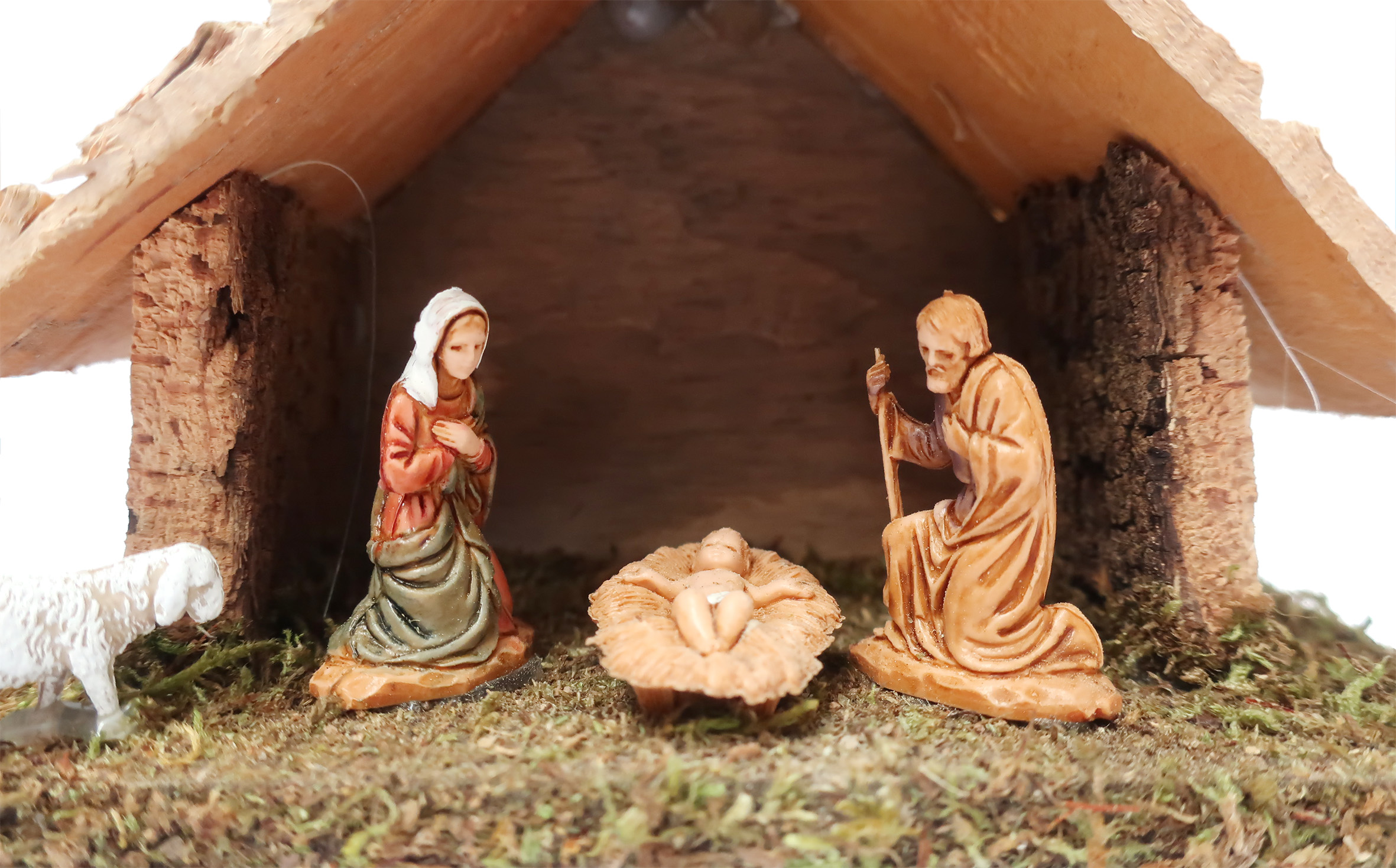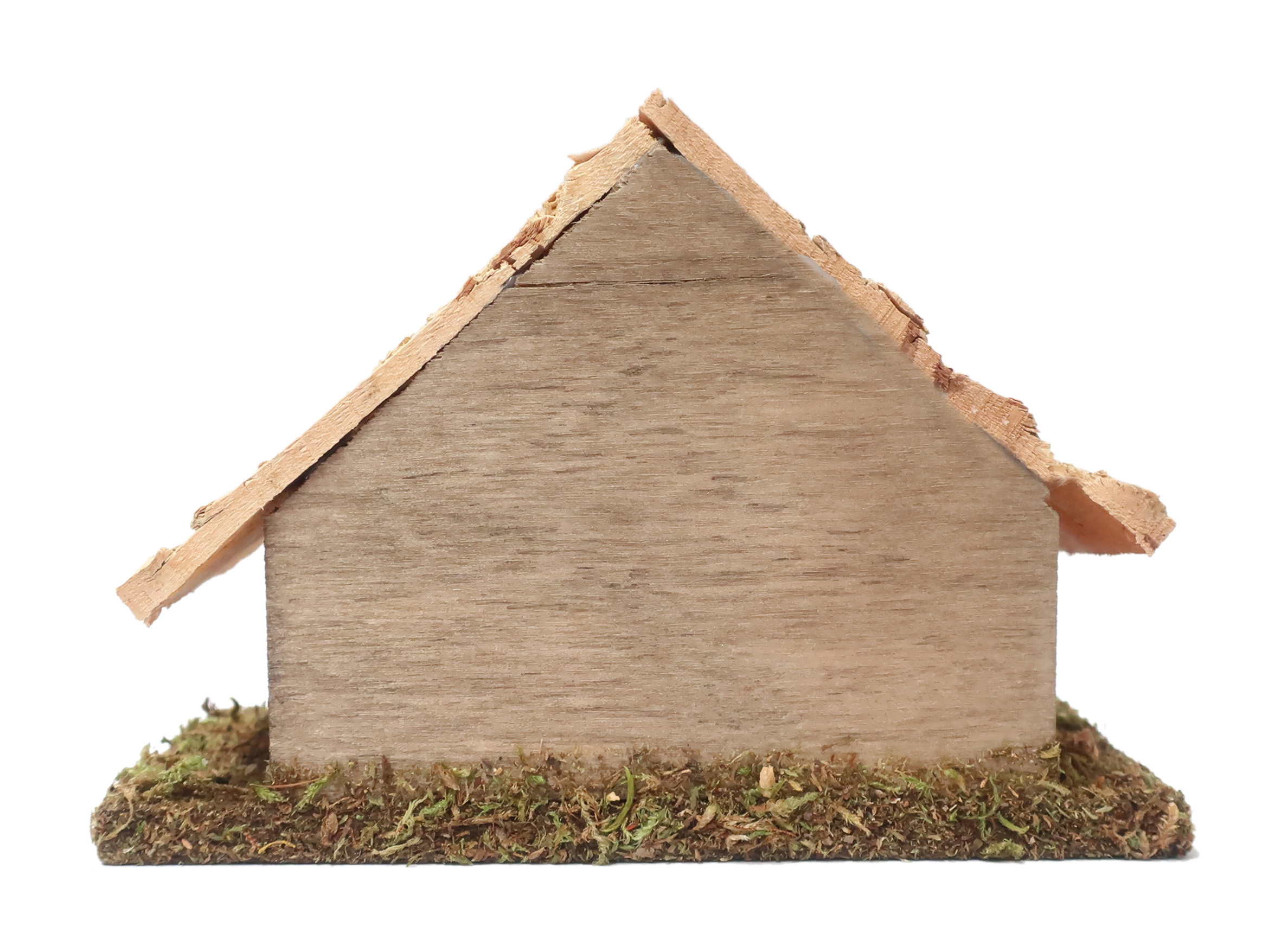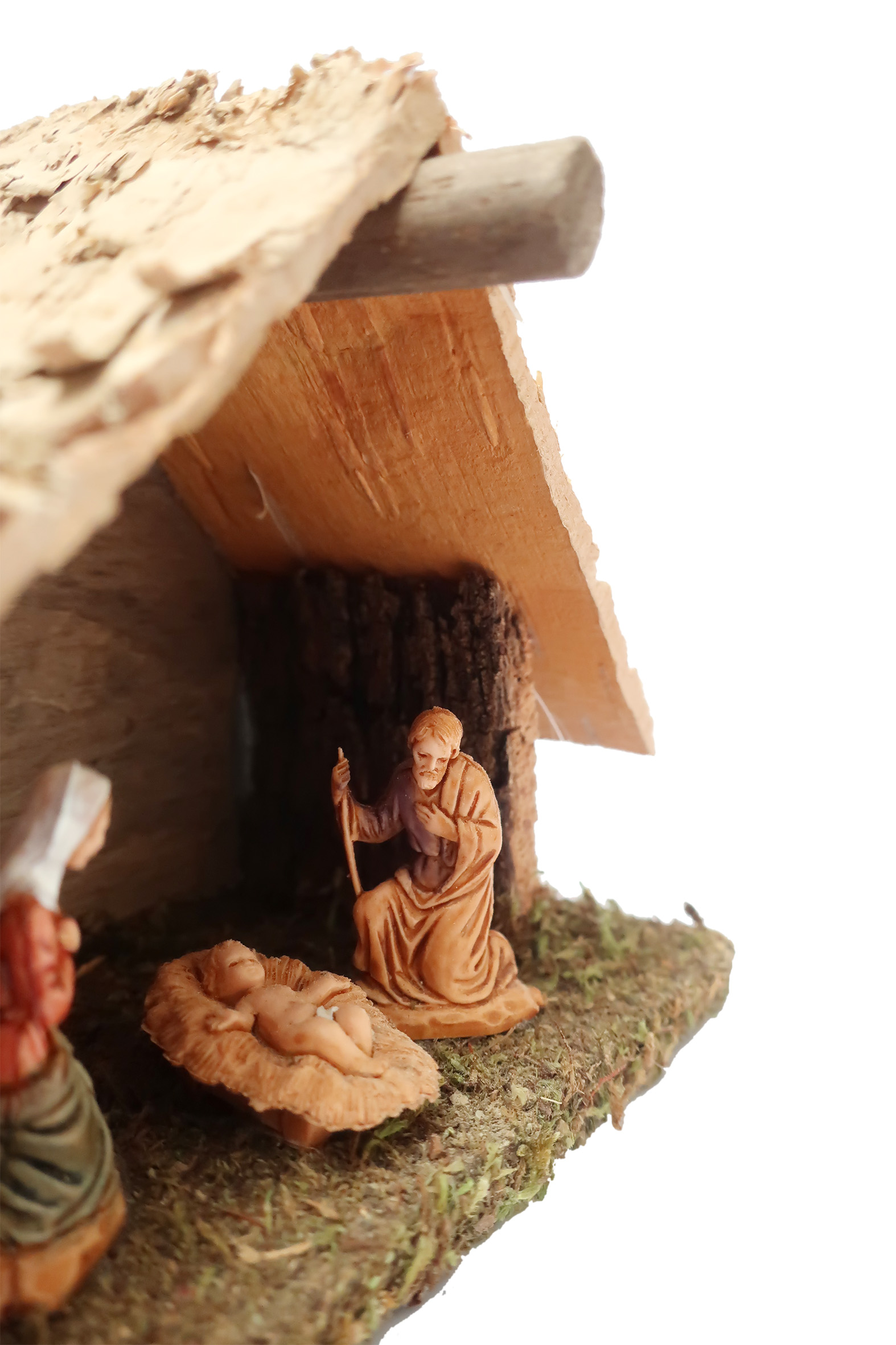 Capanna in legno e sughero, completa di 3 statuine in resina da 3,5 cm e 1 pecora