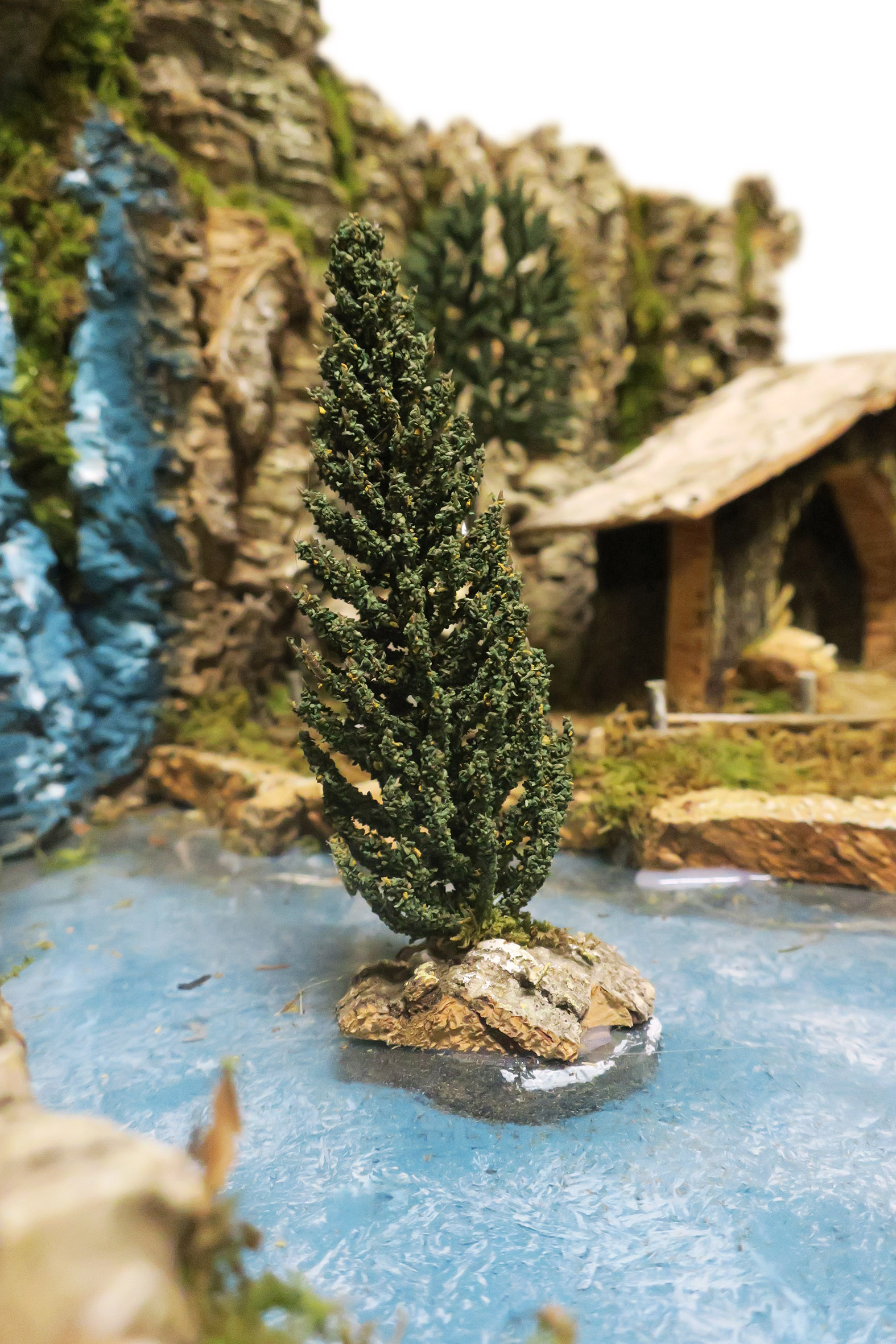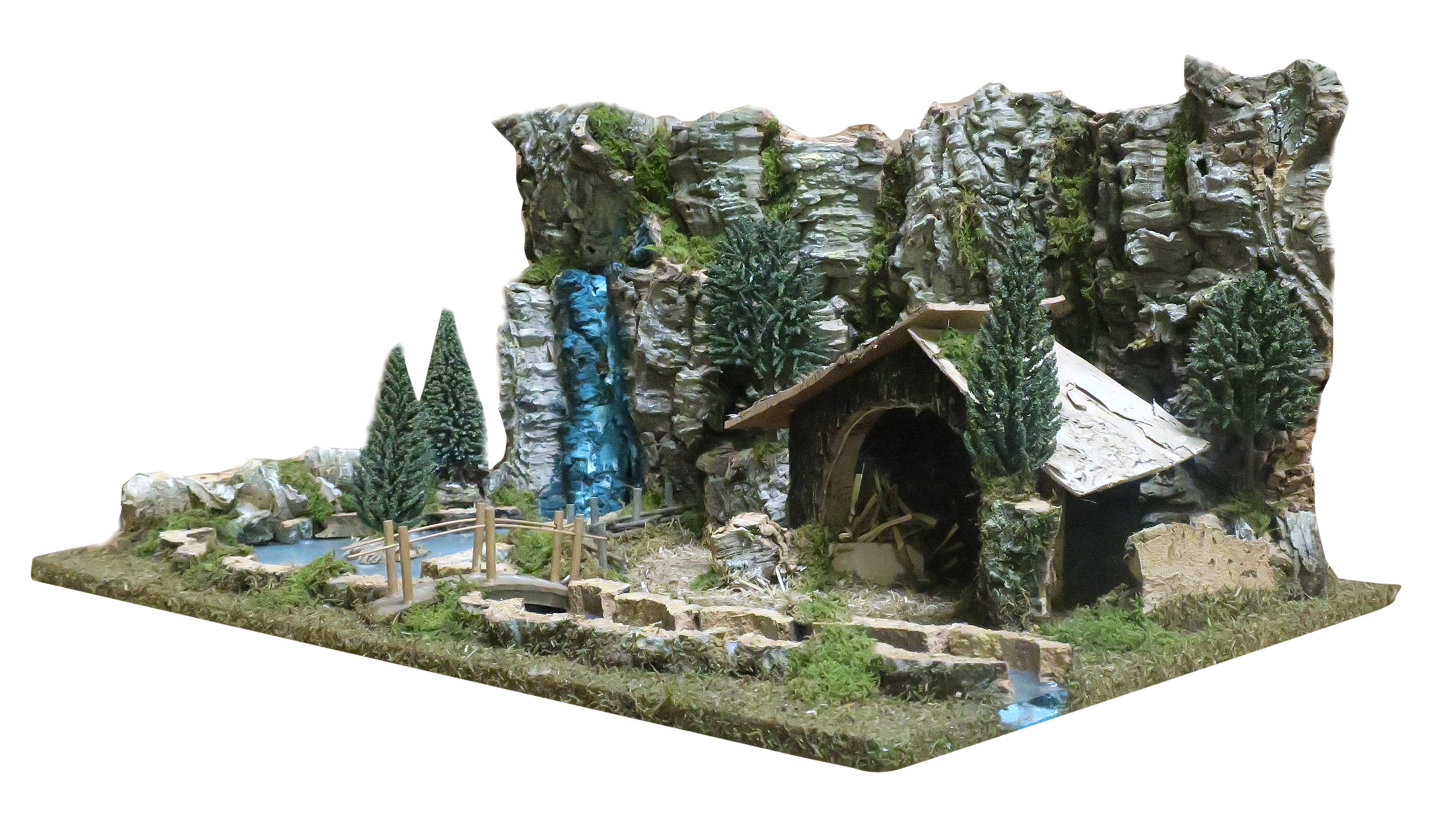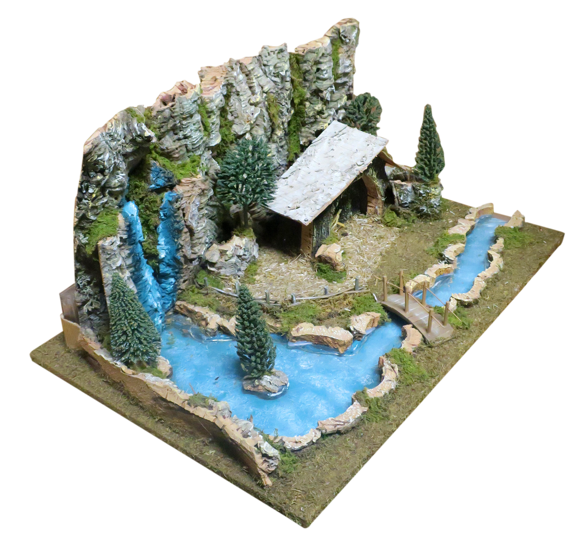 Accessori per presepe: Paesaggio con fiume luminoso. Il tratto di fiume è illuminato da LED a luce fredda atti a ricreare l'effetto acqua. Alimentazione: batterie (non incluse). Questo bellissimo paesaggio per presepe è compatibile con statuine della linea da 6 o 7 centimetri. La scenografia per presepe è la ricostruzione di una parete naturale (resa con sughero), dove si trova una cascata (dipinta) e un fiumiciattolo. Tale fiume è espandibile con altri tratti di fiume della medesima linea di prodotti per presepi. Il corso d'acqua (simulato da una pellicola di plastica, quindi non compatibile con l'uso di acqua o liquidi) è illuminato da LED per donare maggiore fascino alla scena. La fedele resa degli elementi naturali è ottenuta grazie al sapiente uso di sughero e muschio. In prossimità del corso del fiume / torrente, vi è una capanna in legno atta ad ospitare le statuine della sacra famiglia, l'asinello e il bue. Questa scenografica per presepe è stata realizzata per poter essere usata con statuine della linea da 6 o 7 cm. Dimensioni: 36 x 56 x 25 cm. Realizzato artigianalmente in Italia.