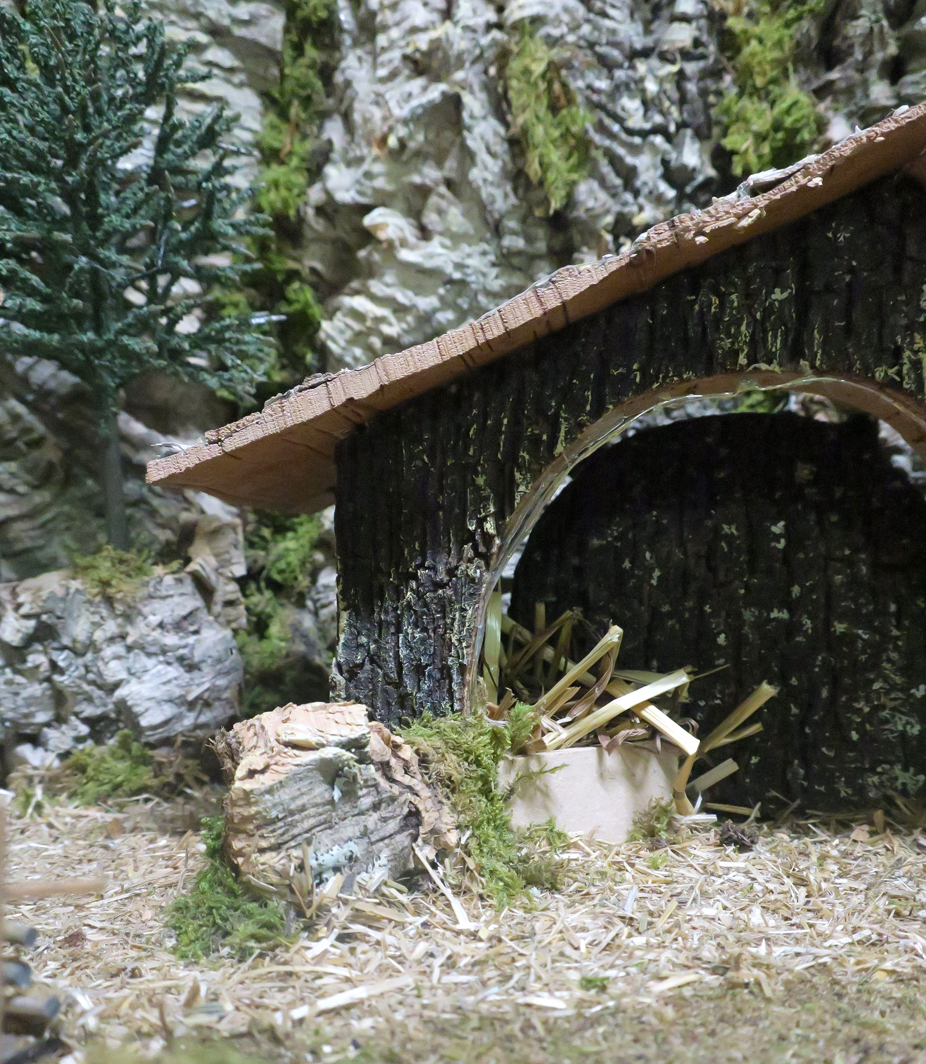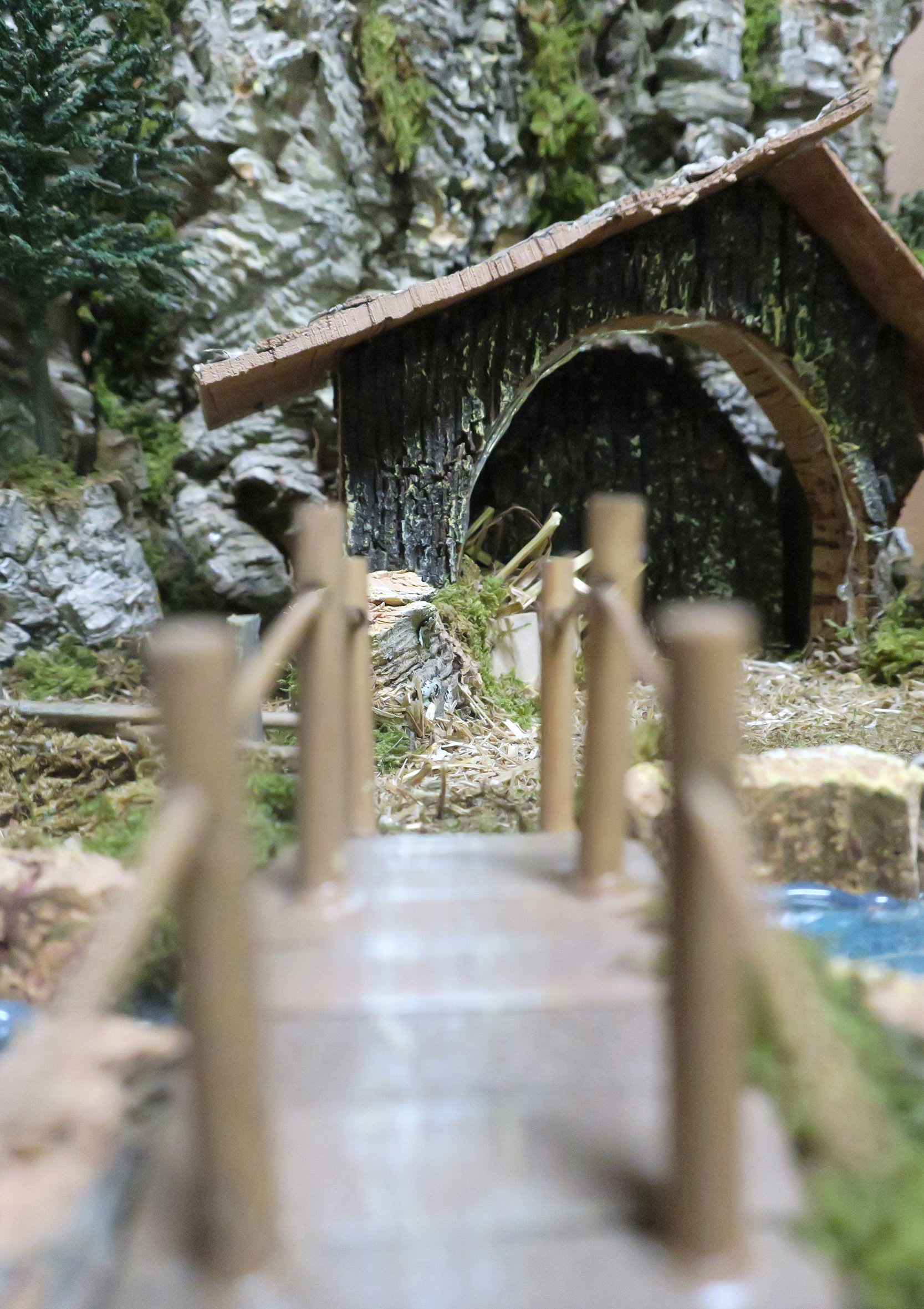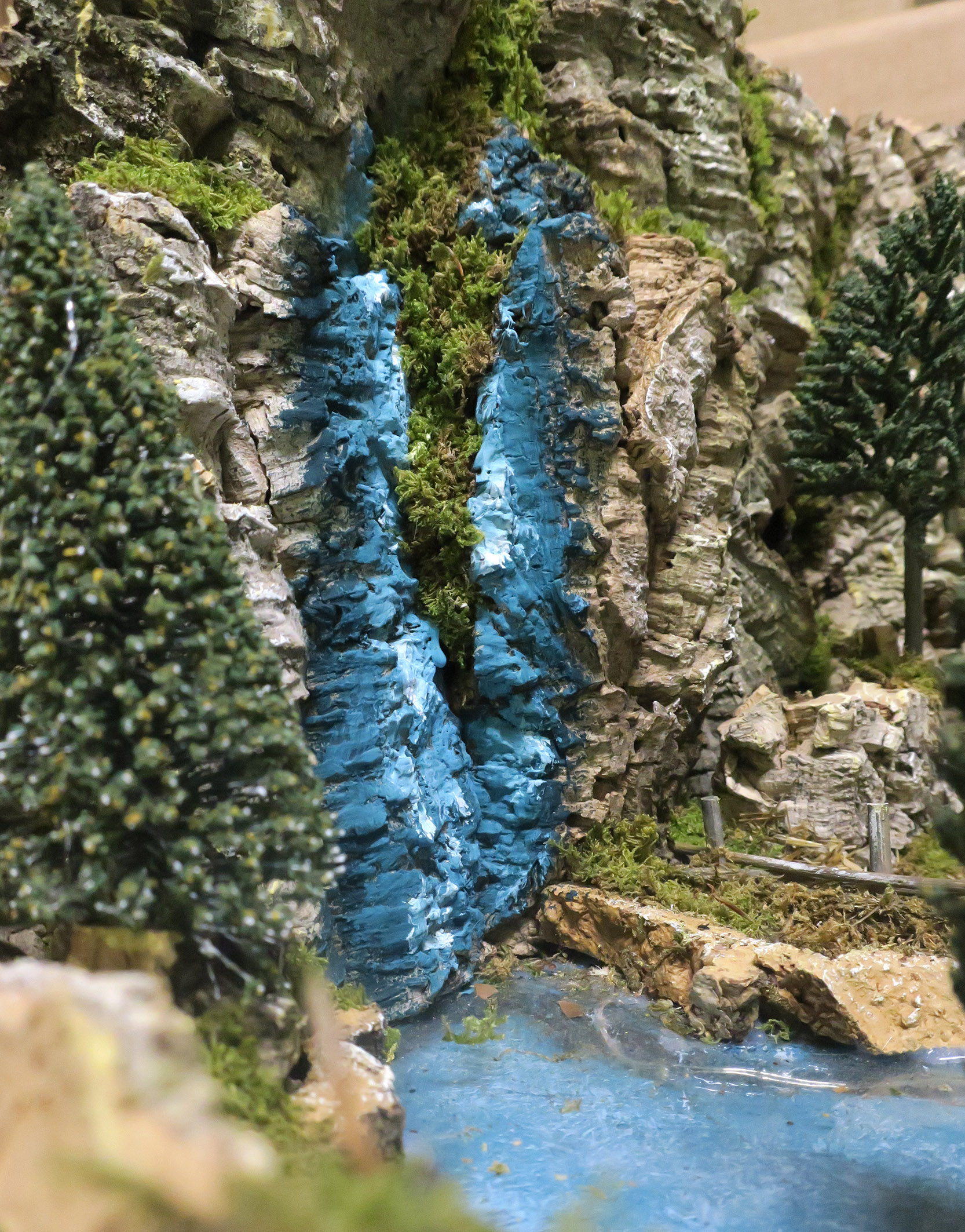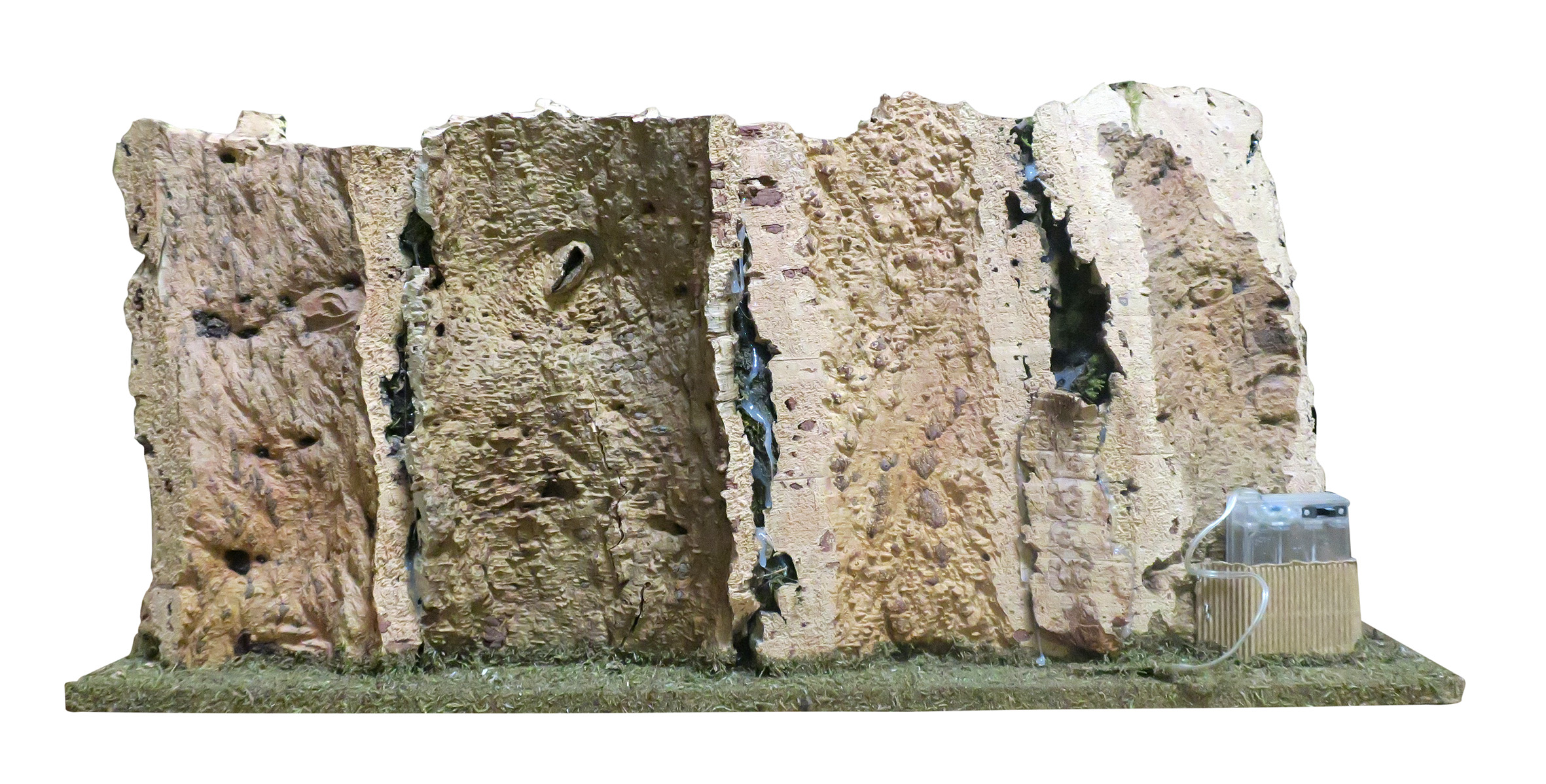 Accessori per presepe: Paesaggio con fiume luminoso. Il tratto di fiume è illuminato da LED a luce fredda atti a ricreare l'effetto acqua. Alimentazione: batterie (non incluse). Questo bellissimo paesaggio per presepe è compatibile con statuine della linea da 6 o 7 centimetri. La scenografia per presepe è la ricostruzione di una parete naturale (resa con sughero), dove si trova una cascata (dipinta) e un fiumiciattolo. Tale fiume è espandibile con altri tratti di fiume della medesima linea di prodotti per presepi. Il corso d'acqua (simulato da una pellicola di plastica, quindi non compatibile con l'uso di acqua o liquidi) è illuminato da LED per donare maggiore fascino alla scena. La fedele resa degli elementi naturali è ottenuta grazie al sapiente uso di sughero e muschio. In prossimità del corso del fiume / torrente, vi è una capanna in legno atta ad ospitare le statuine della sacra famiglia, l'asinello e il bue. Questa scenografica per presepe è stata realizzata per poter essere usata con statuine della linea da 6 o 7 cm. Dimensioni: 36 x 56 x 25 cm. Realizzato artigianalmente in Italia.
