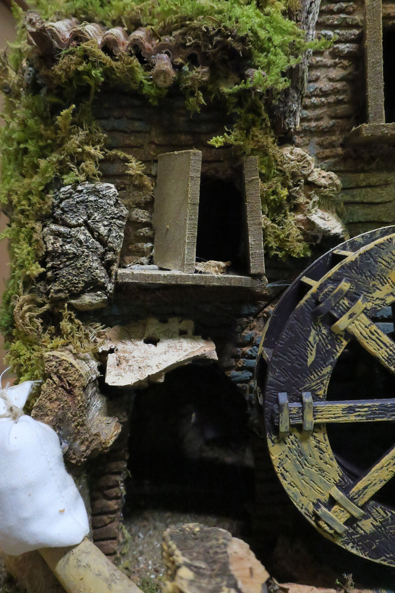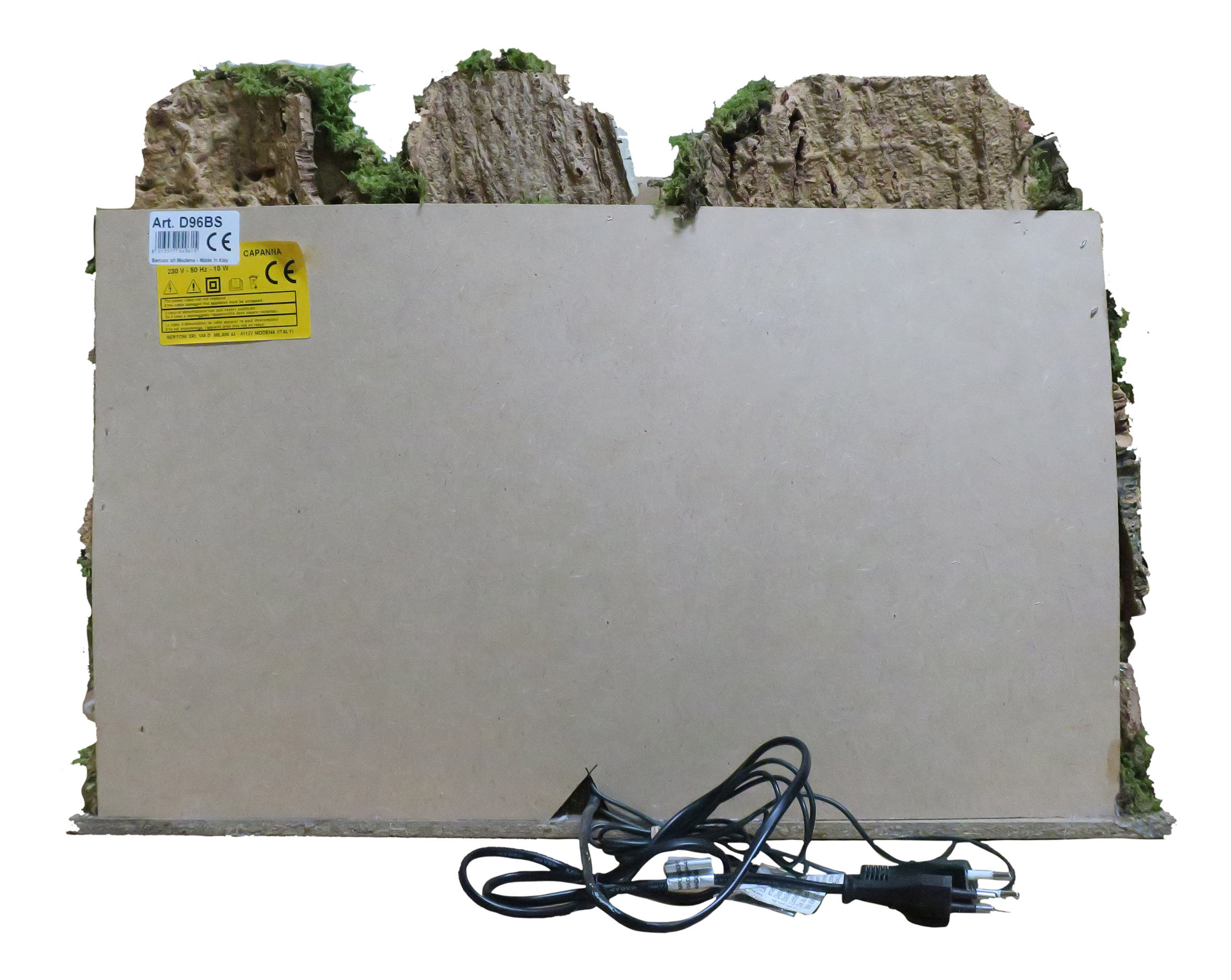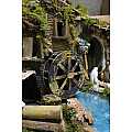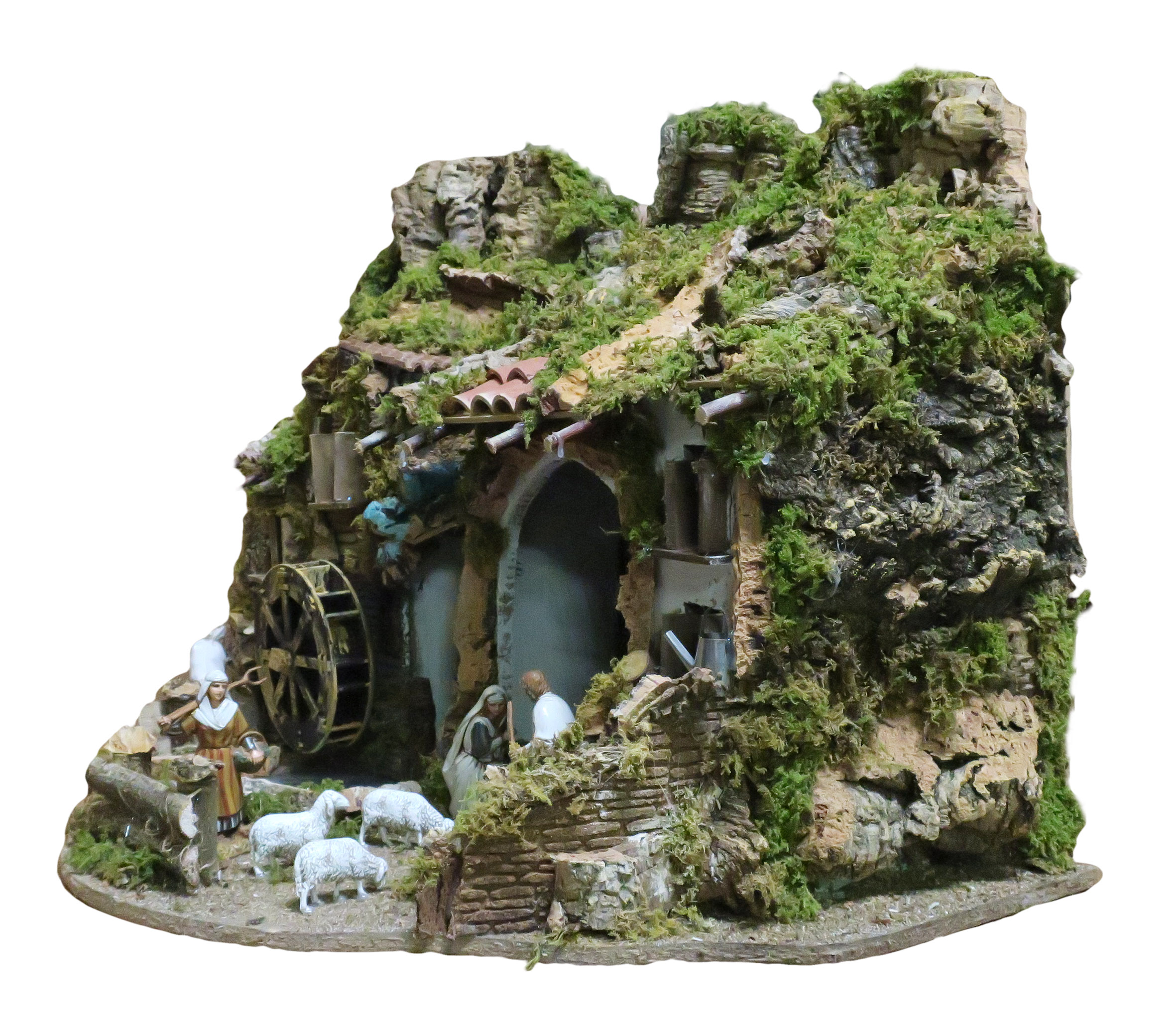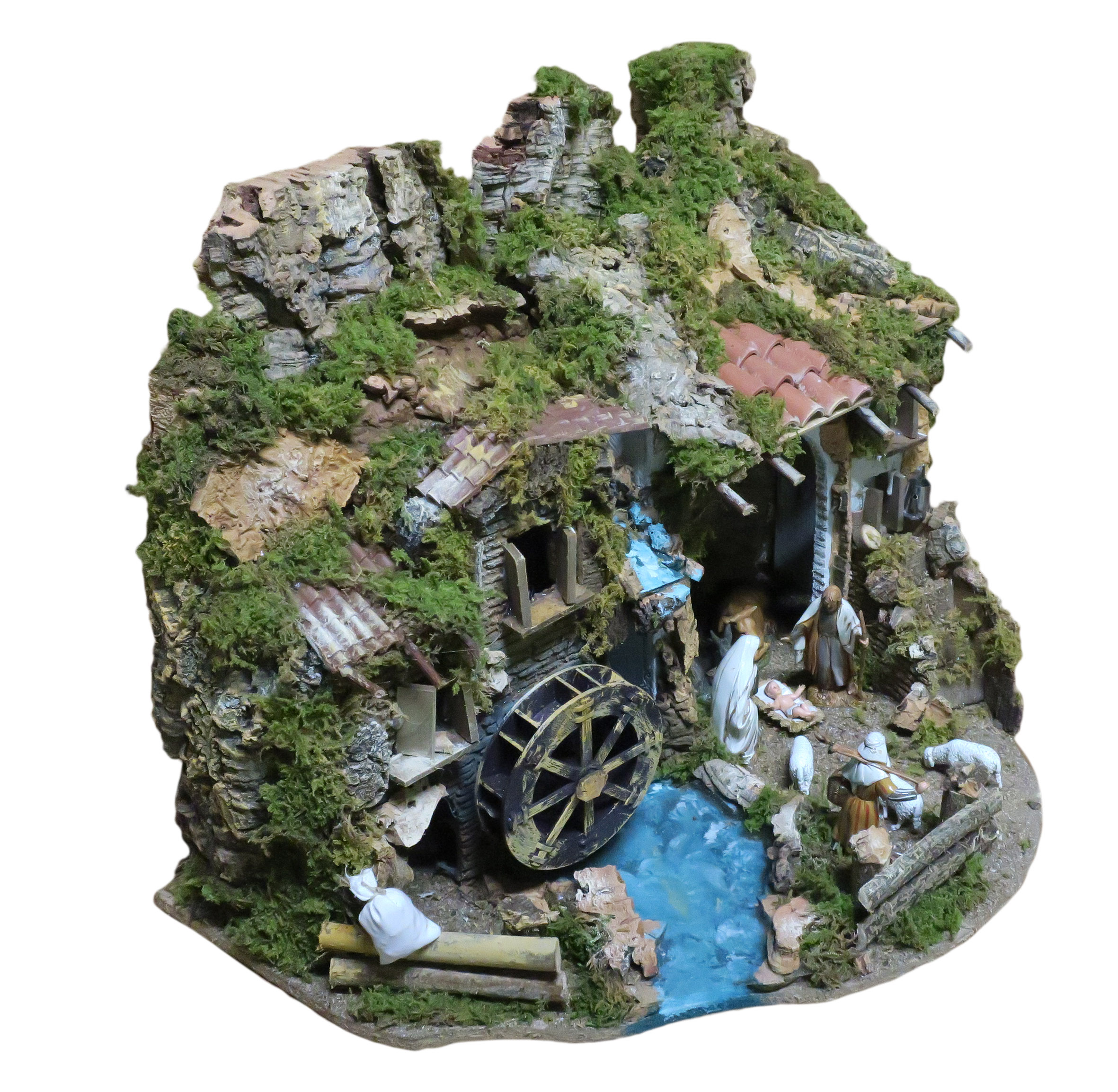 Villaggio con luci, mulino e cascata, completo di 6 statuine in resina da 10 cm e 3 pecore. Accessori elettrici: luci, cascata con acqua che scorre, mulino e fuoco. Alimentazione elettrica a 220 V. Altre caratteristiche: Tegole in terracotta. Dimensioni: 56 x 37 x 42 cm. Materiali: legno, sughero, stucco, muschio e plastica. Realizzato artigianalmente in Italia.