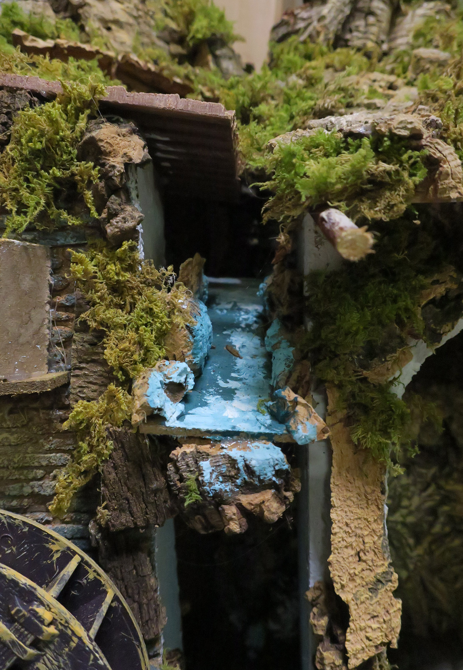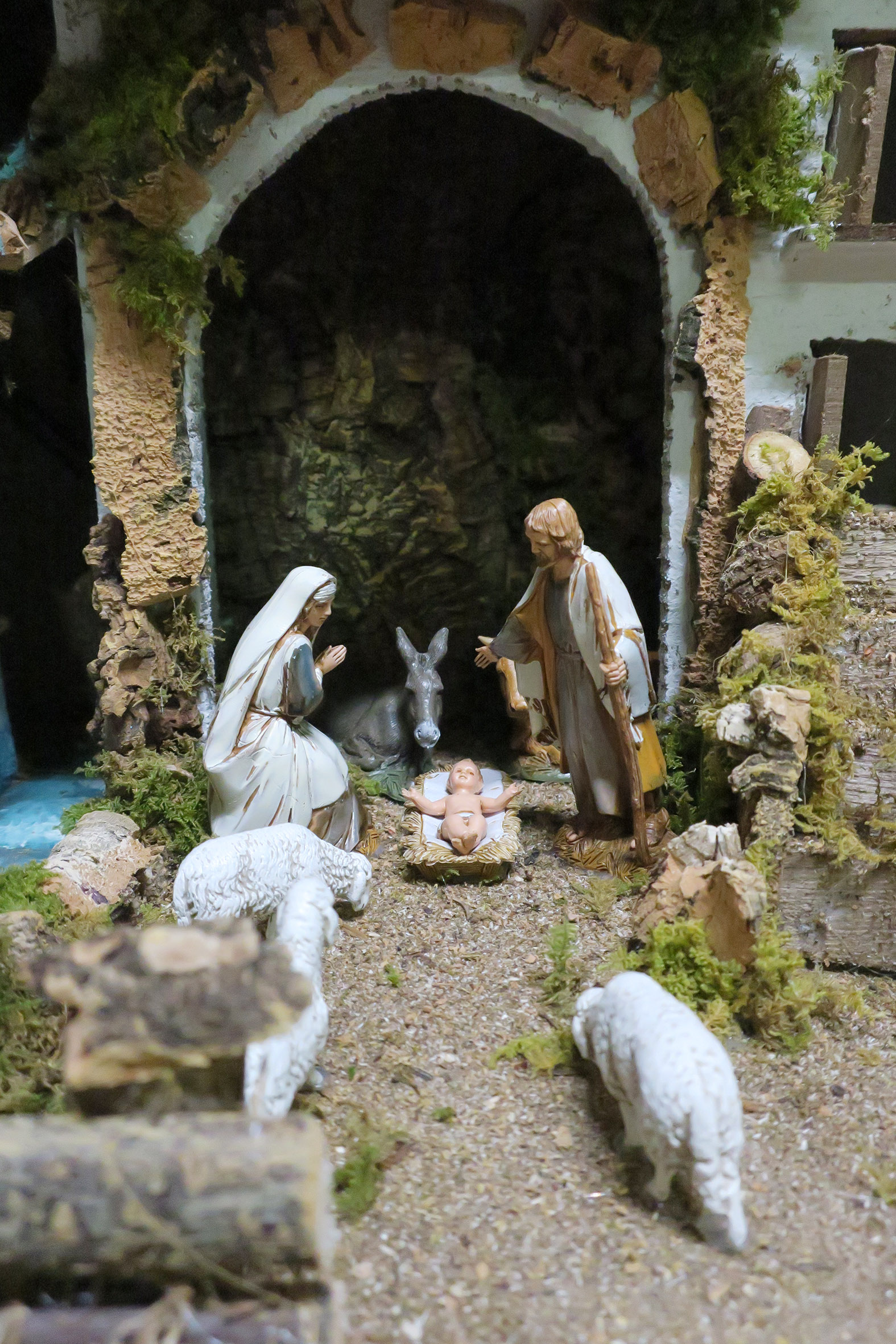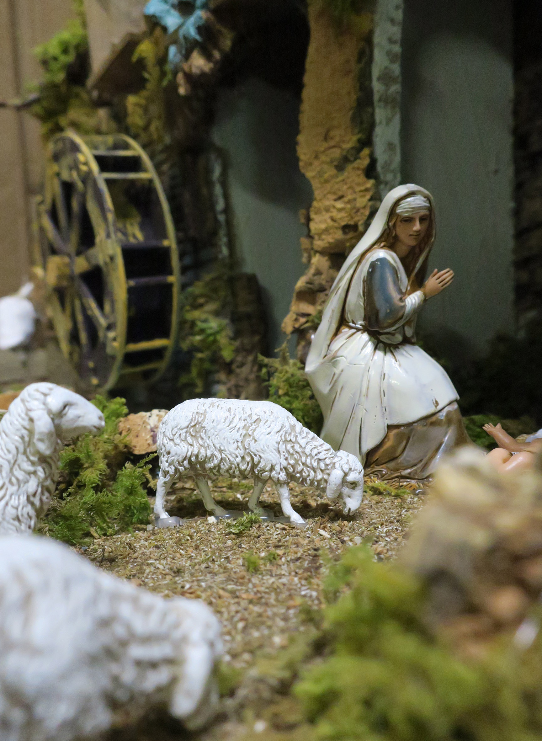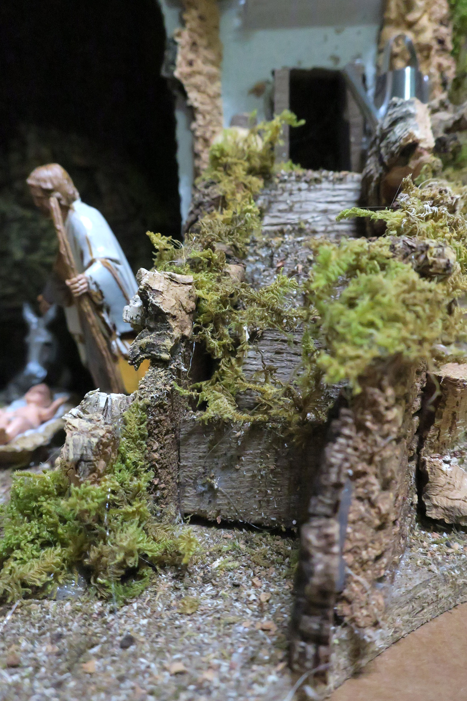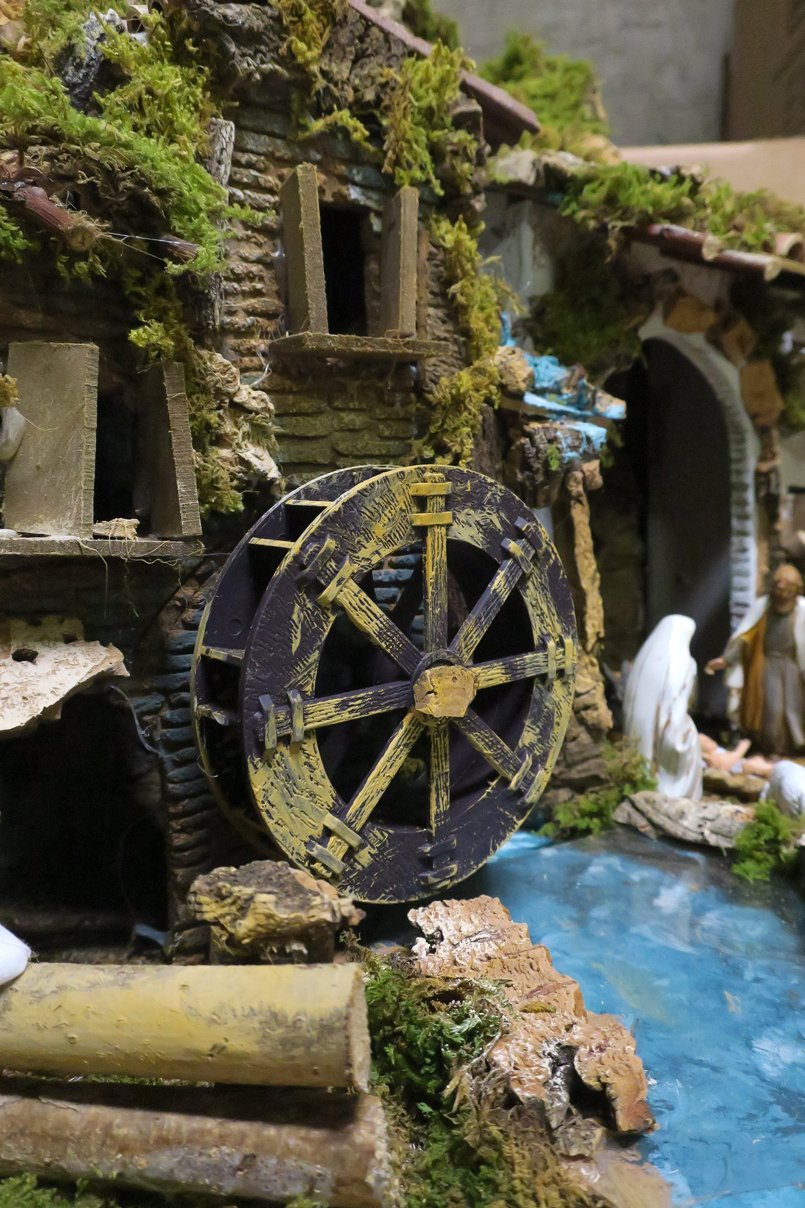 Villaggio con luci, mulino e cascata, completo di 6 statuine in resina da 10 cm e 3 pecore. Accessori elettrici: luci, cascata con acqua che scorre, mulino e fuoco. Alimentazione elettrica a 220 V. Altre caratteristiche: Tegole in terracotta. Dimensioni: 56 x 37 x 42 cm. Materiali: legno, sughero, stucco, muschio e plastica. Realizzato artigianalmente in Italia.