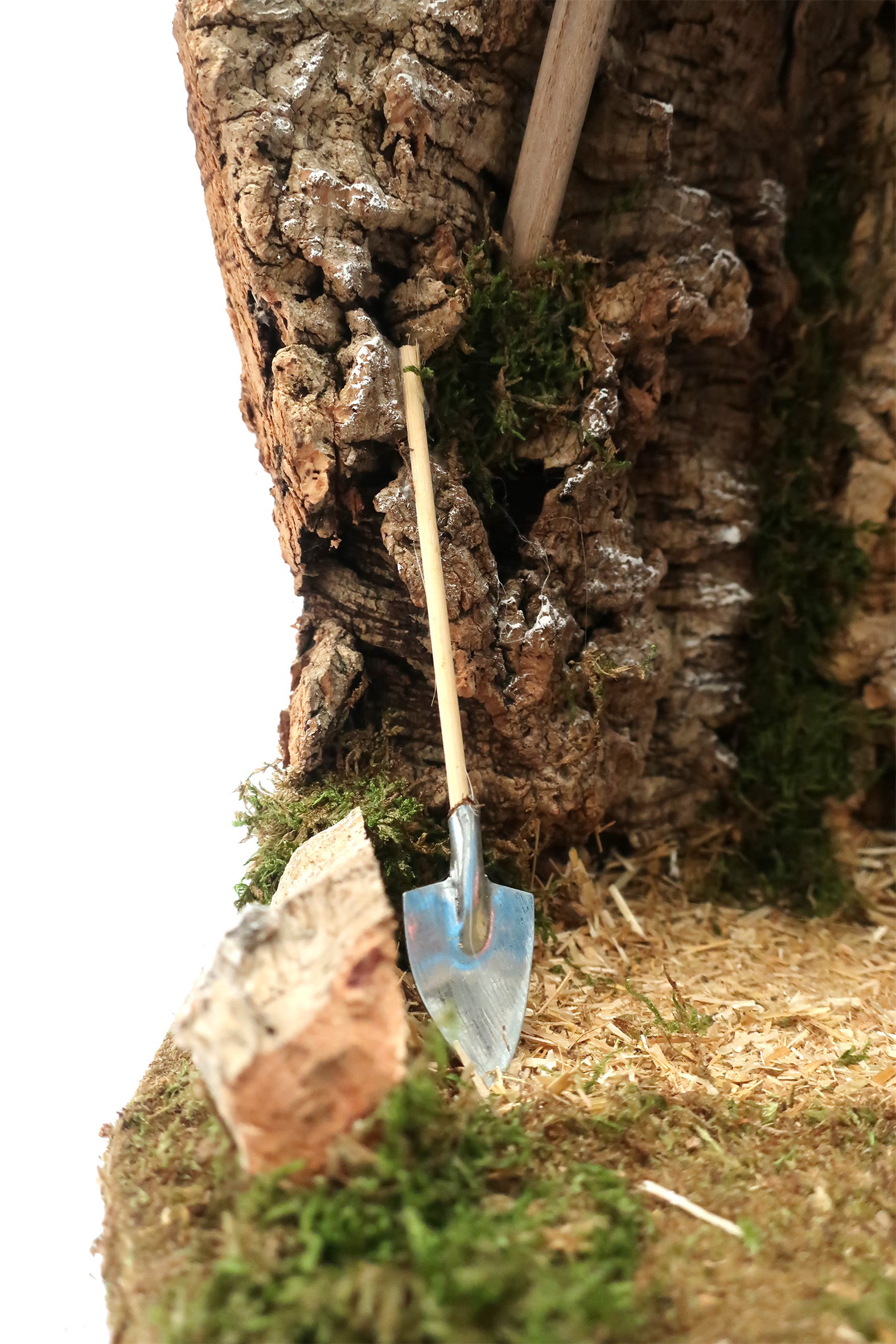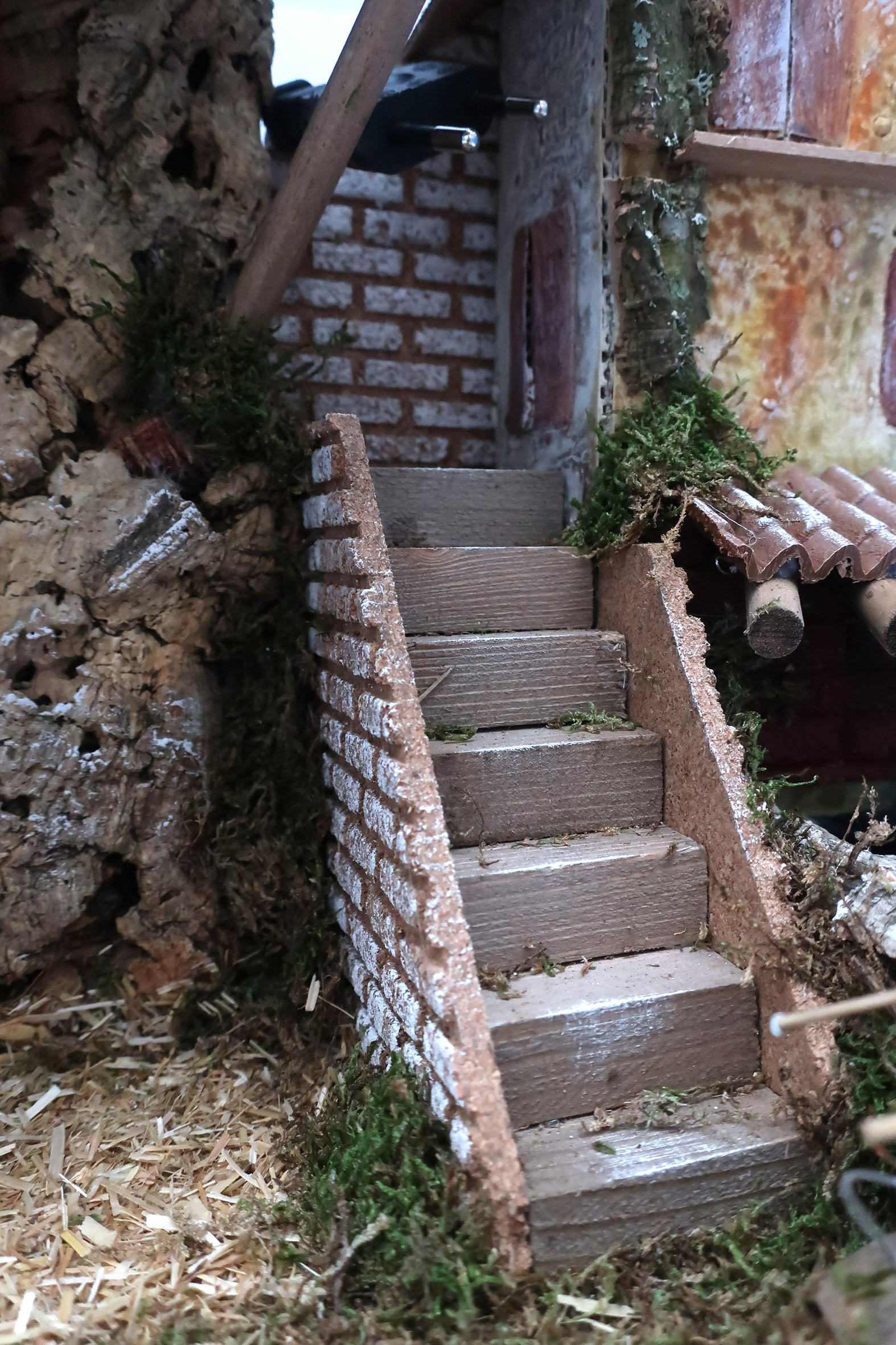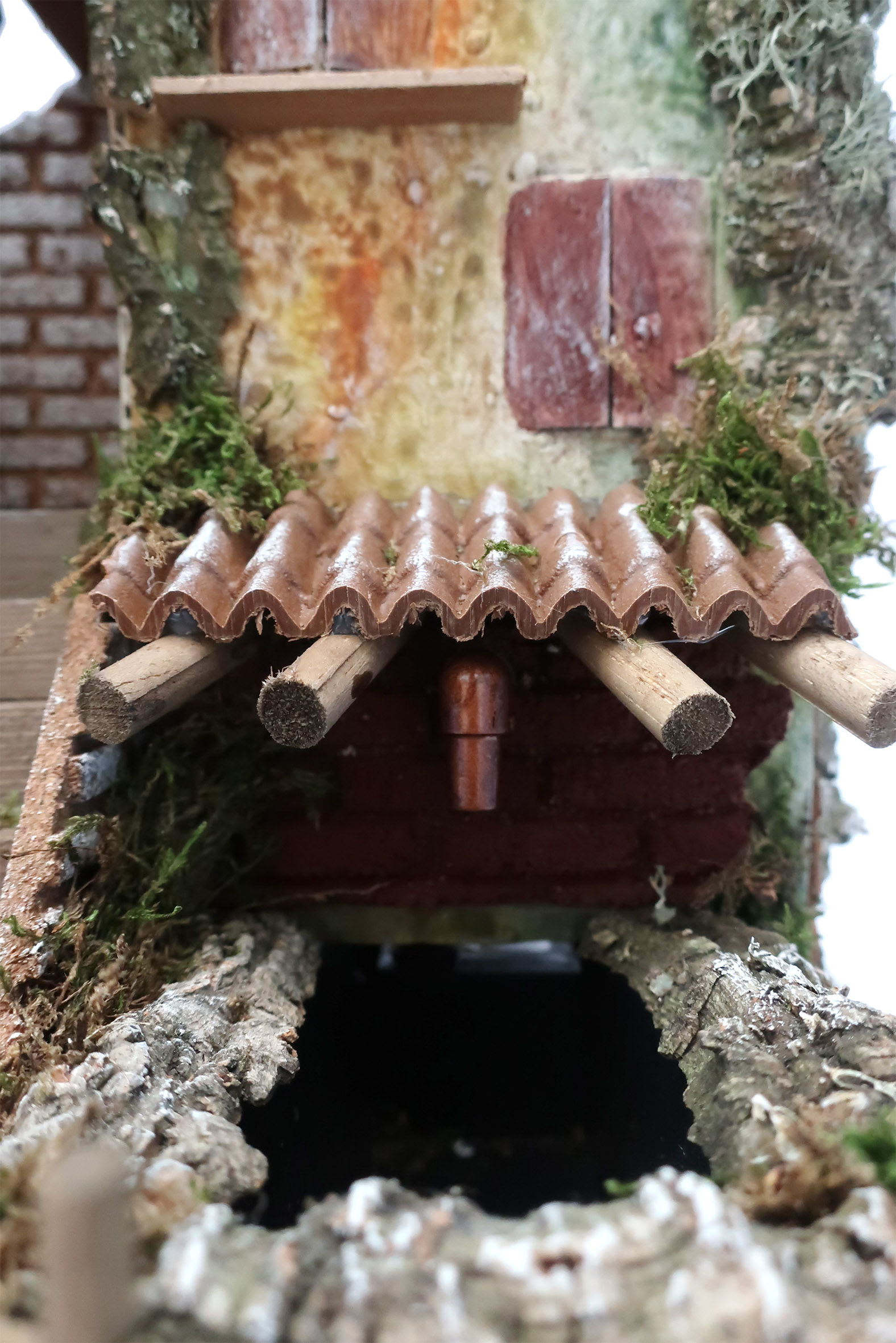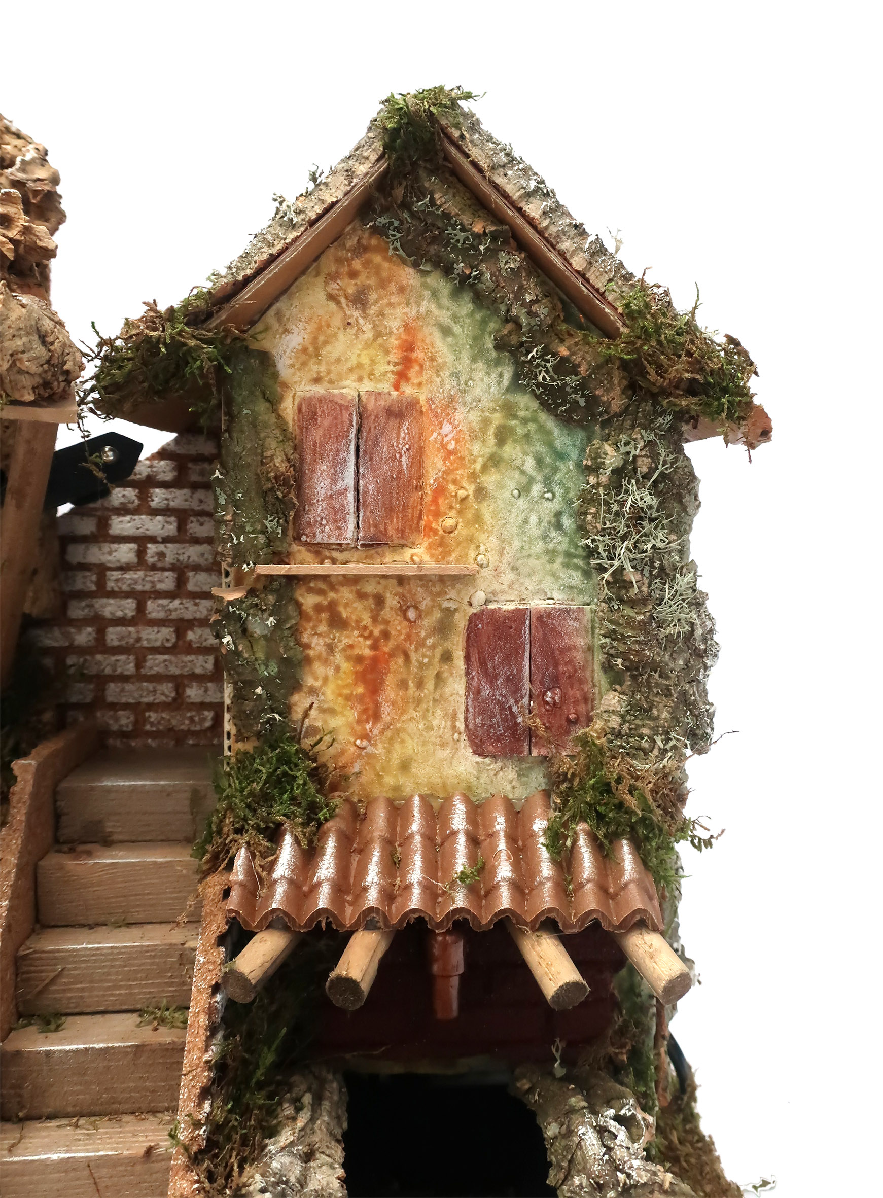 Accessori per presepe: Villaggio con fontana e fiume. L'ambientazione include uno spazio che può essere usato come capanna, coperto da un tetto grazioso fatto con tegole rosse. A lato, una riproduzione di una casetta sotto la quale trova posto una fontana elettrica da cui scende l'acqua. A completare la scena, un tratto di fiume (corso in plastica), che si puù ampliare con altri tratti d fiume della medesima Linea Presepe Bertoni.