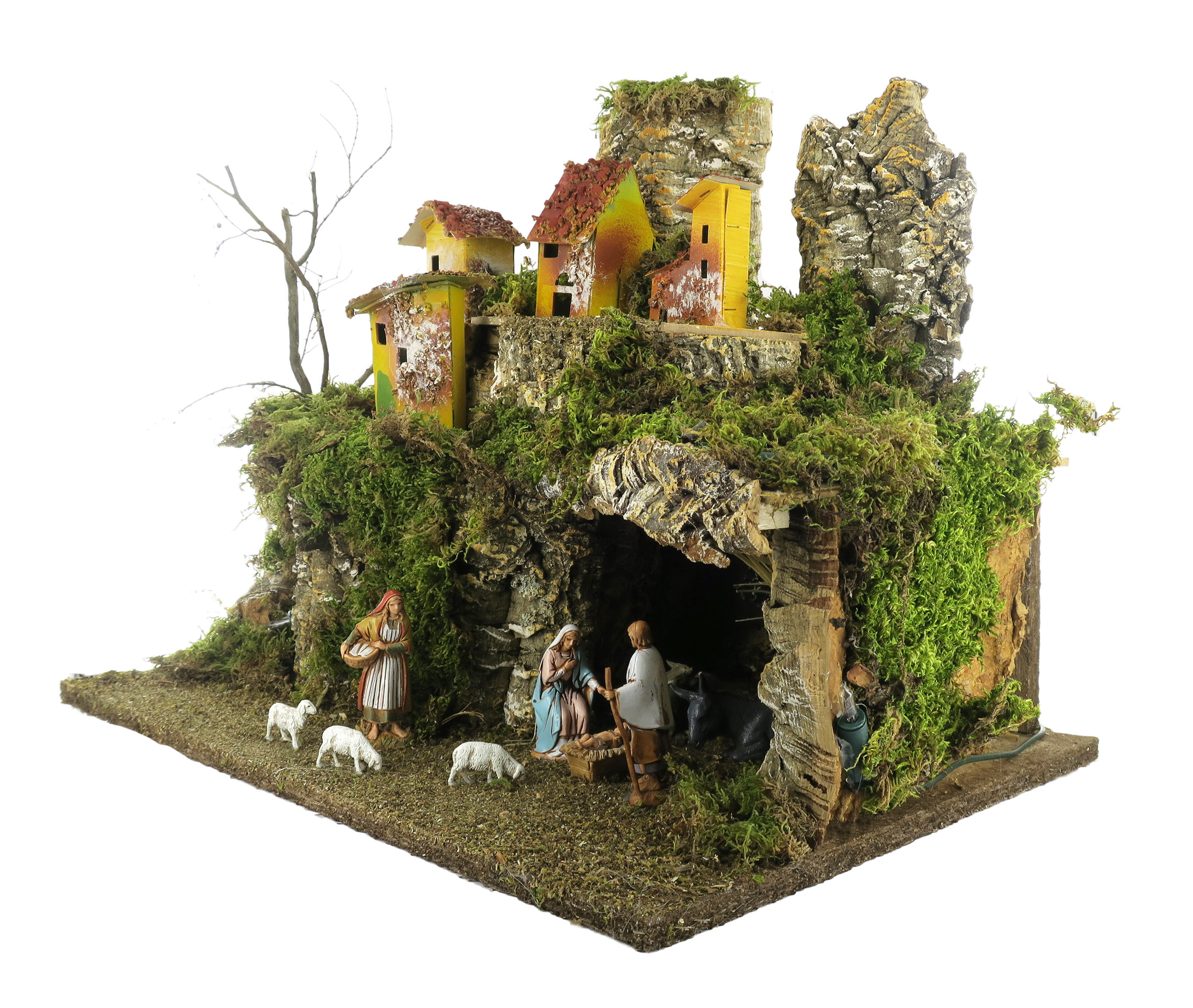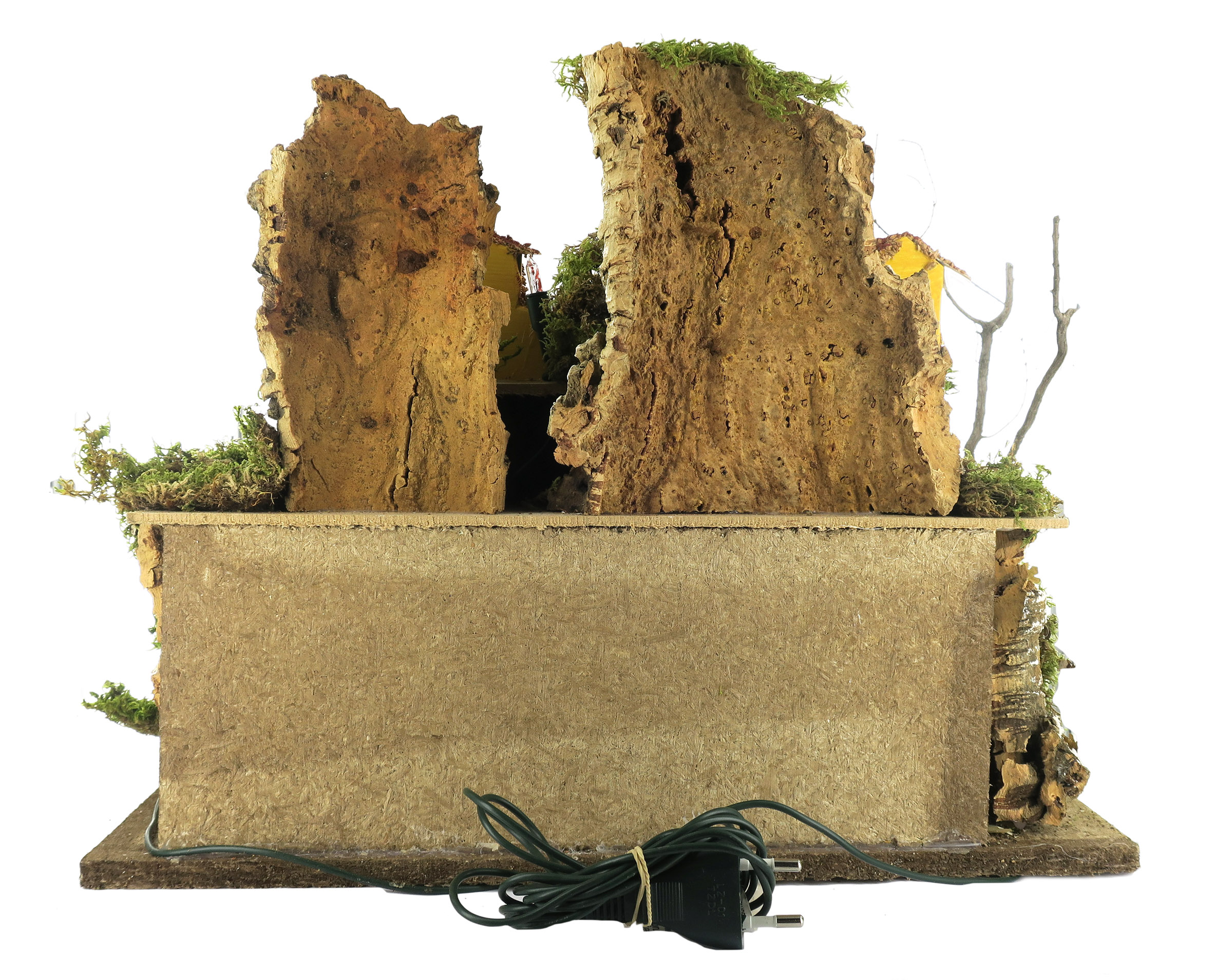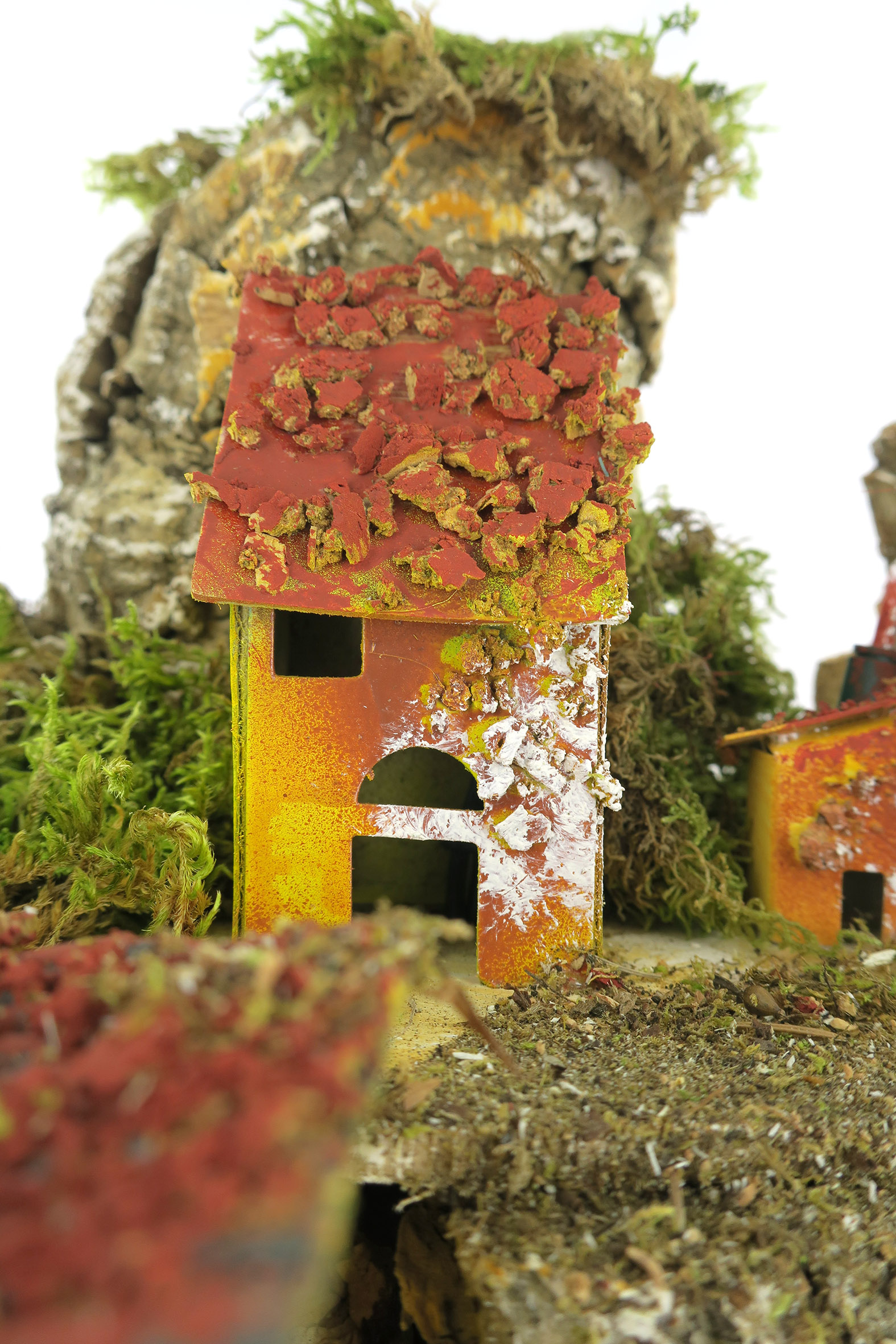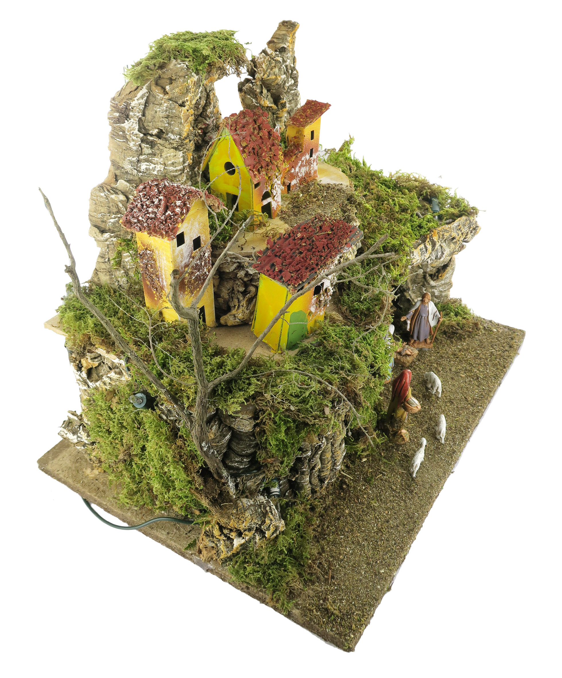 Villaggio con case illuminate. Completo di 6 statuine in resina da 6,5 cm e 3 pecore. Alimentazione elettrica 220 V. Dimensioni: 38 x 28 x 30 cm. Materiali: Legno, Sughero e Muschio. Realizzato artigianalmente in Italia.