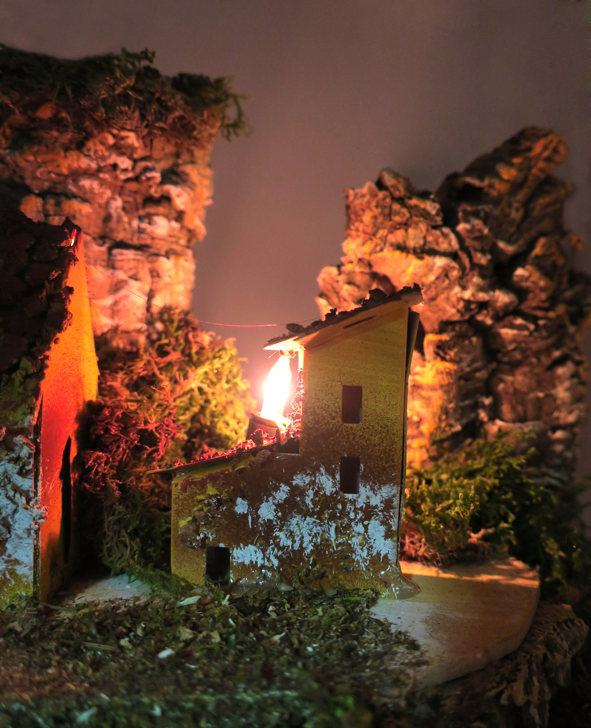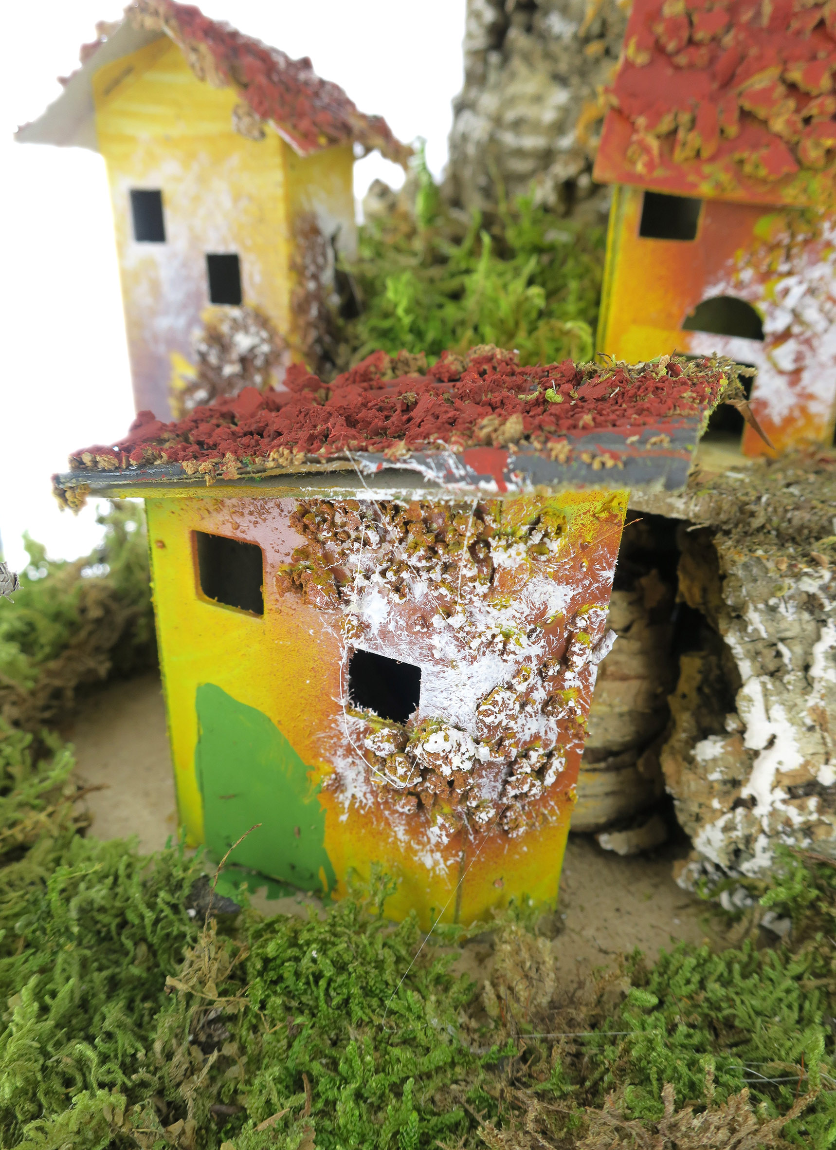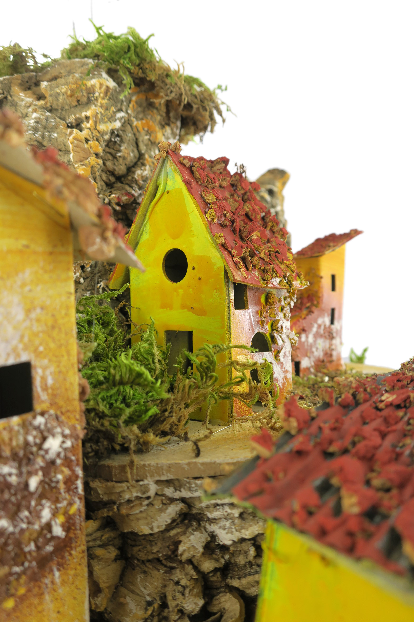 Villaggio con case illuminate. Completo di 6 statuine in resina da 6,5 cm e 3 pecore. Alimentazione elettrica 220 V. Dimensioni: 38 x 28 x 30 cm. Materiali: Legno, Sughero e Muschio. Realizzato artigianalmente in Italia.