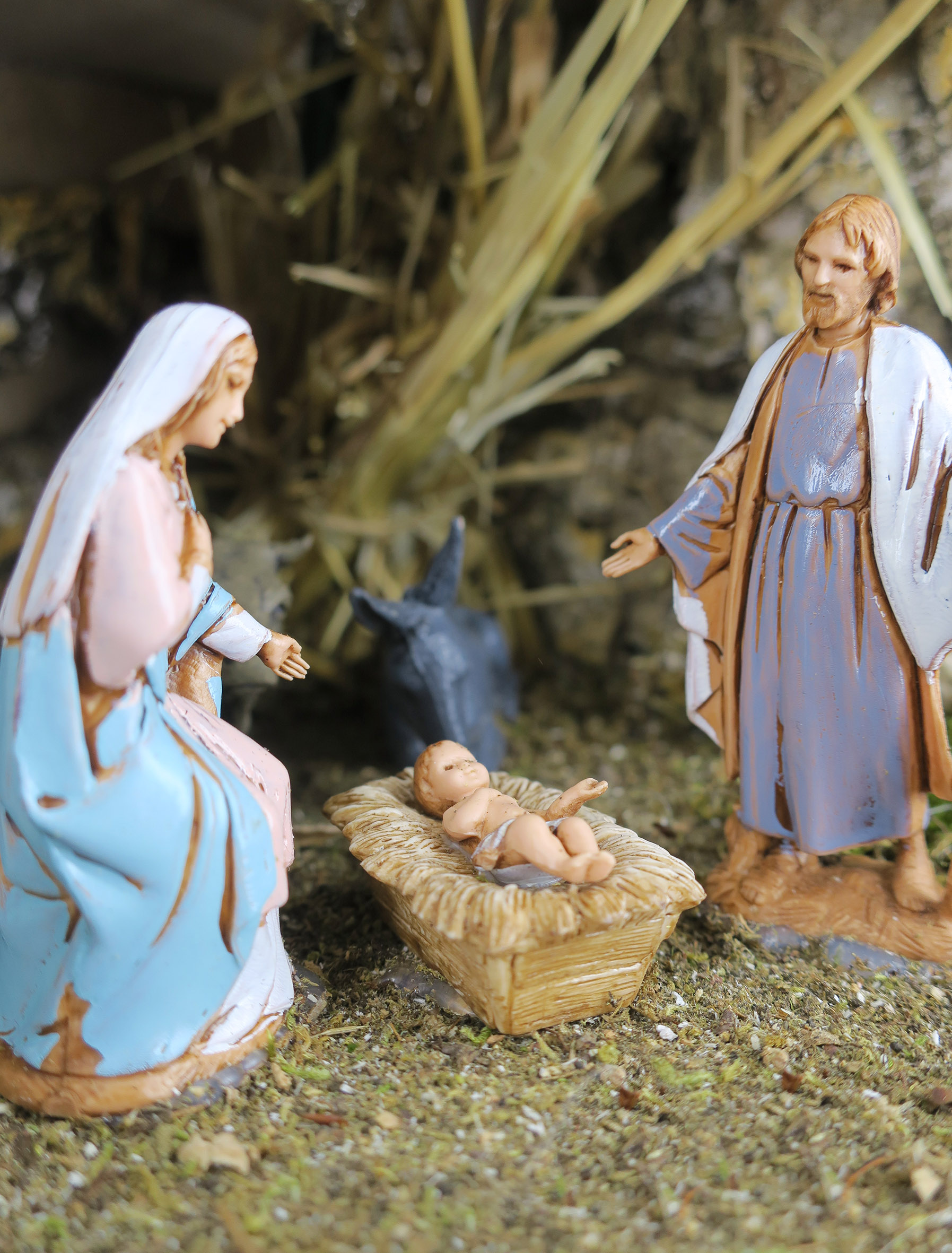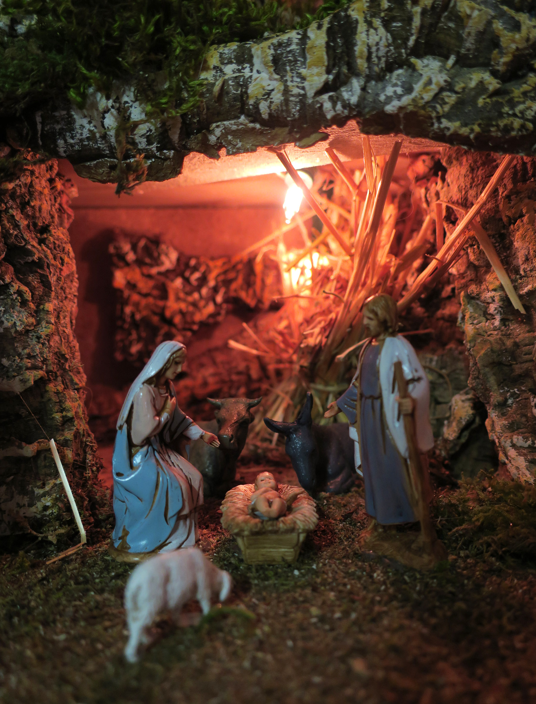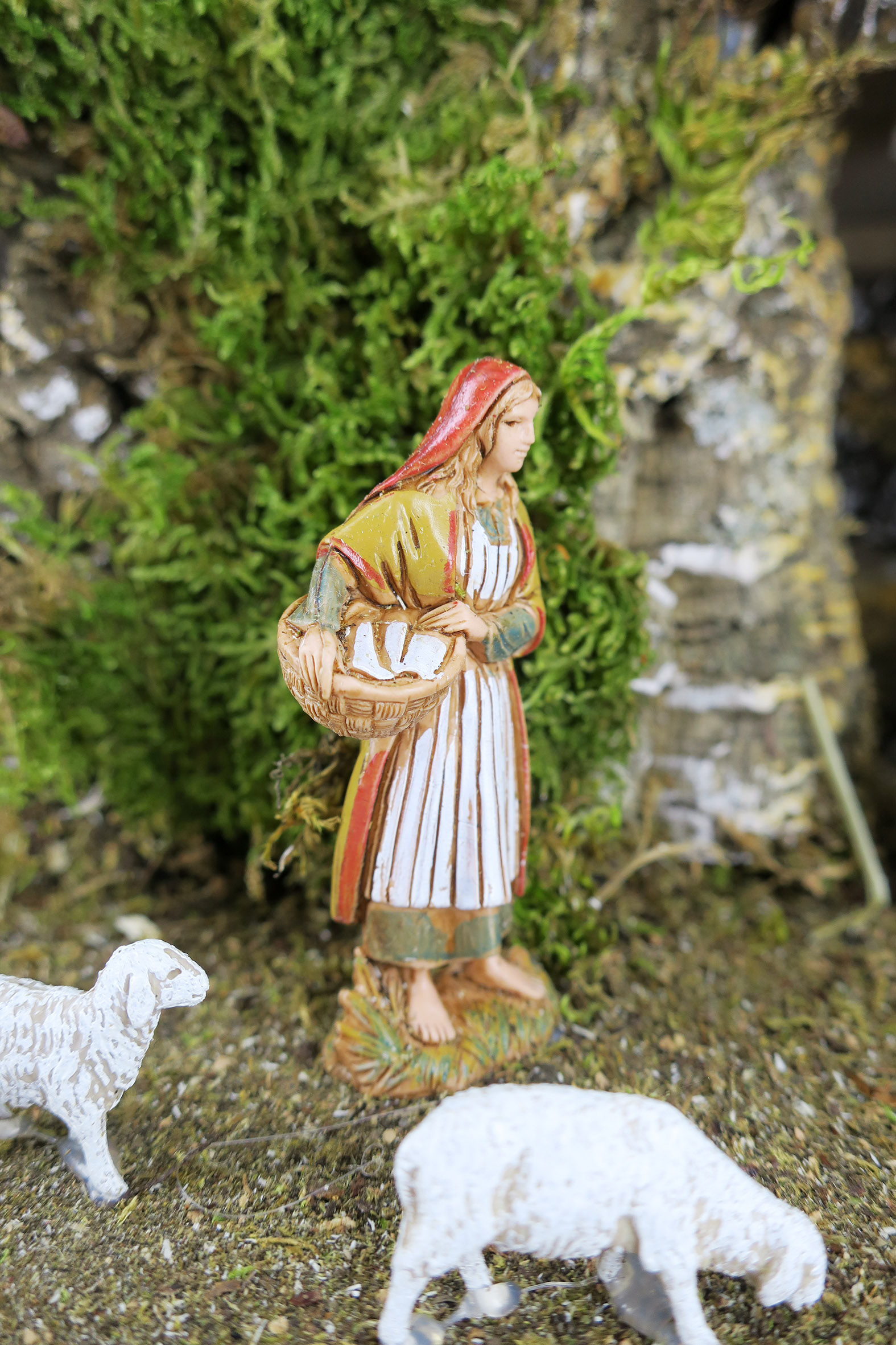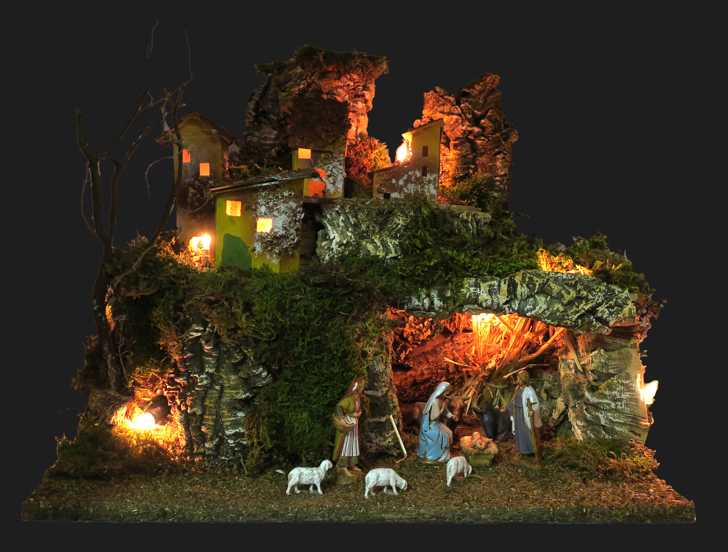 Villaggio con case illuminate. Completo di 6 statuine in resina da 6,5 cm e 3 pecore. Alimentazione elettrica 220 V. Dimensioni: 38 x 28 x 30 cm. Materiali: Legno, Sughero e Muschio. Realizzato artigianalmente in Italia.