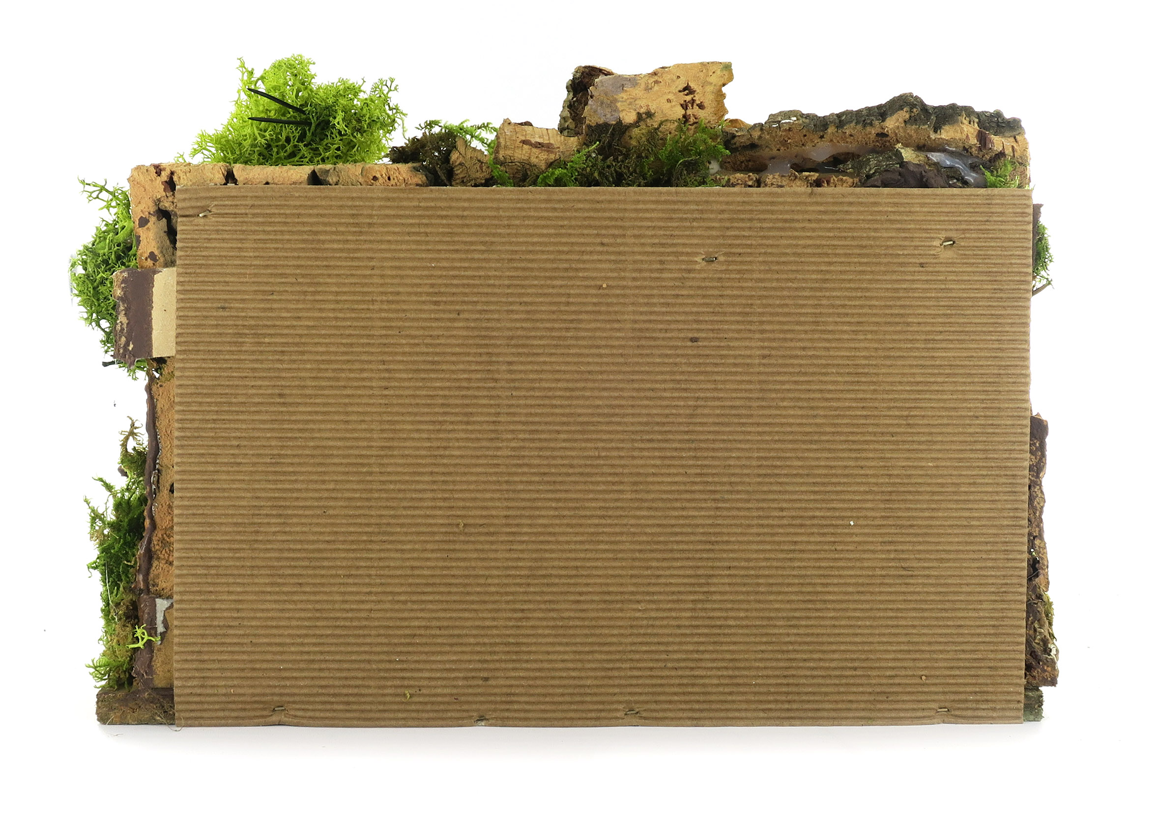 Accessori per presepe: Casa In Stucco Con Rimessa di Legna. Dimensioni: 13 x 25 x 19 cm. Materiali: legno, muschio, sughero, stucco e lichene. Realizzato artigianalmente in Italia.