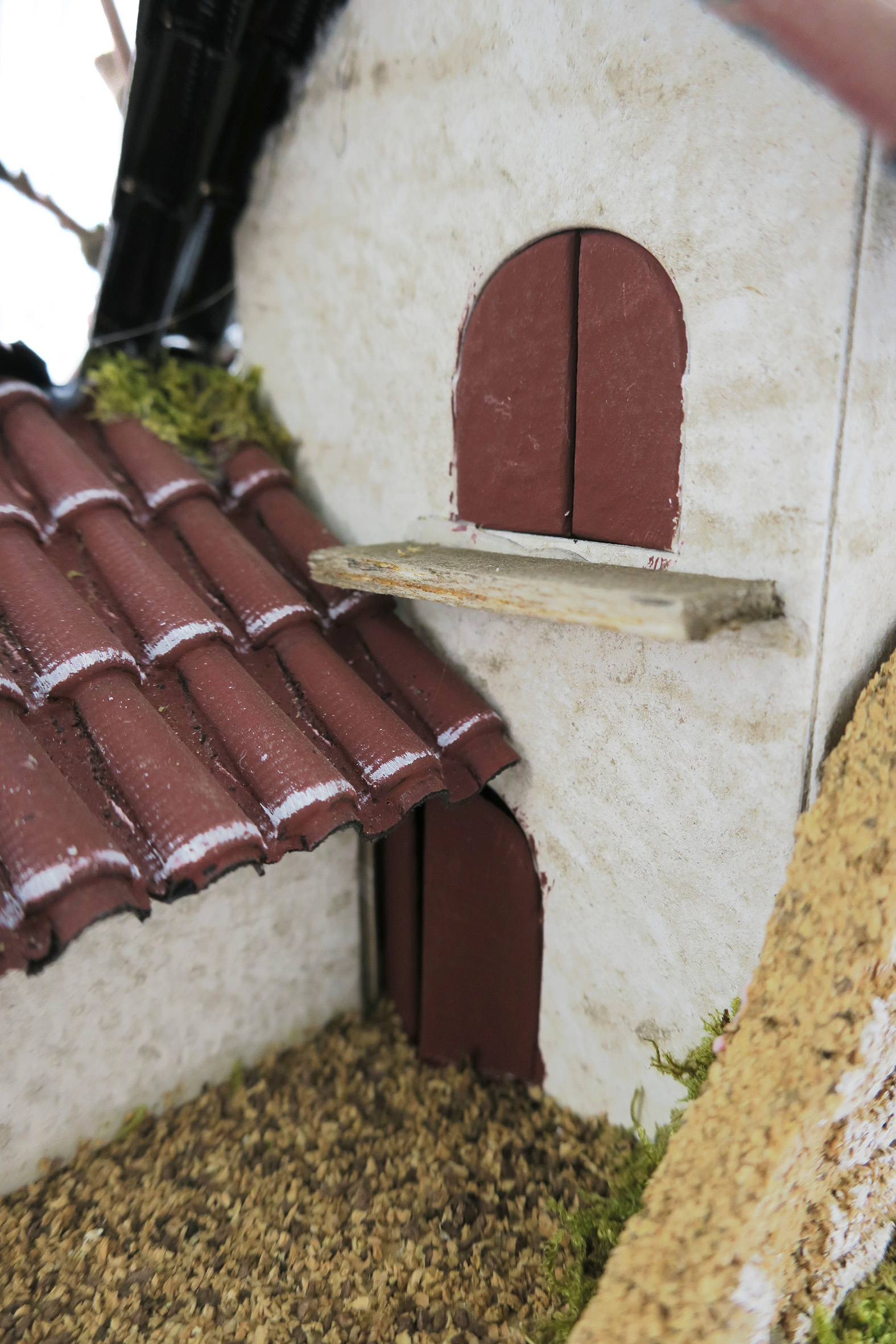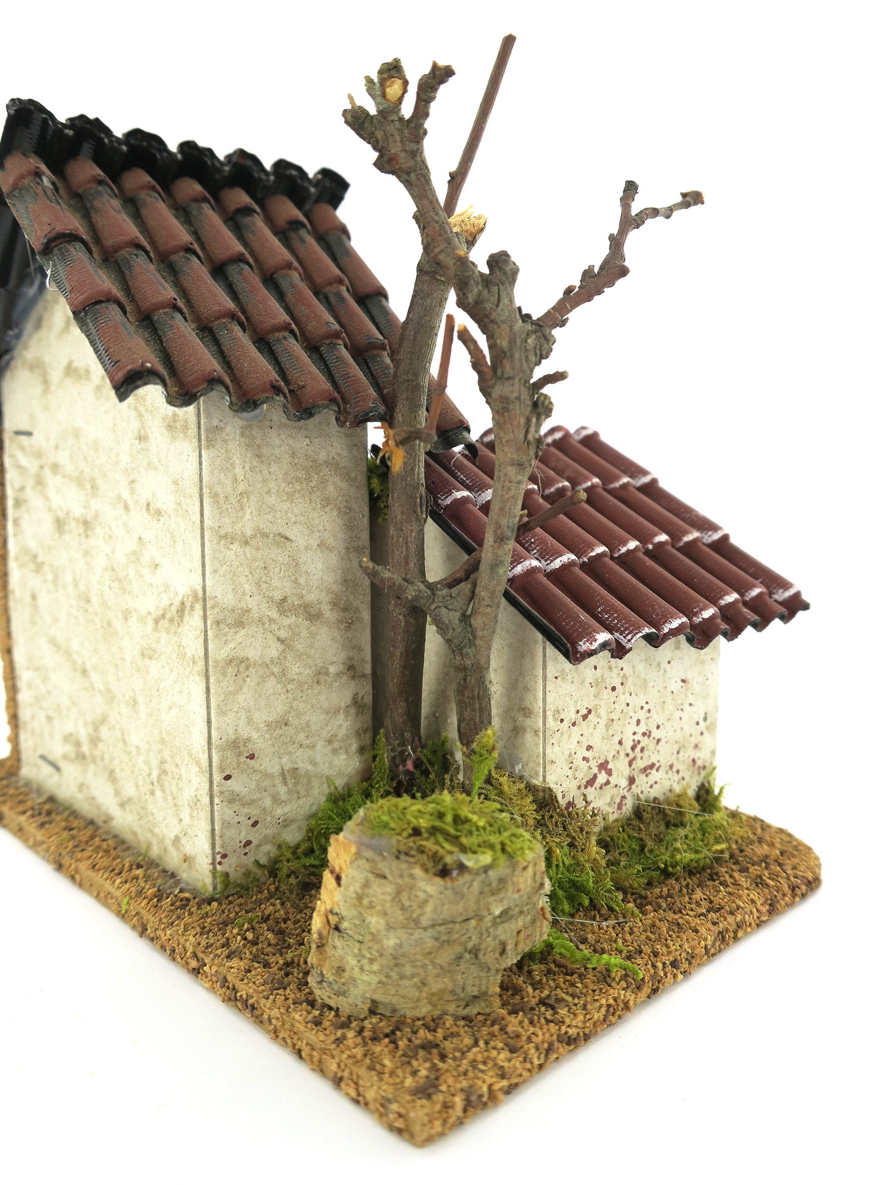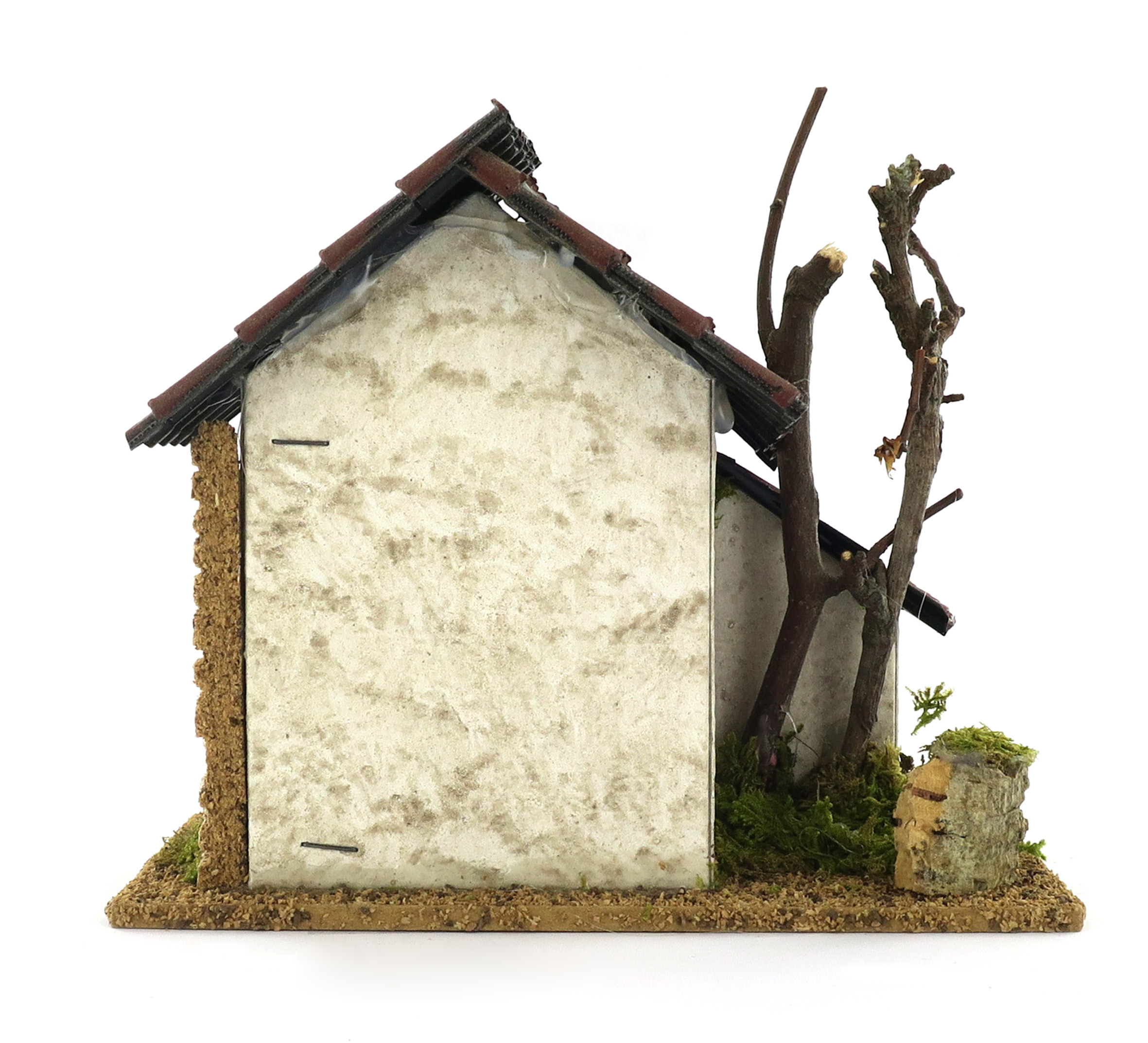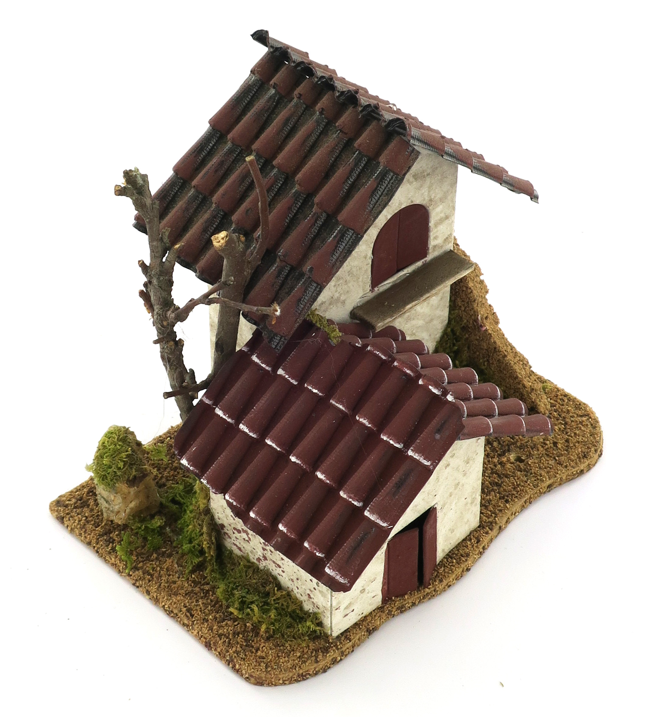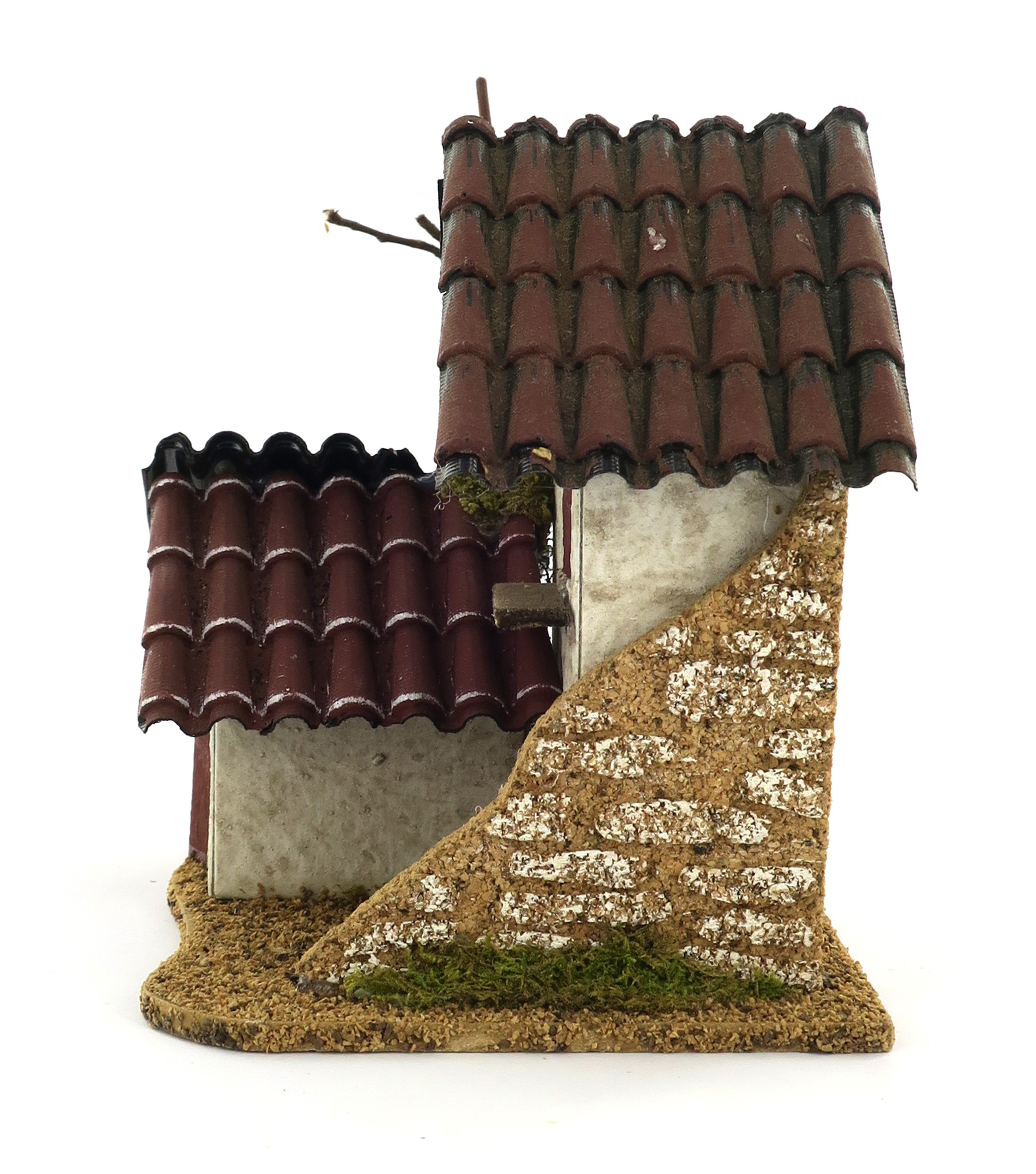 Accessori per presepe: Casetta con tegole rosse (due edifici su unica base). Dimensioni: 15 x 14 x 10 cm. Materiali: legno, sughero, muschio e cartone. Realizzato artigianalmente in Italia.