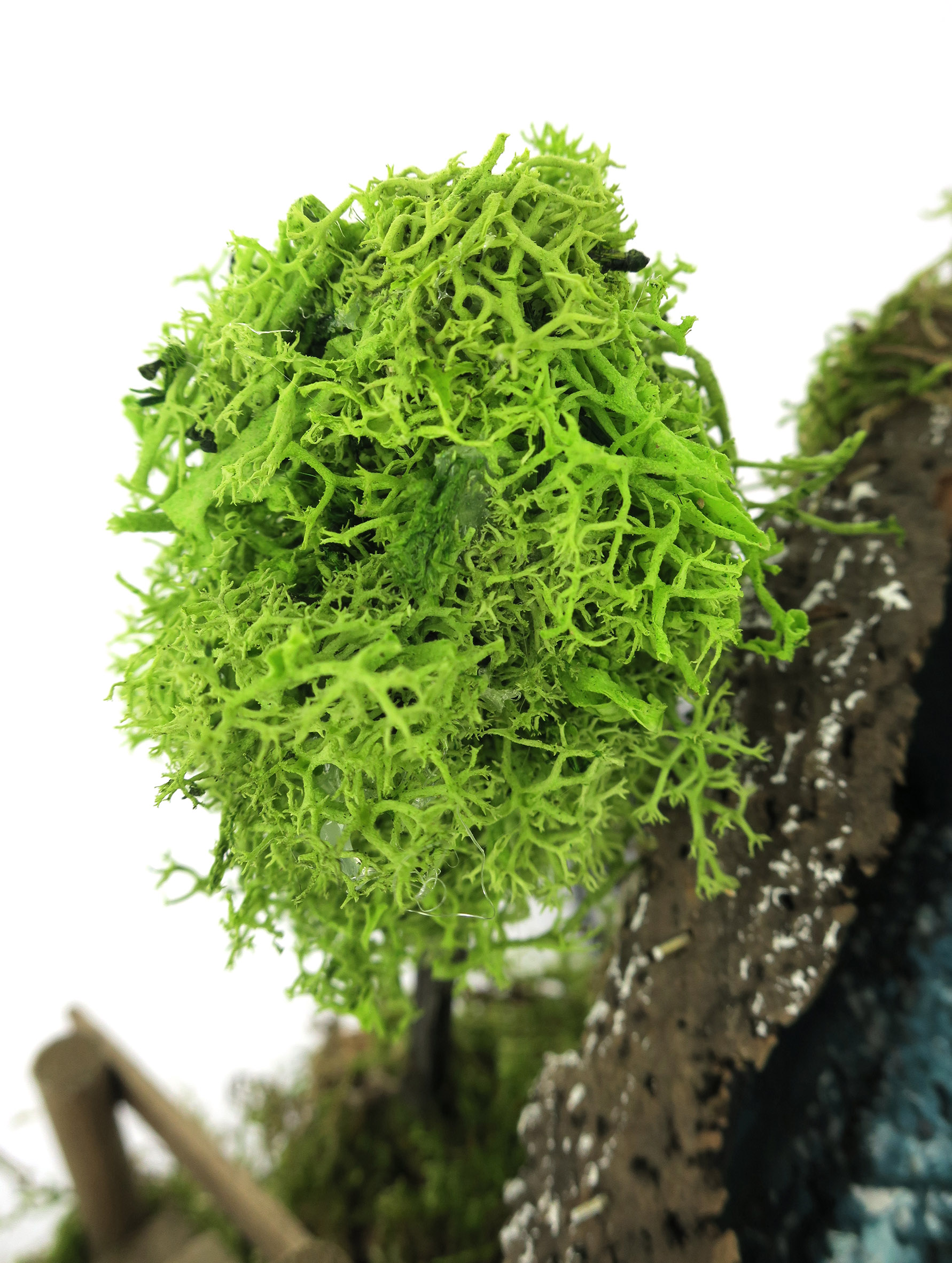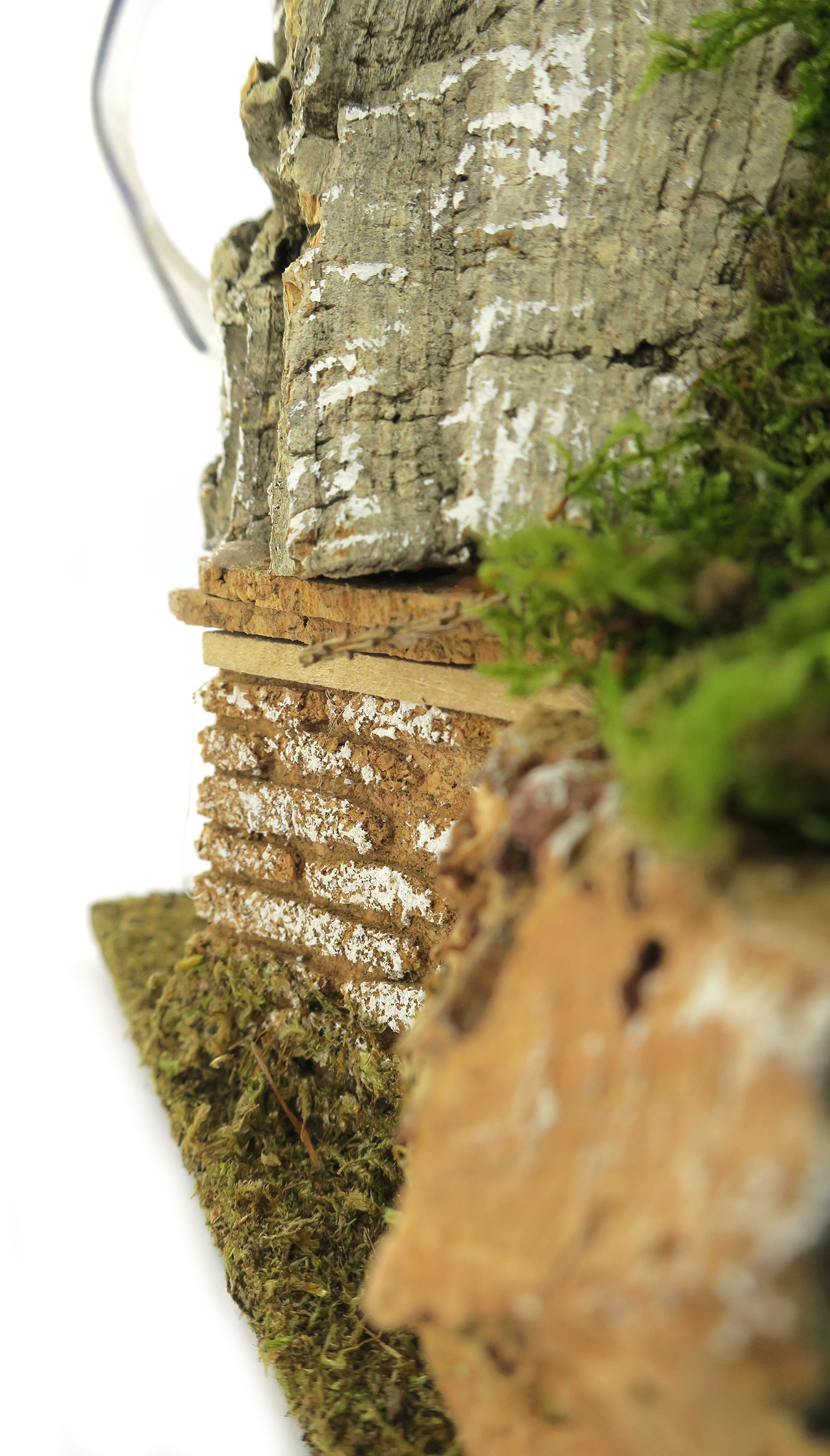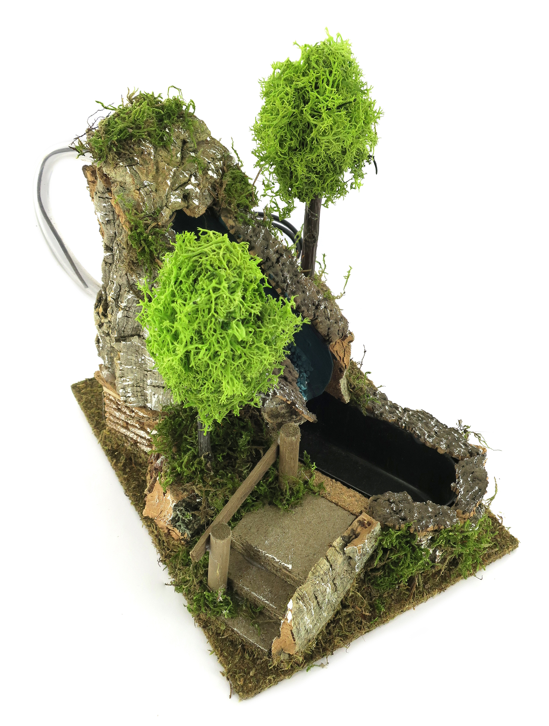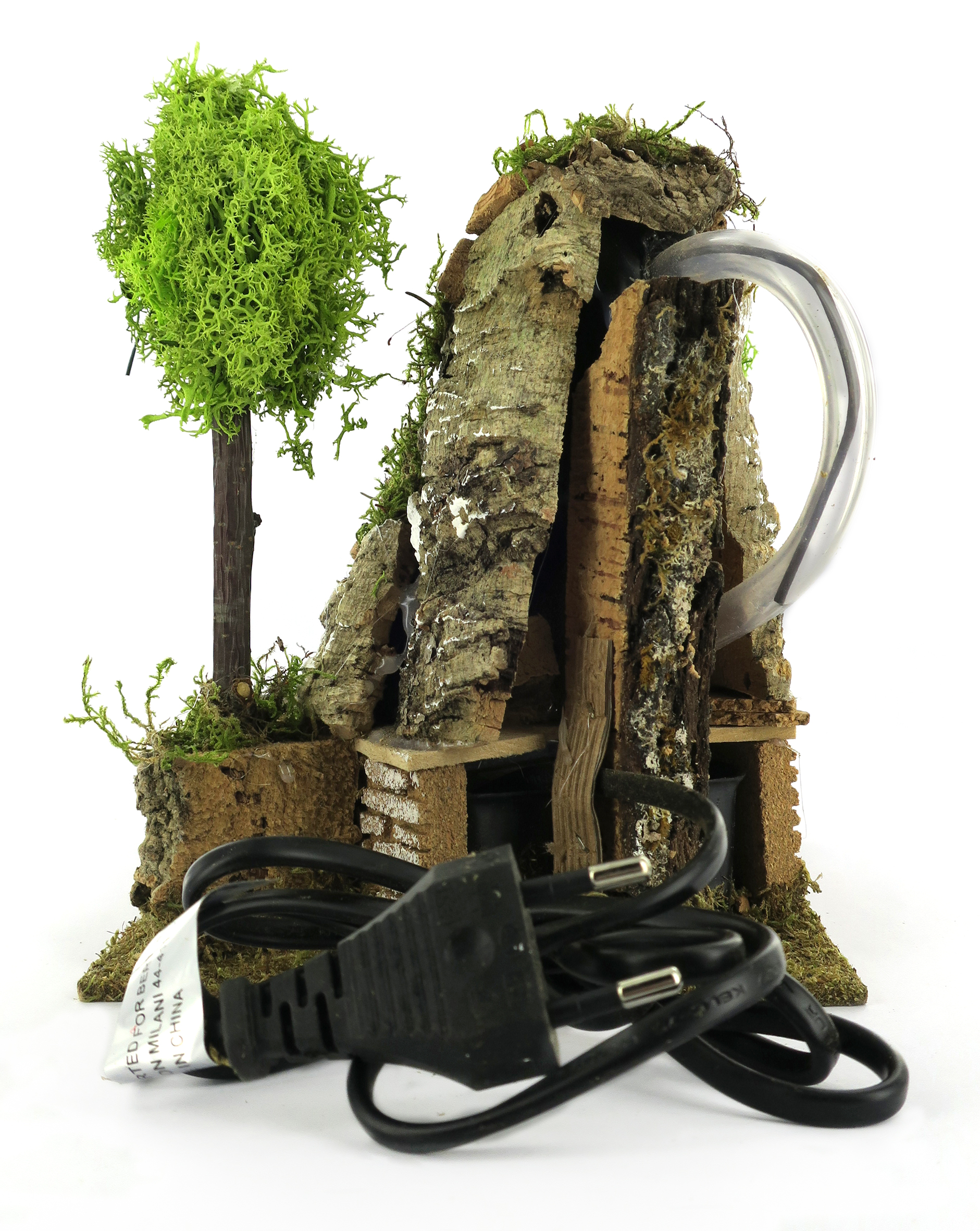 Accessori per presepe: Cascata ad acqua con albero (alimentazione elettrica 220 V). Dimensioni: 20 x 21 x 15 cm. Materiali: legno, sughero, muschio e lichene. Realizzato artigianalmente in Italia.