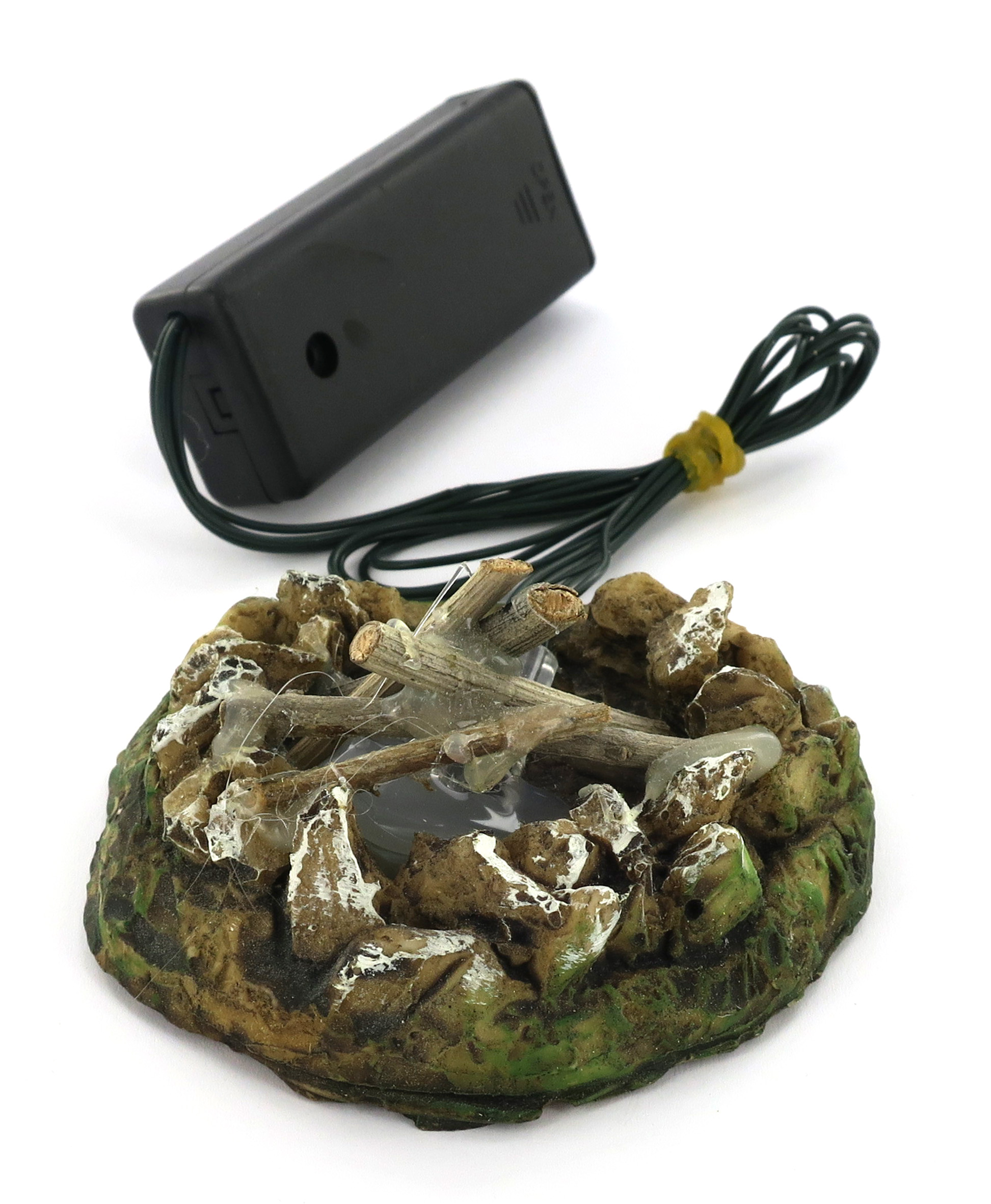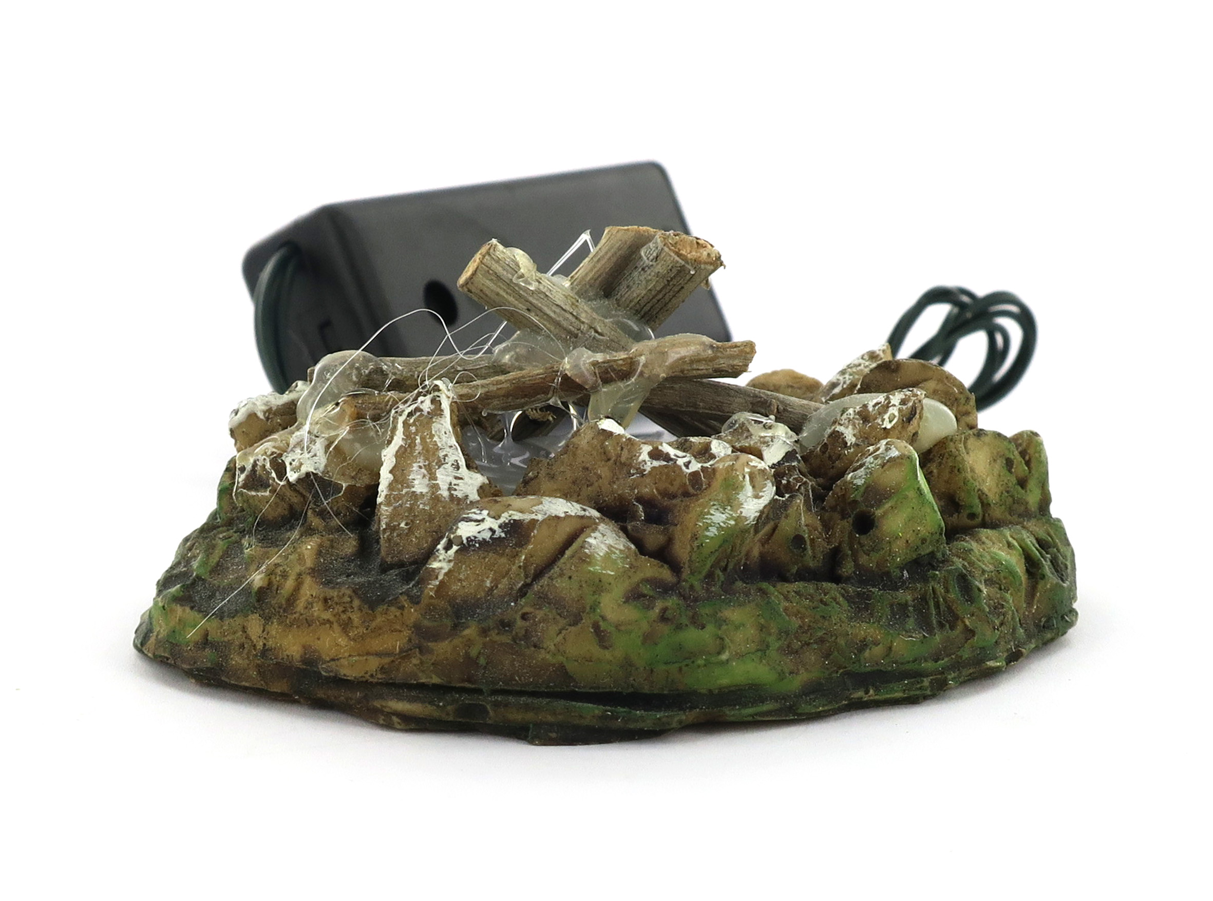 Accessori per presepe: Bivacco in resina con fuoco a LED. Dimensioni: 7 x 8 x 4 cm. Realizzato artigianalmente in Italia.
