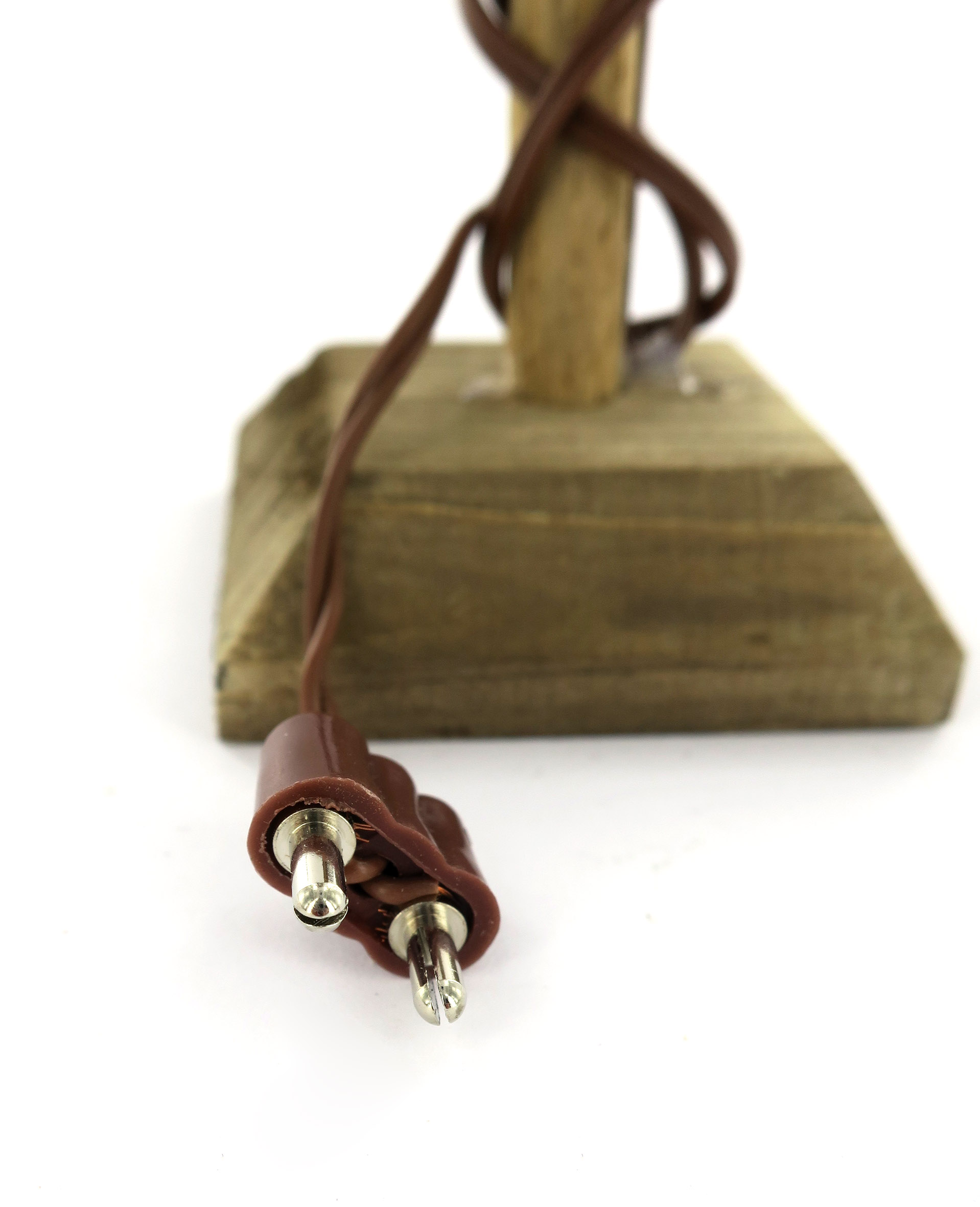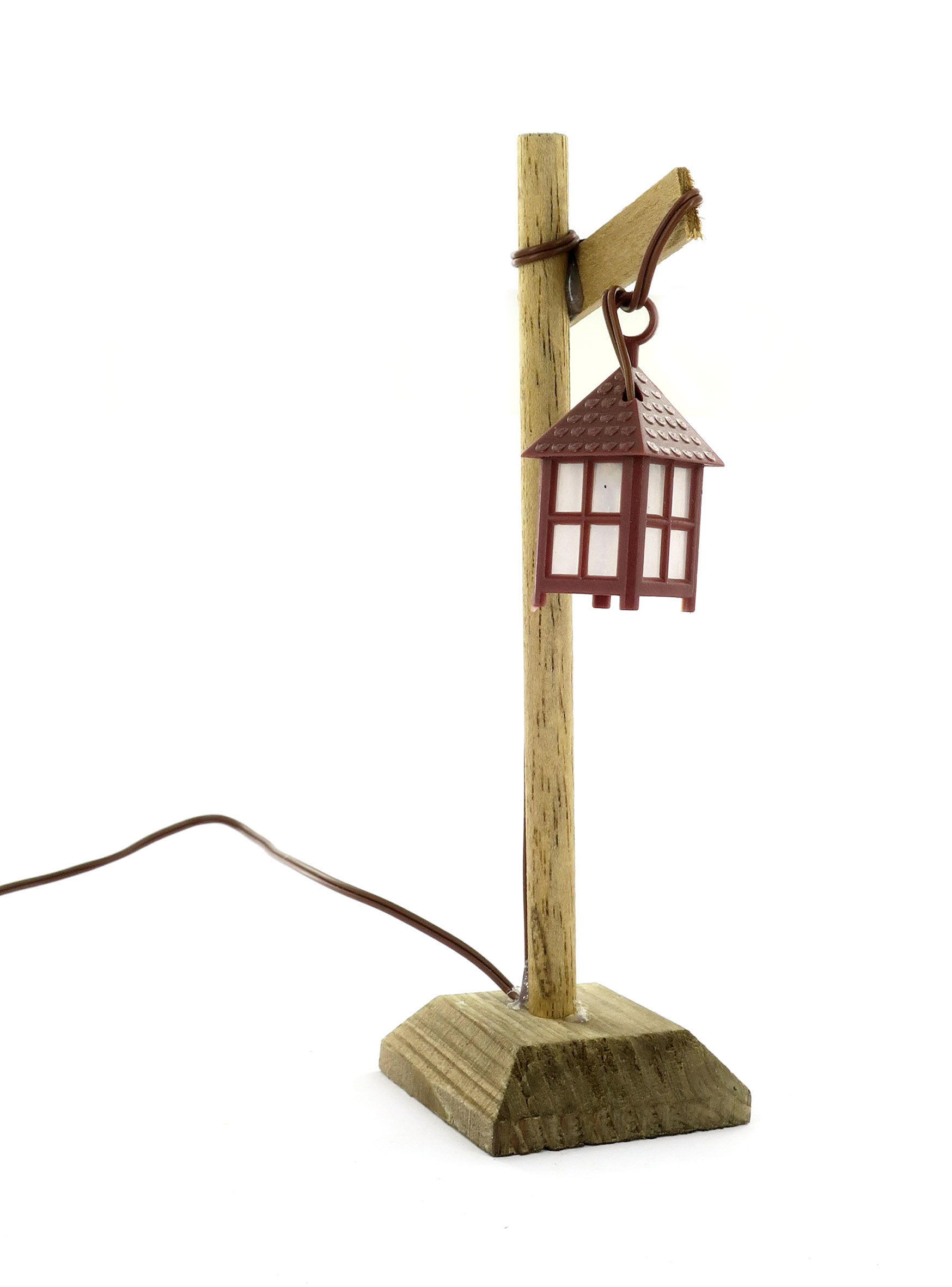 Accessori elettrici per presepe: Lampione con piedistallo e spina (3,5 V). Materiali: legno, plastica e materiale elettrico. Dimensioni: 5 x 5 x 15 cm.
