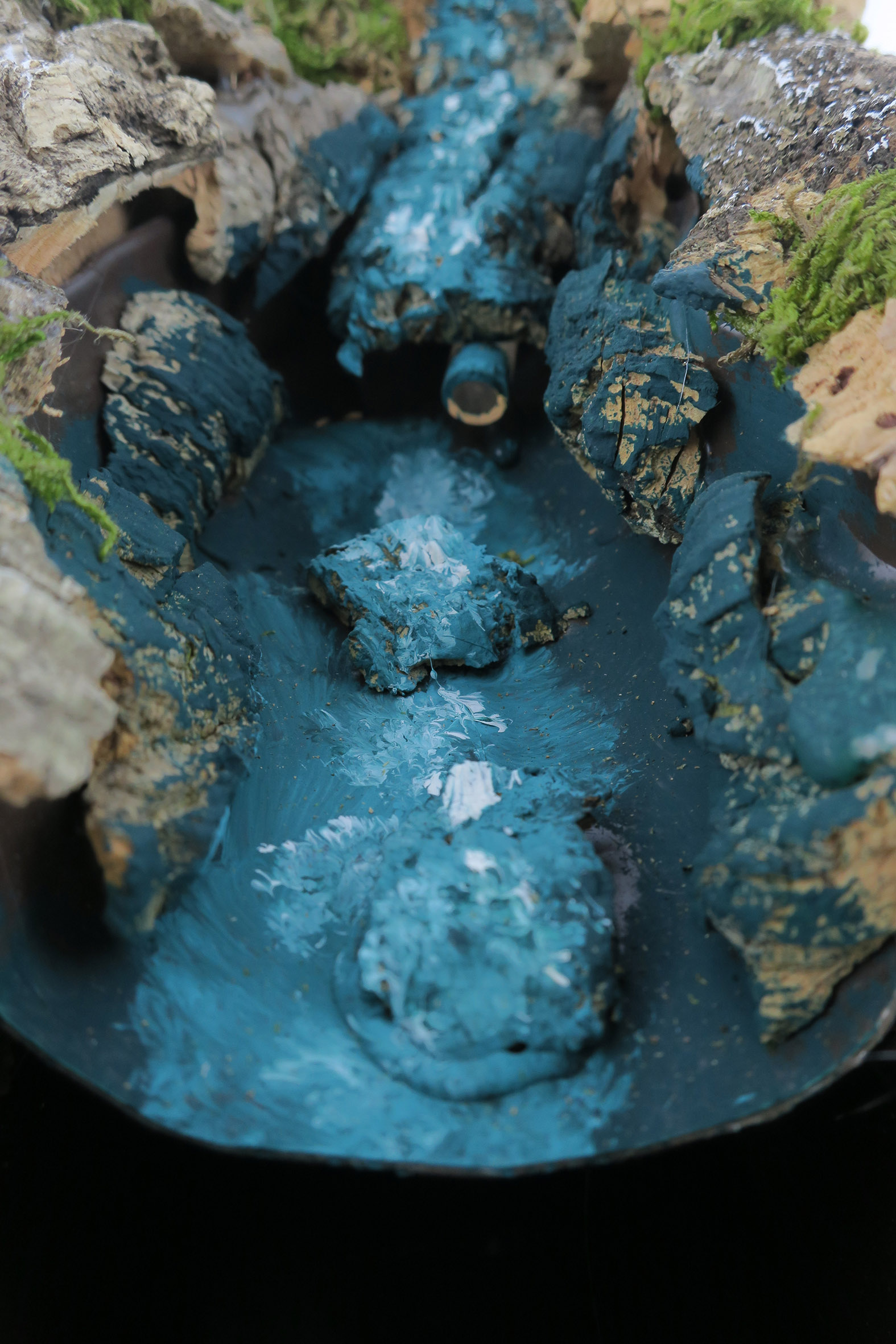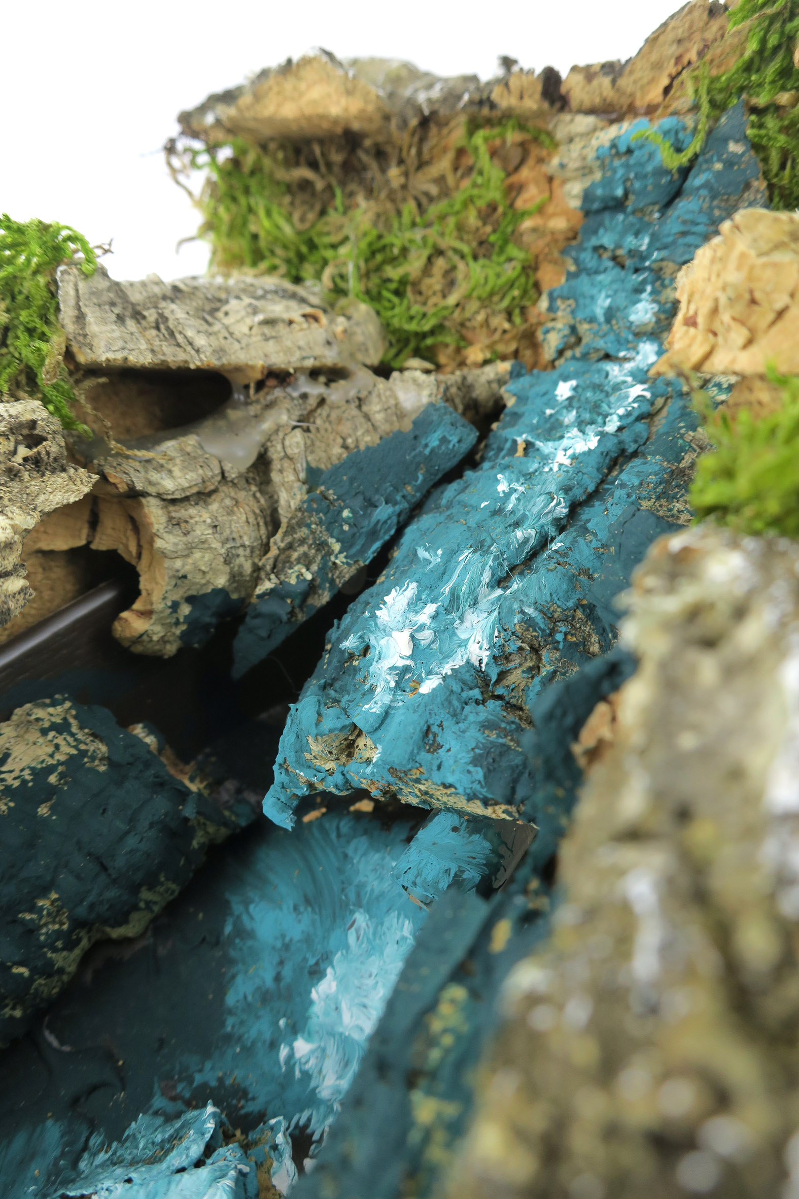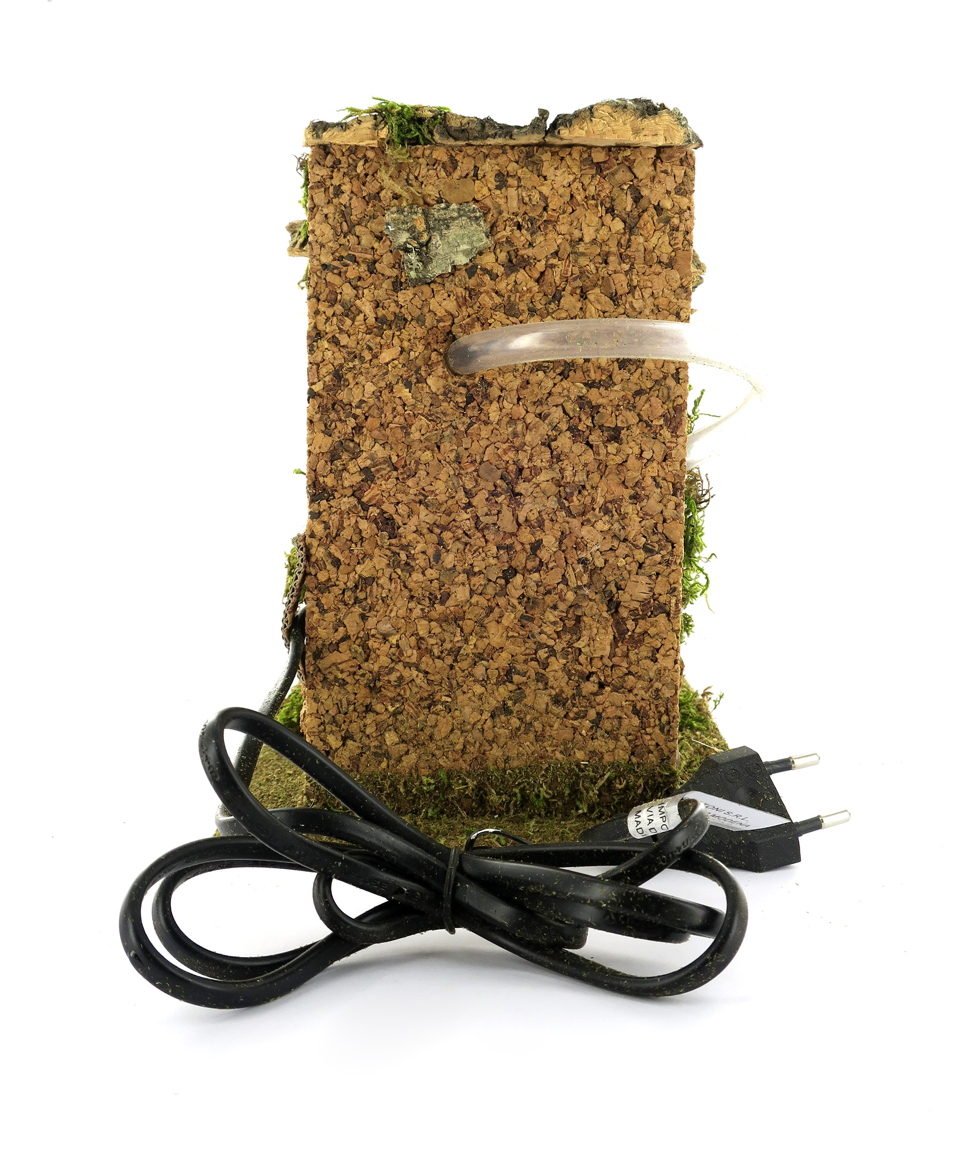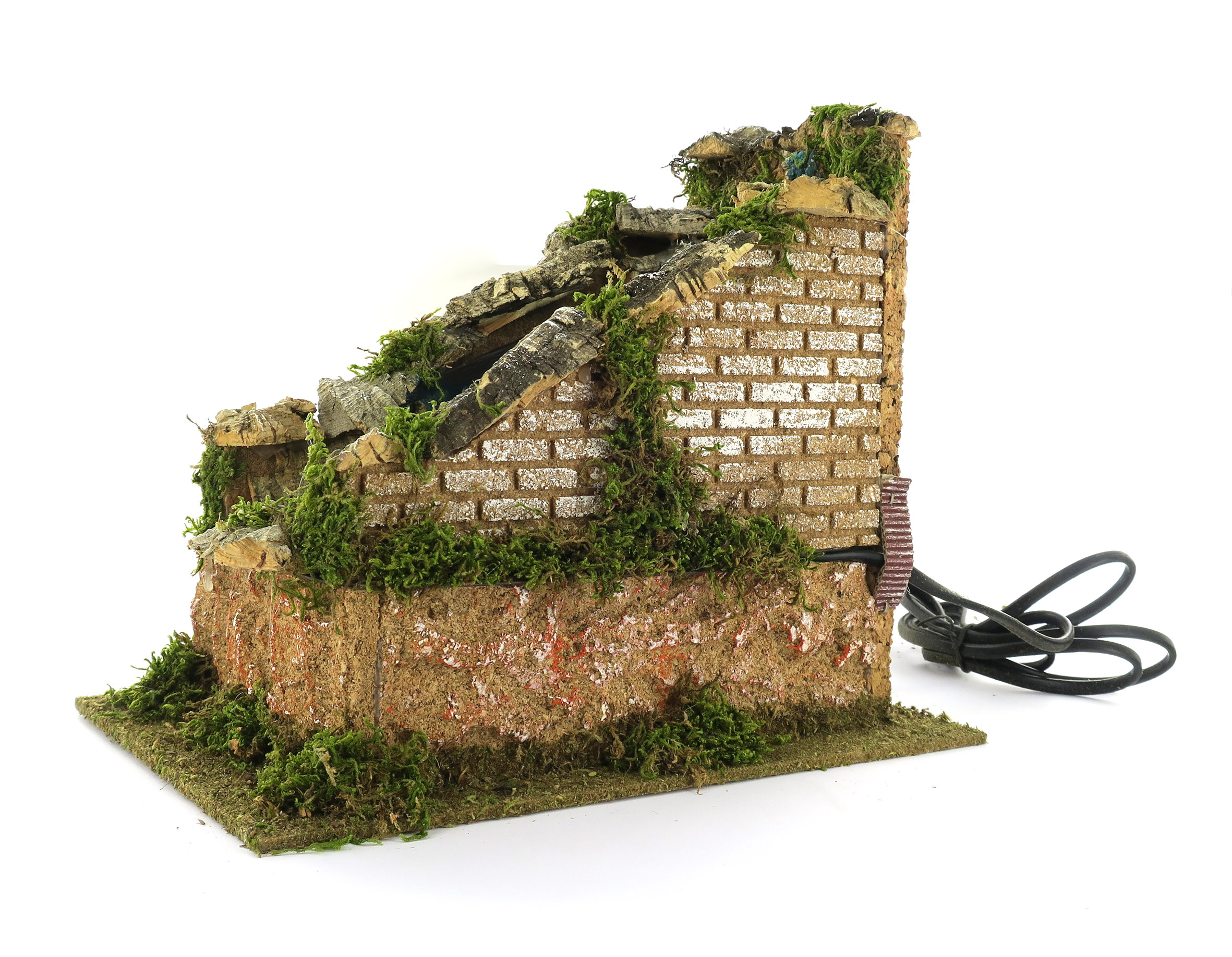 Accessori per presepe: Cascata. Alimentazione elettrica 220 V. Materiali: legno, sughero, muschio e stucco. Dimensioni: 24 x 16 x 20 cm. Realizzato artigianalmente in Italia.