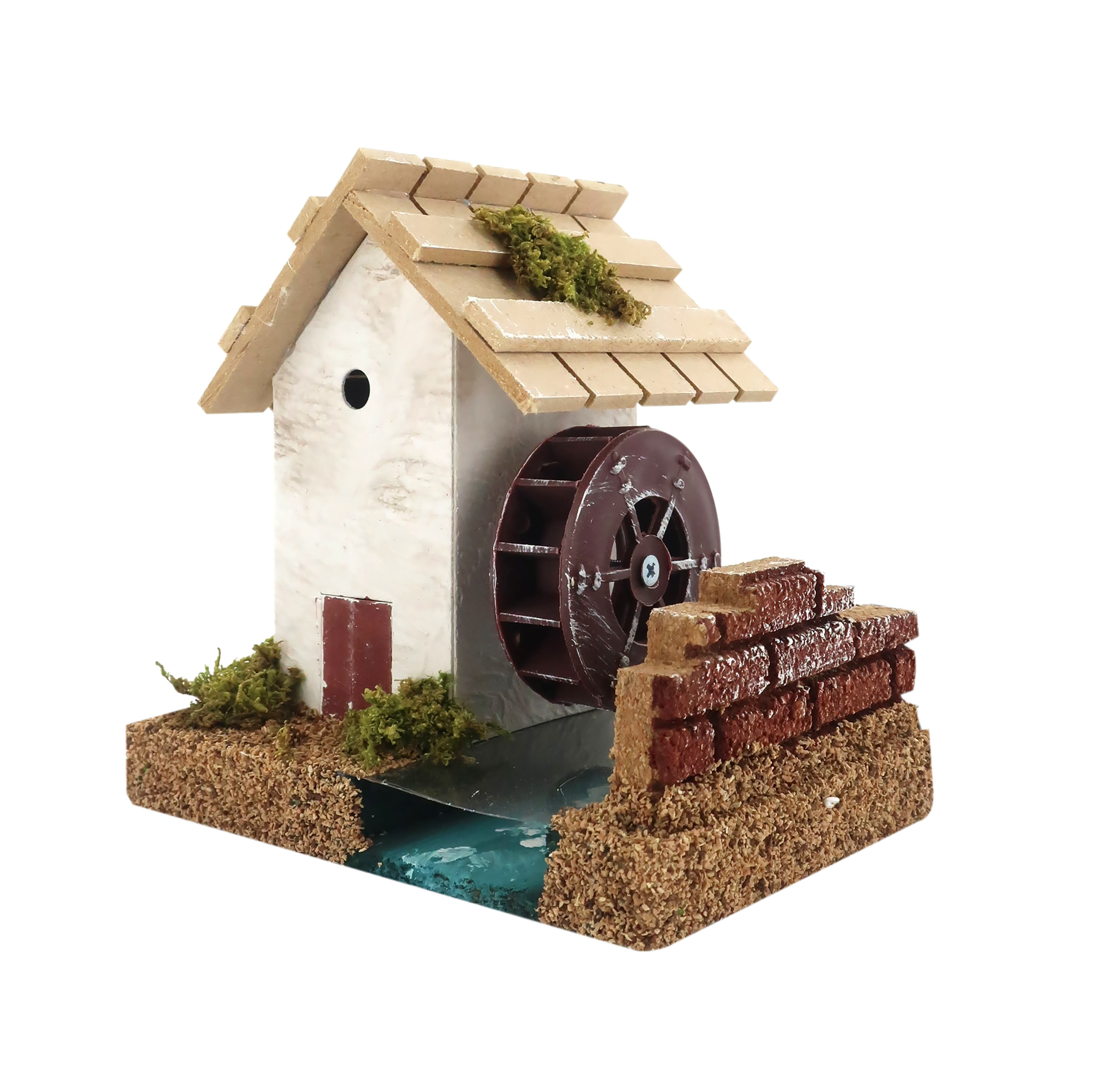 Accessori per presepe: Mulino Ad Acqua Con Movimento Elettrico. Alimentazione elettrica 220 V. Materiali: legno, cartone, sughero e muschio. Dimensioni: 13 x 13 x 9 cm. Realizzato artigianalmente in Italia.