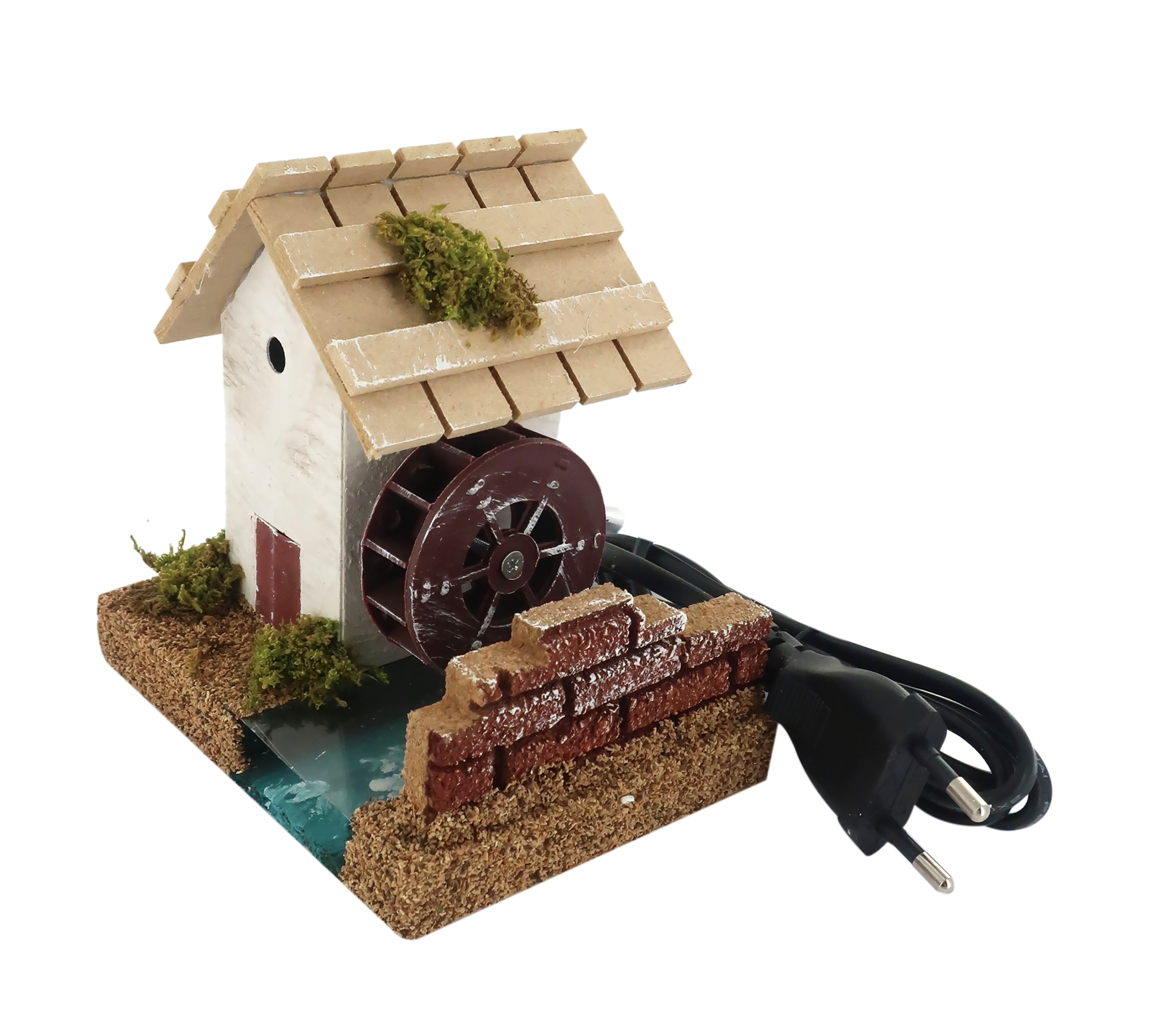 Mulino ad Acqua con Ruota che Gira per Presepe, Mulino Elettrico 220V Linea Bertoni, Legno/Cartone/Plastica, 13x13x9 Cm