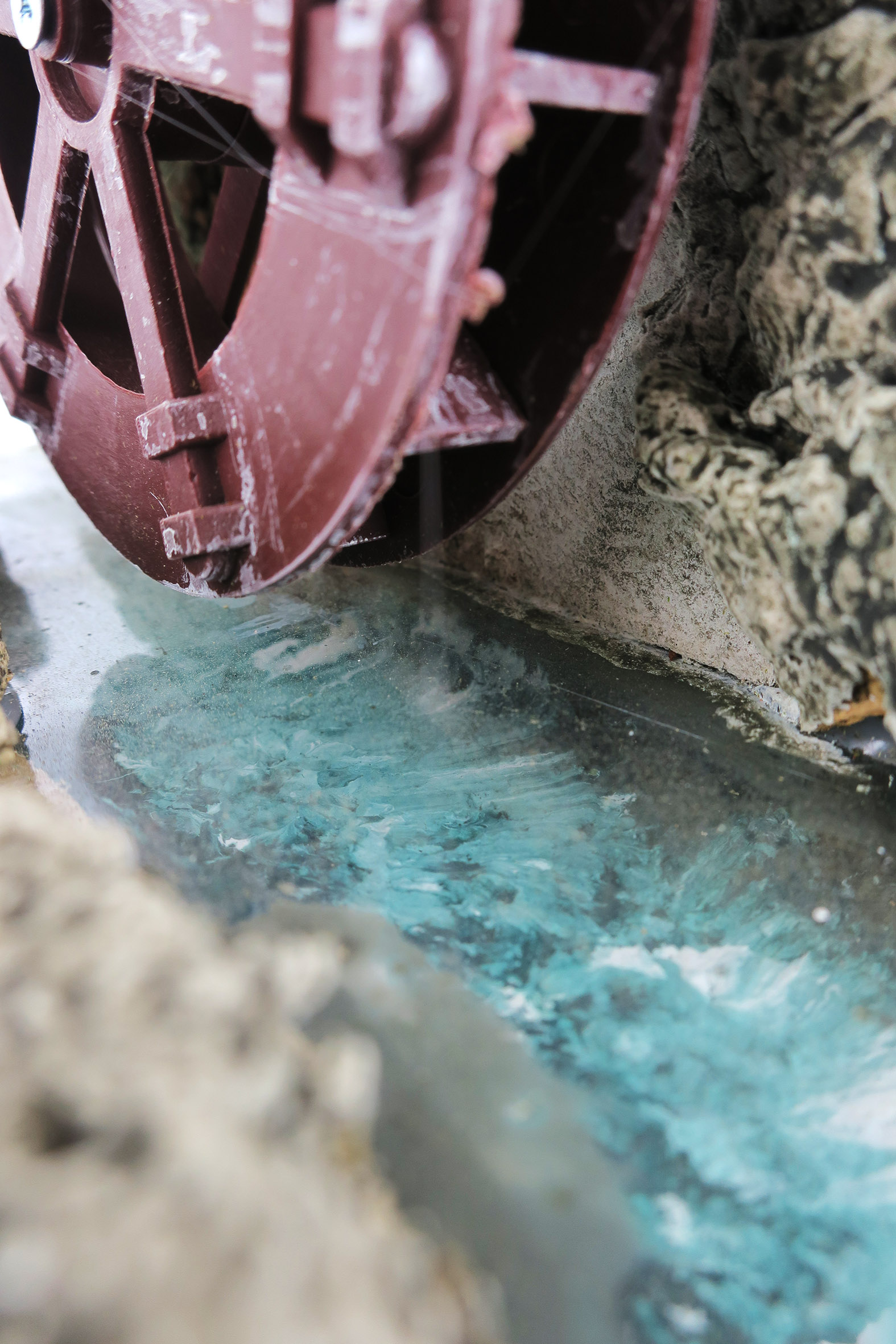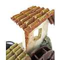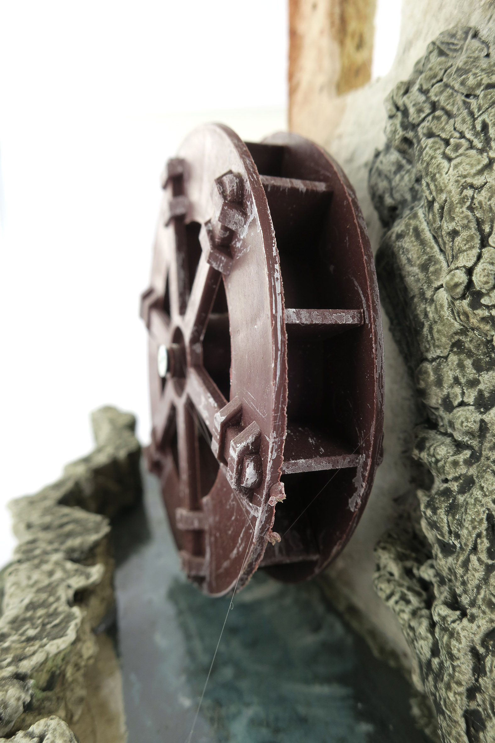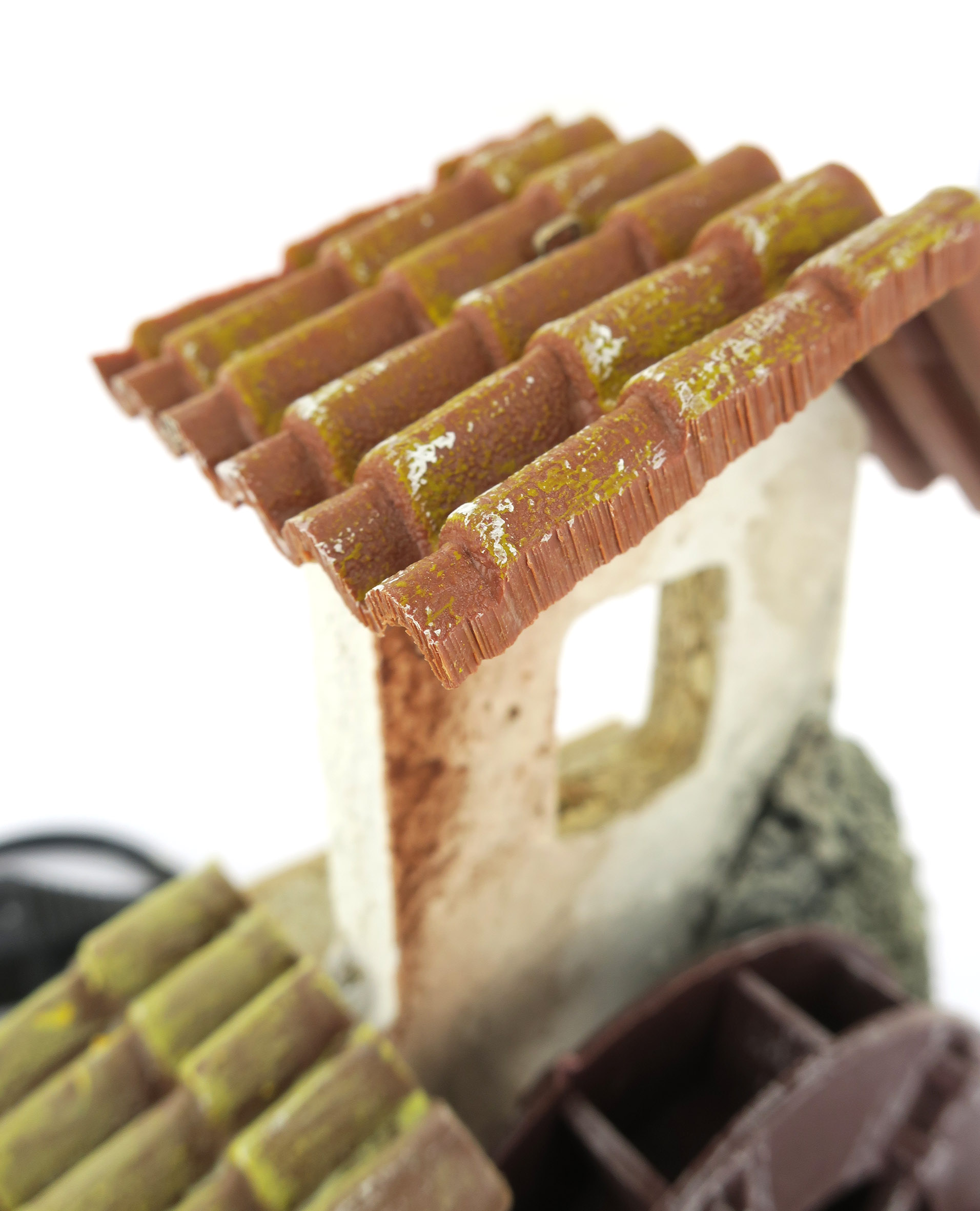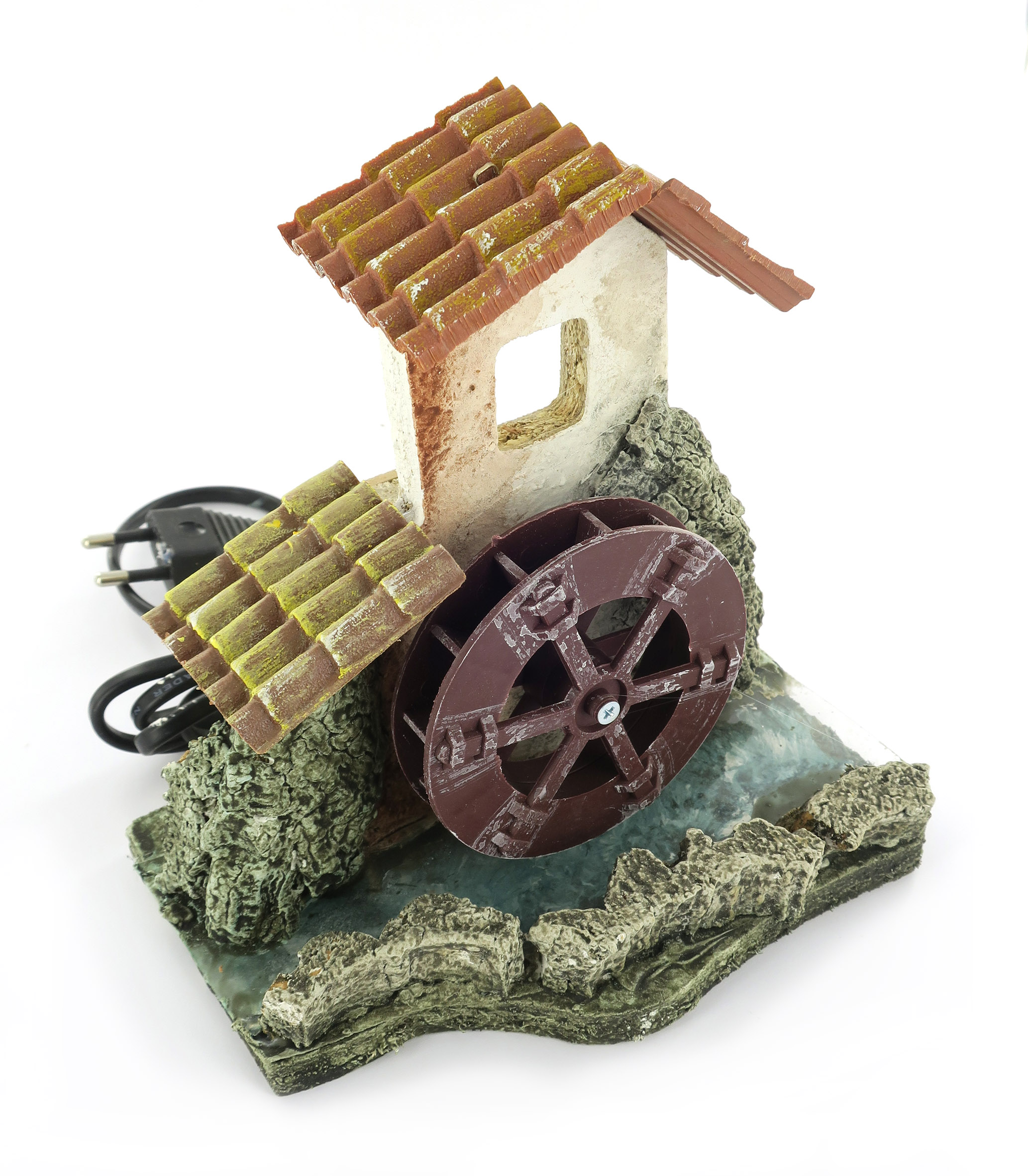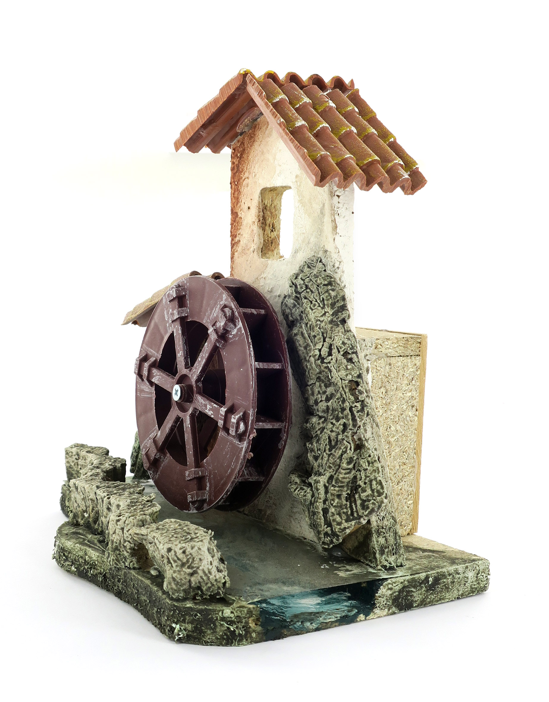Accessori per presepe: Mulino con ruota che gira, alimentazione elettrica 220V. Il mulino è su un tratto di fiume.