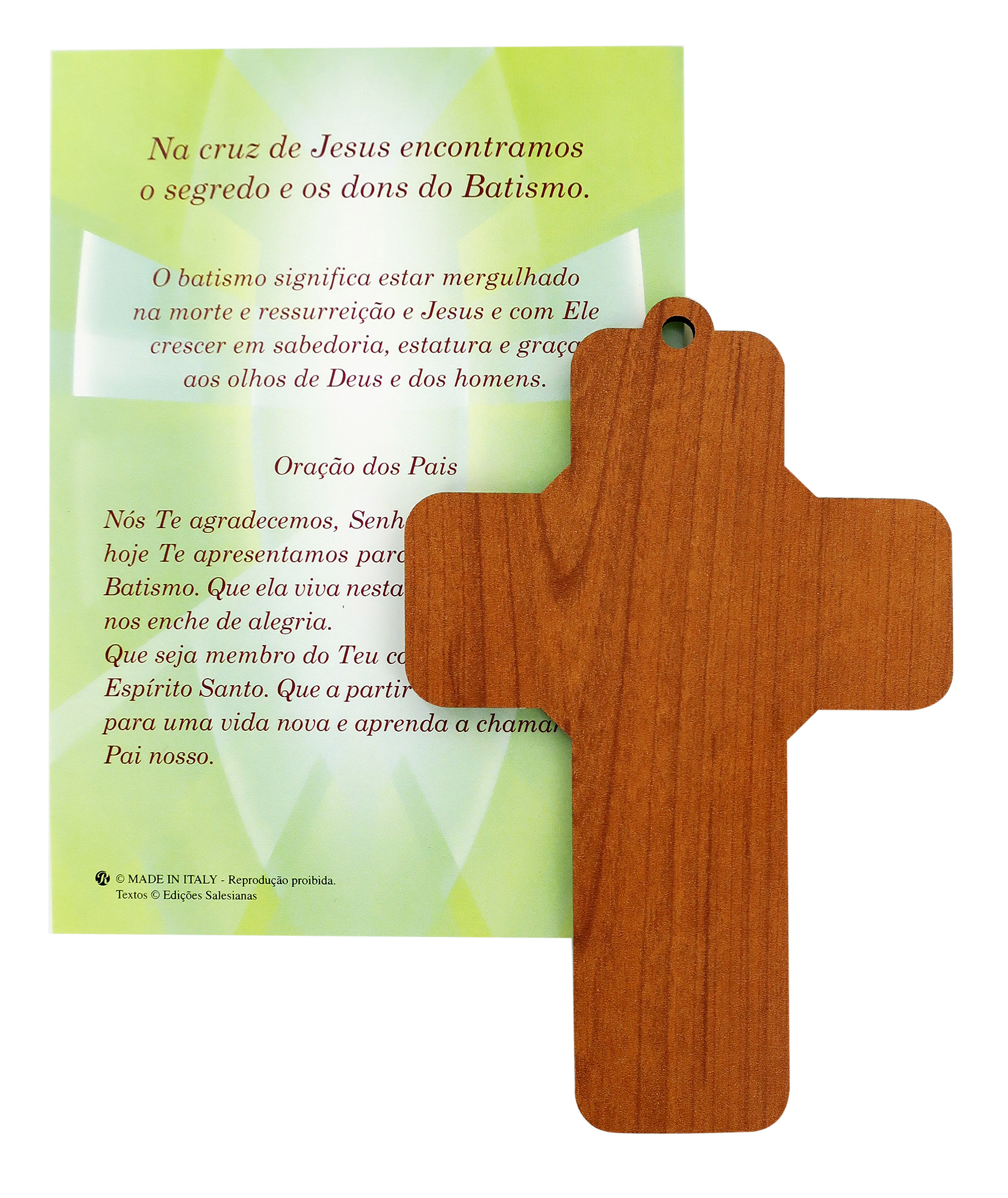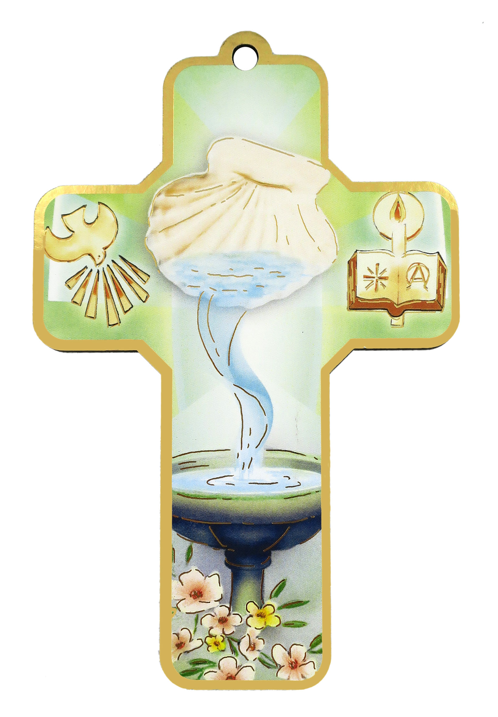 Sulla Croce è raffigurato il fonte battesimle e l'immagine è una stampa con rifiniture in oro a caldo.