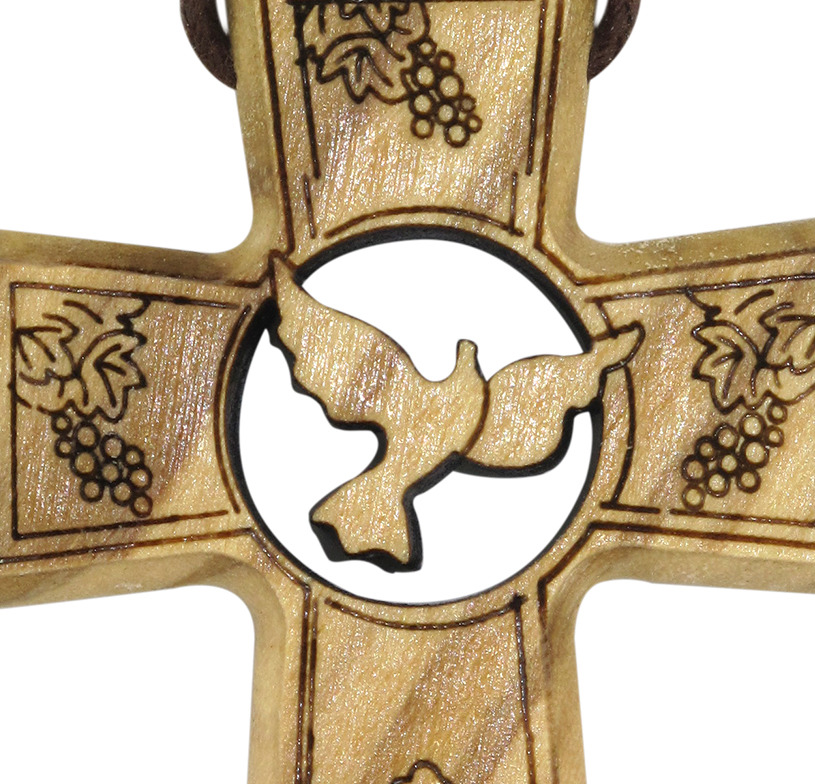 Croce in legno di ulivo con i simboli della comunione (uva, spighe) e della cresima (colomba).