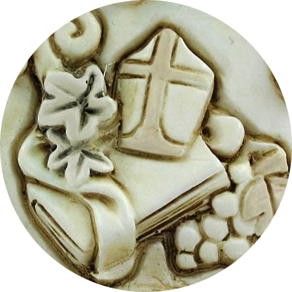 Alcuni elementi, quali l'angelo, la bambina, la stella e l'uva sono in rilievo.