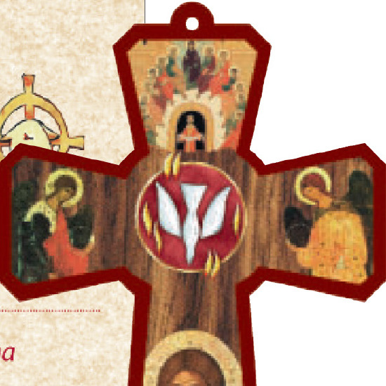 Insieme al biglietto c’è anche una croce in legno MDF stampata e finemente curato nei dettagli, che raffigura la luce divina dello Spirito Santo che illumina i fedeli e scende su di loro sottoforma di fiammella, simbolo di questo speciale sacramento.