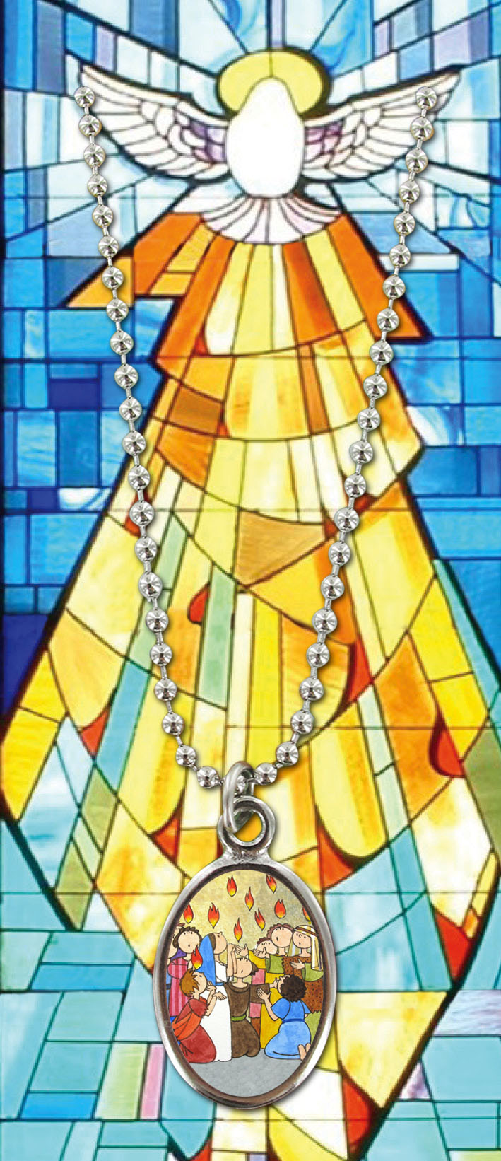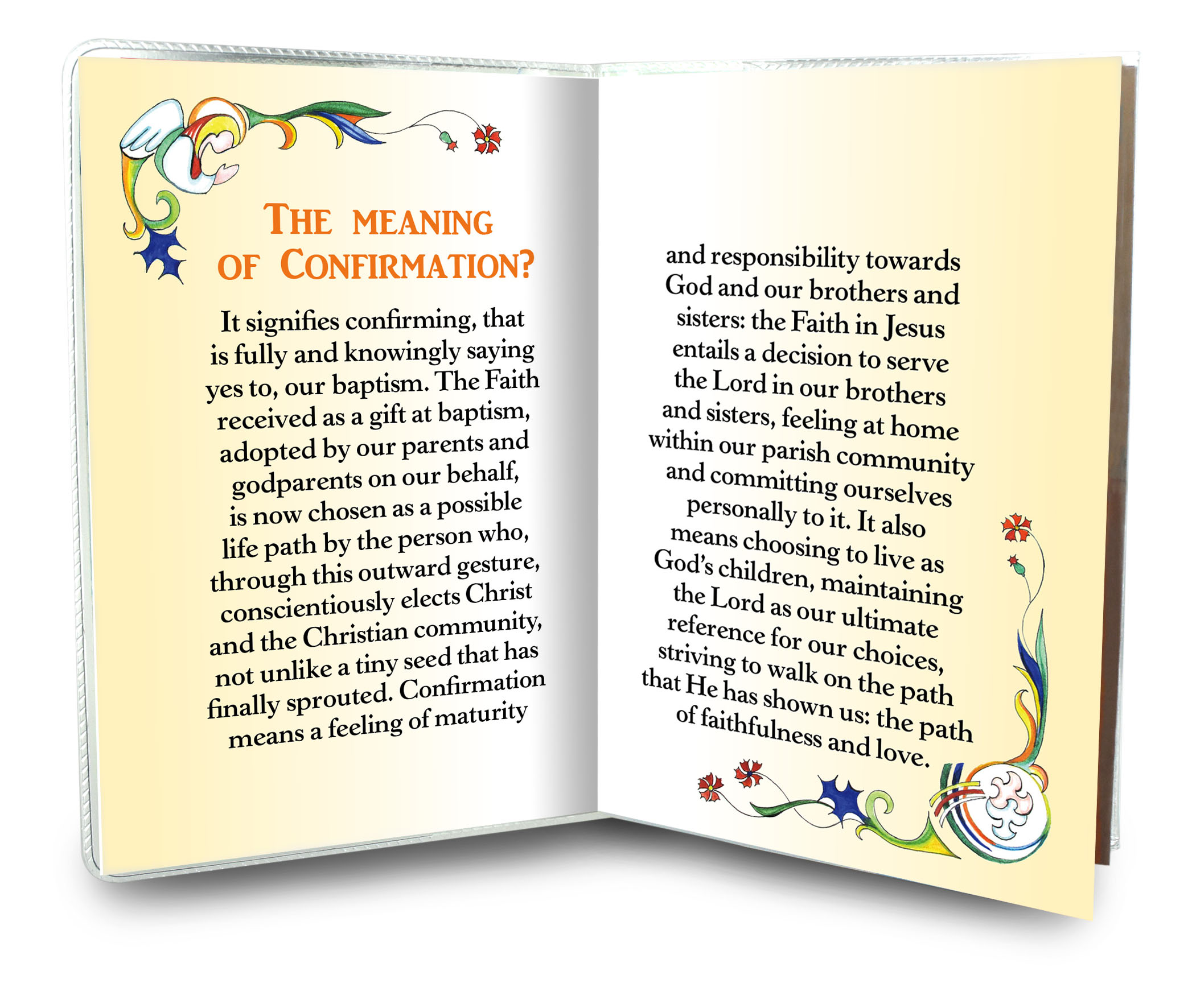 Il libretto ricordo, adatto a cresimandi di lingua inglese, si presenta rivestito da una copertina in plastica trasparente, dotata anche di scomparto in cui è contenuto una catenina con medaglia pendente colorata. Il ciondolo resinato raffigura dei cresimandi che ricevono lo Spirito Santo sotto forma di fiammelle. In copertina viene rappresentata la colomba dello Spirito Santo, da cui discendono i famosi 7 doni (Sapienza, Intelletto, Consiglio, Fortezza, Scienza, Pietà, Timore di Dio), scritti in color oro. Il libretto, al suo interno, spiega il significato del Sacramento della Cresima e riporta la preghiera "Veni Creator".