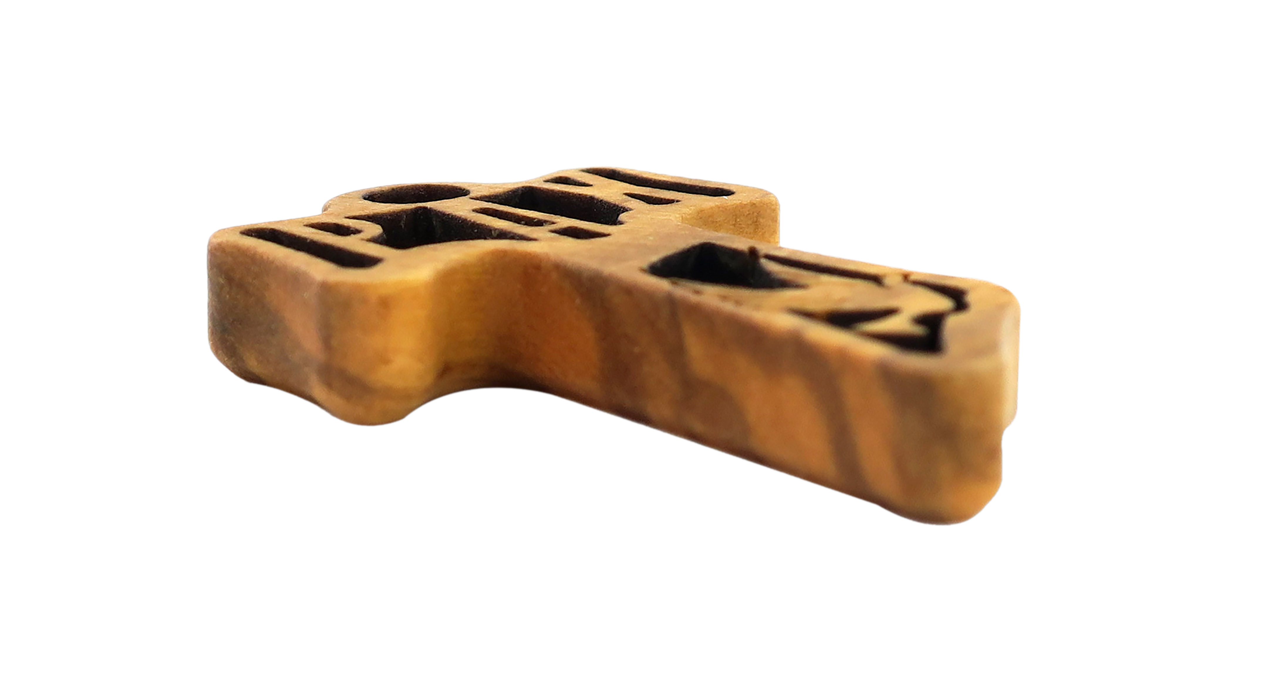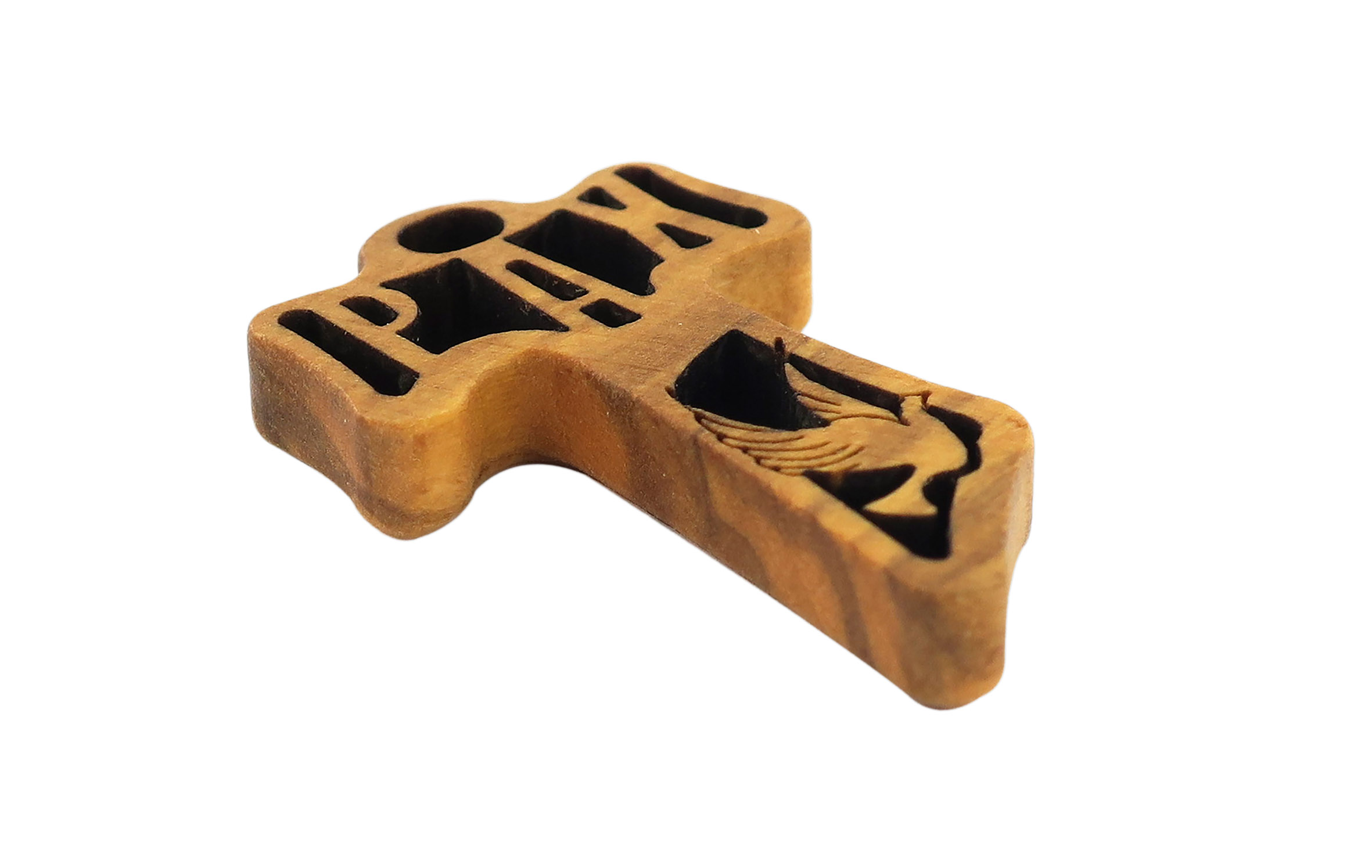 Croce tau in legno di ulivo traforata con i simboli della cresima - 4 cm