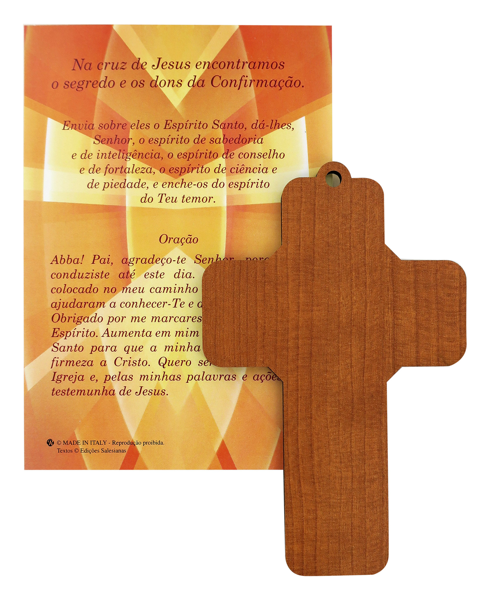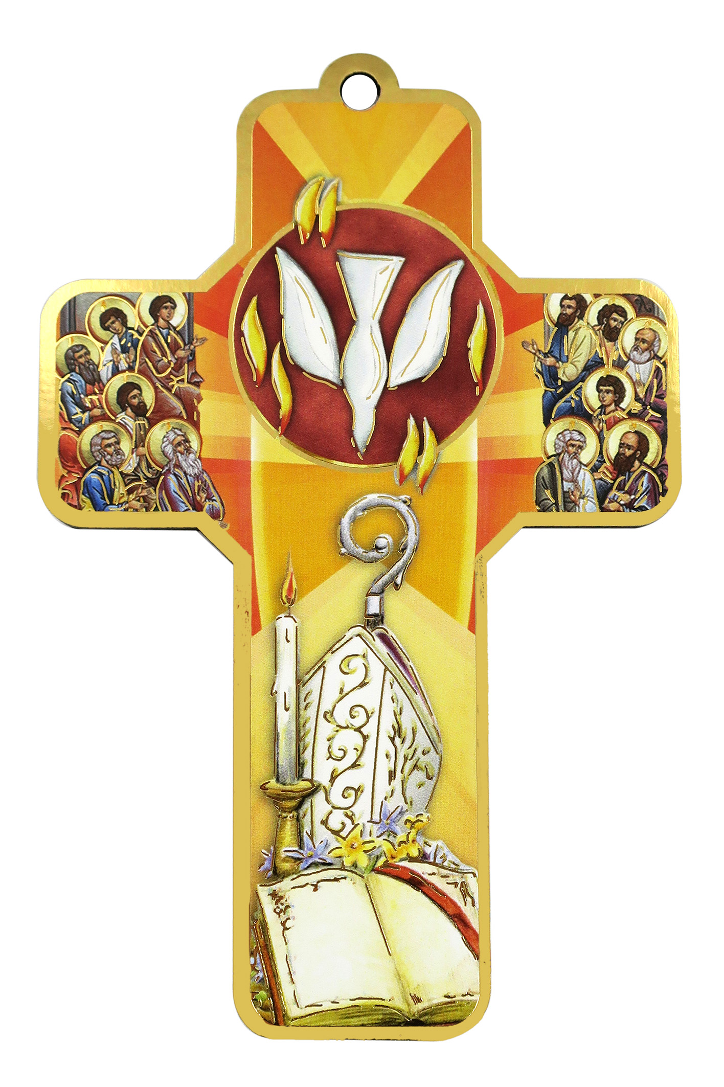 Sulla croce sono raffigurati i simboli della cresima e l'immagine è una stampa con rifiniture in oro a caldo.