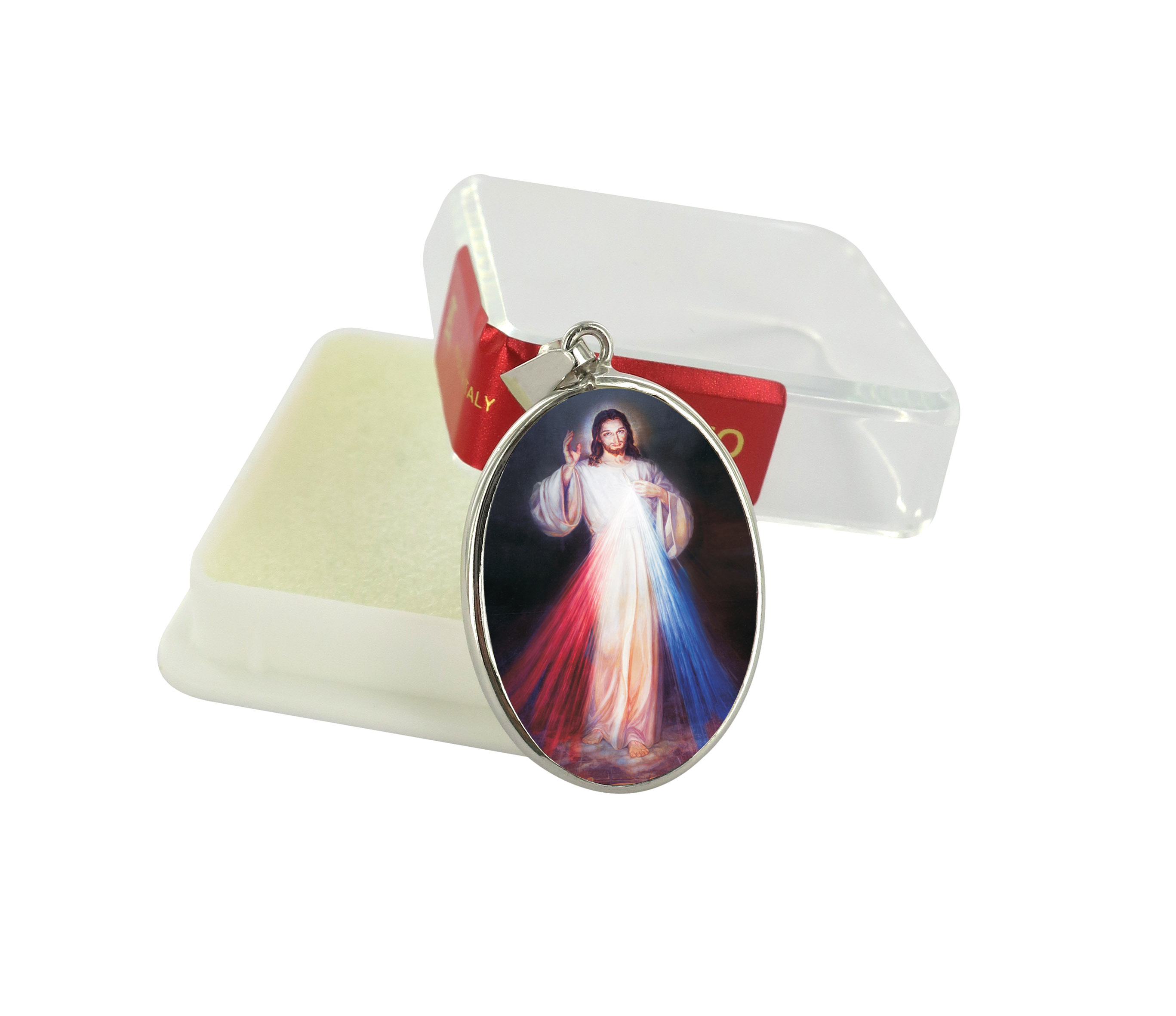 La medaglia è in porcellana con stampata una immagine rappresentante Gesù Misericordioso.
