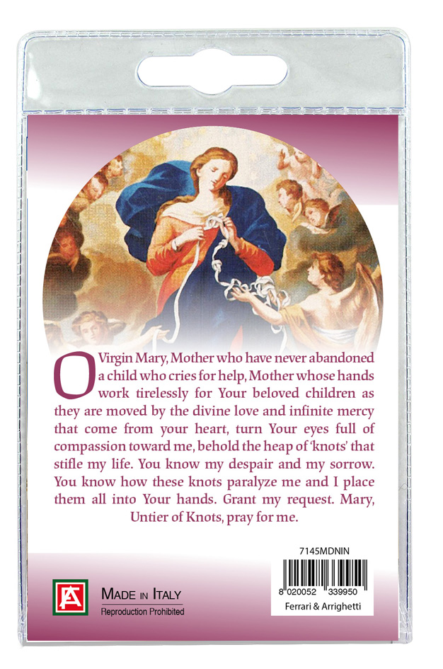 Calamita Maria che scioglie i nodi in metallo nichelato con preghiera in inglese