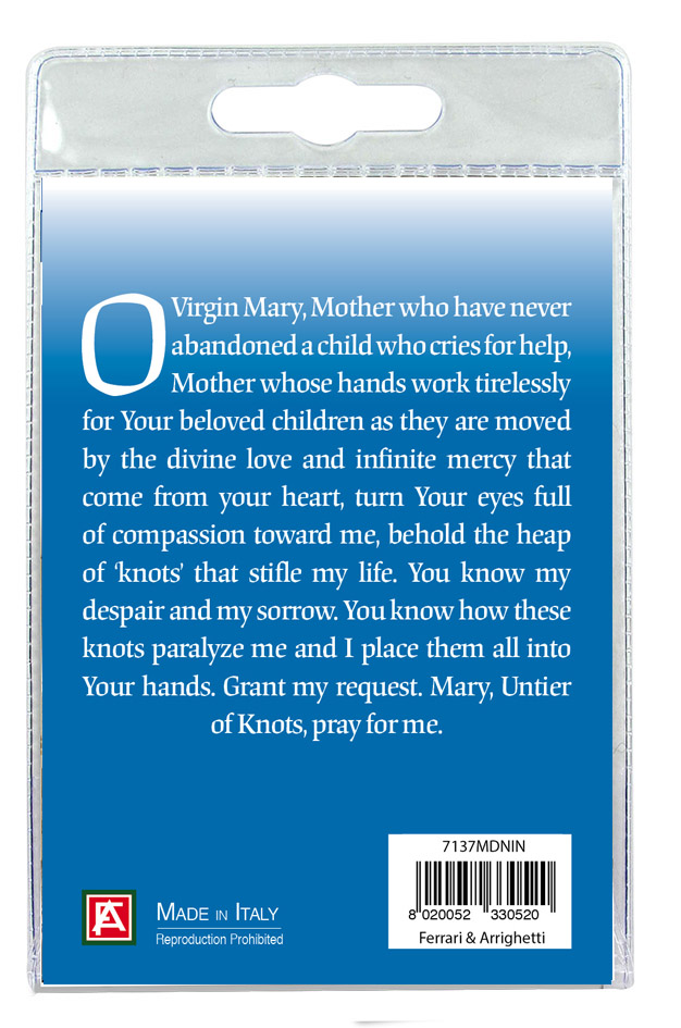 La medaglia, in metallo nichelato, ha un cordino in stoffa e su di essa vi è la resina raffigurante Maria che scioglie i nodi. La medaglia misura 2,5 centimetri e verrà consegnata in un blister. All'interno del blister c'è un cartoncino rappresentante Maria che scioglie i nodi, e sul retro vi è stampata una preghiera dedicata a lei.
